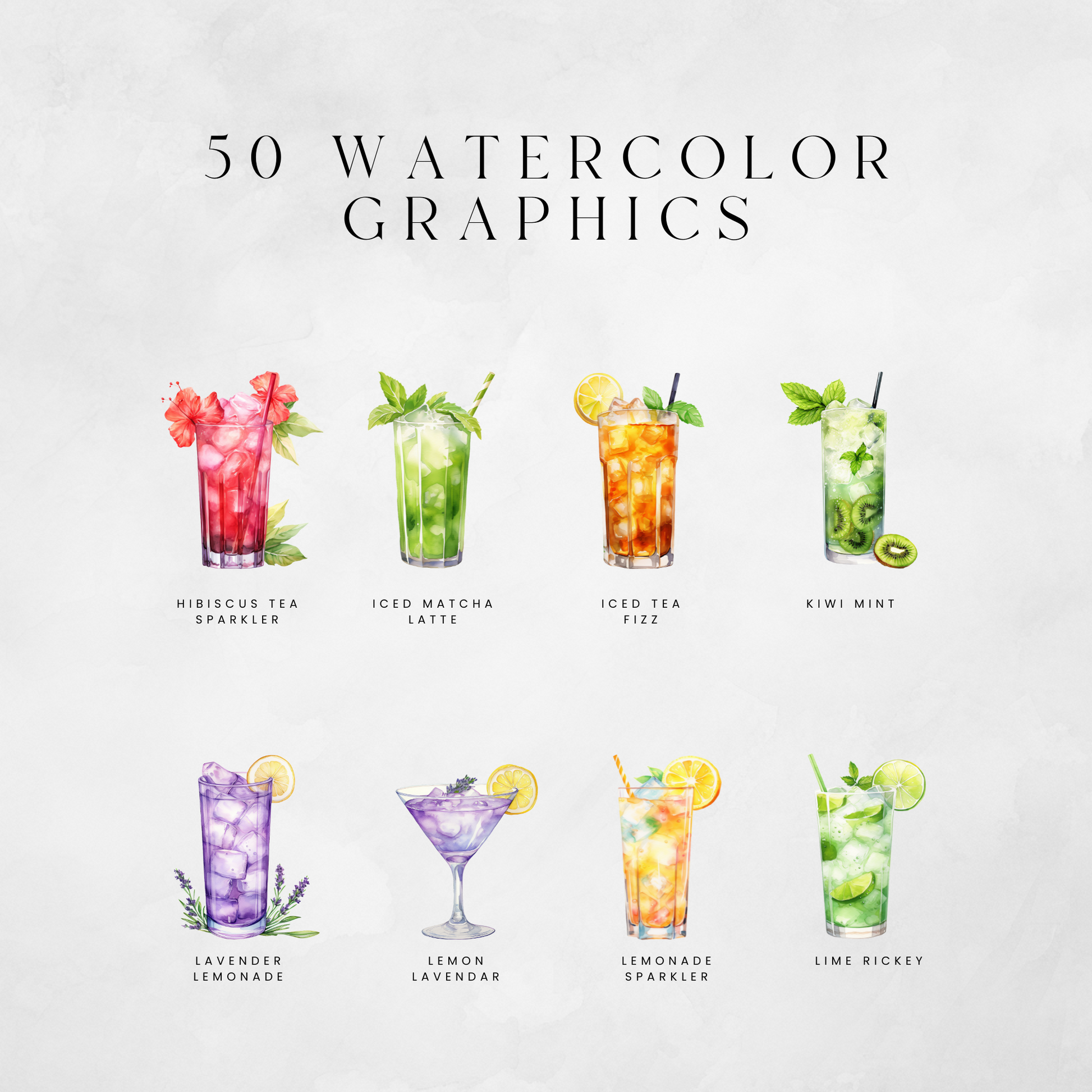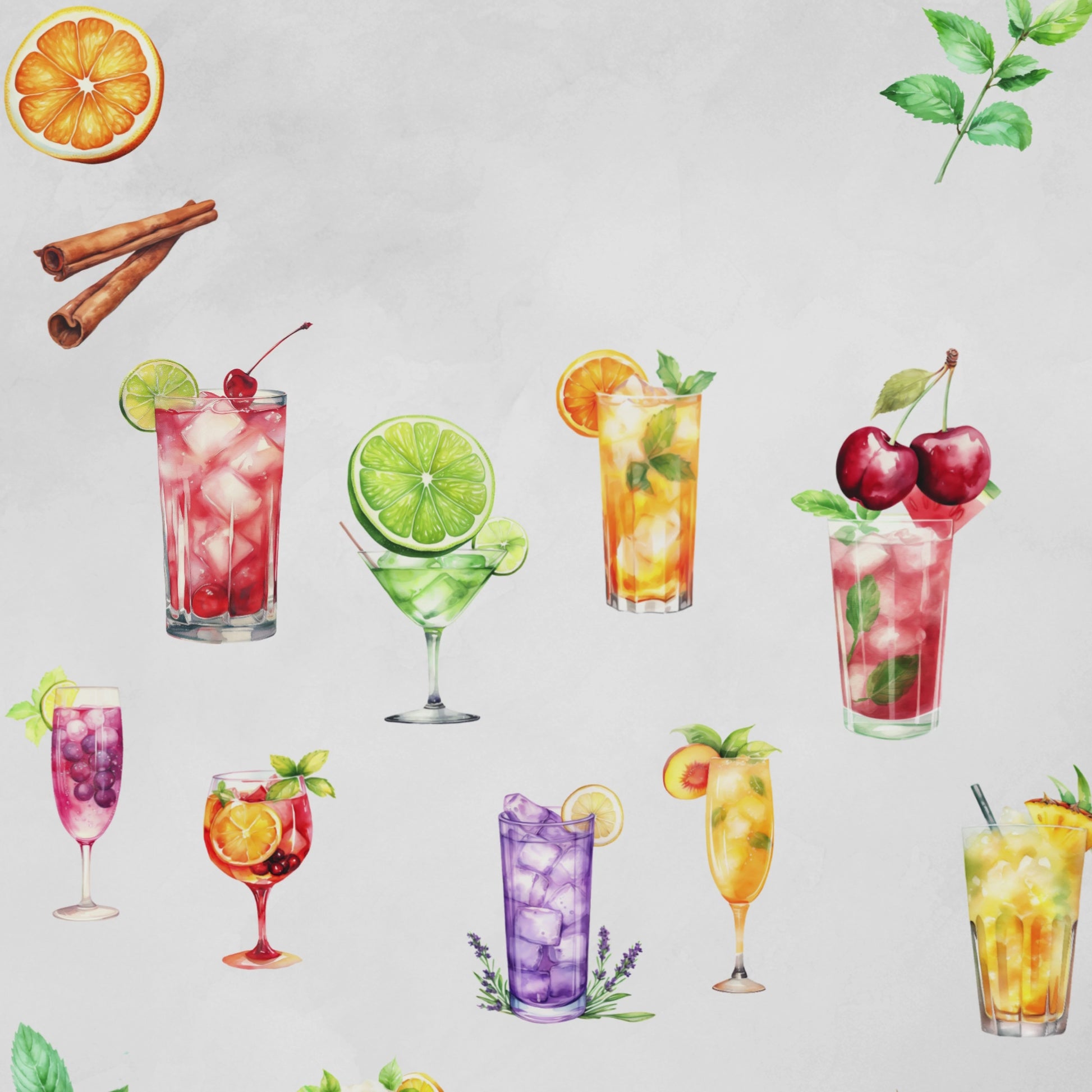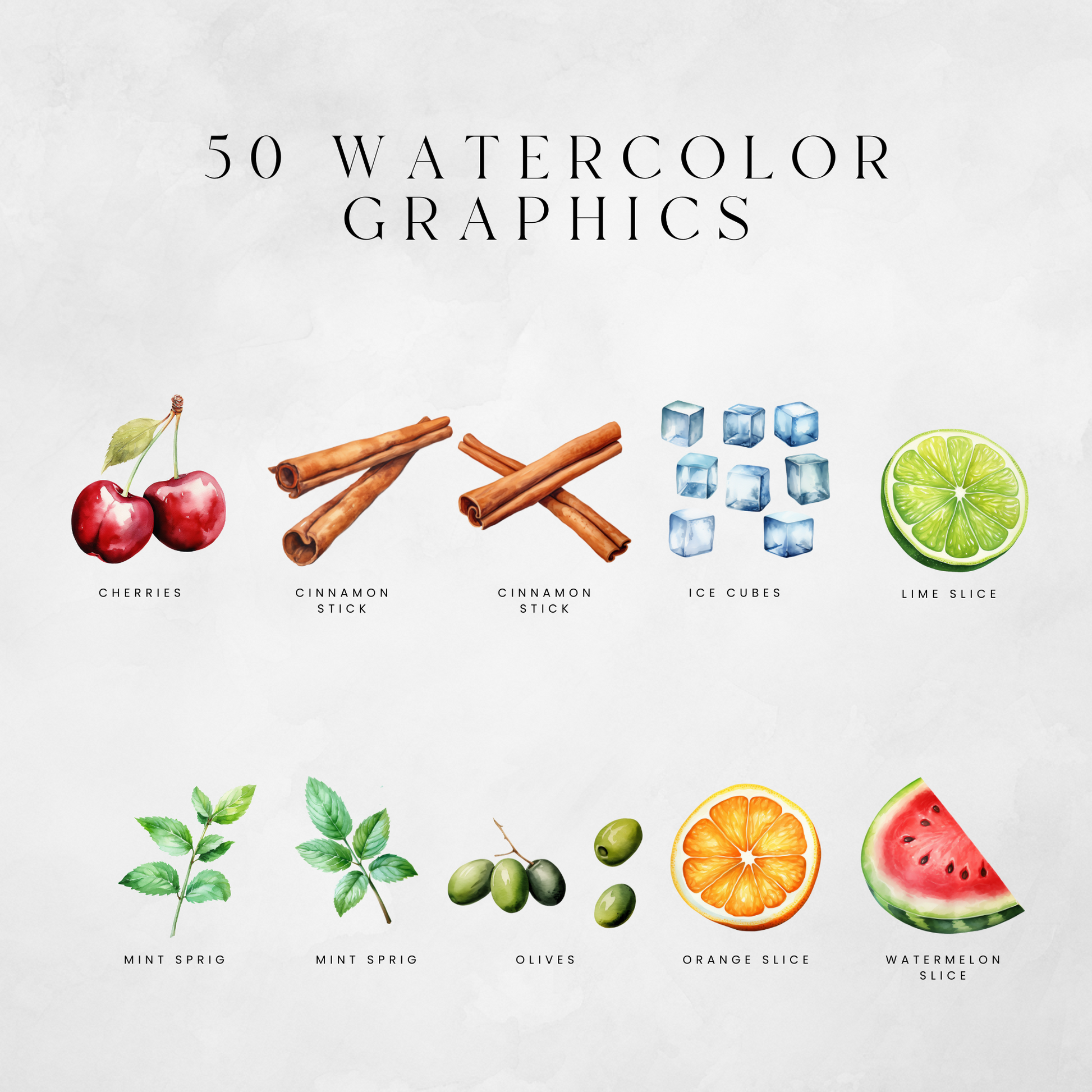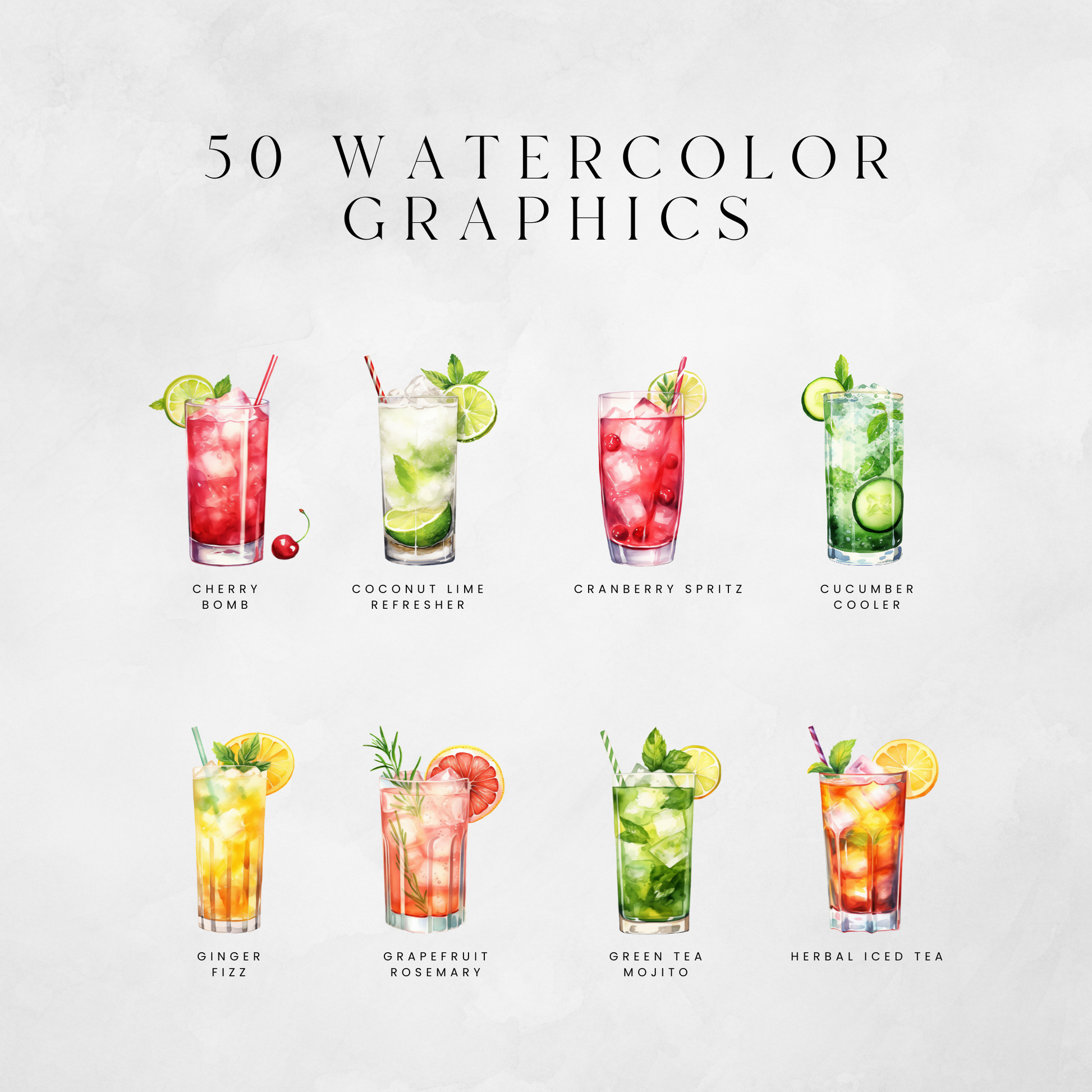 This ππ¨ππ€πππ’π₯π¬ & πππ«π§π’π¬π‘ππ¬ ππ₯π’π©ππ«π ππππ€ consists of 50 transparent PNG images of vibrant watercolor mocktails and garnishes ! These versatile illustrations are perfect for both personal and commercial projects such as invitations, posters and social media graphics. These high-quality images are also great for showcasing your favorite signature cocktails or creating a festive beverage menu!