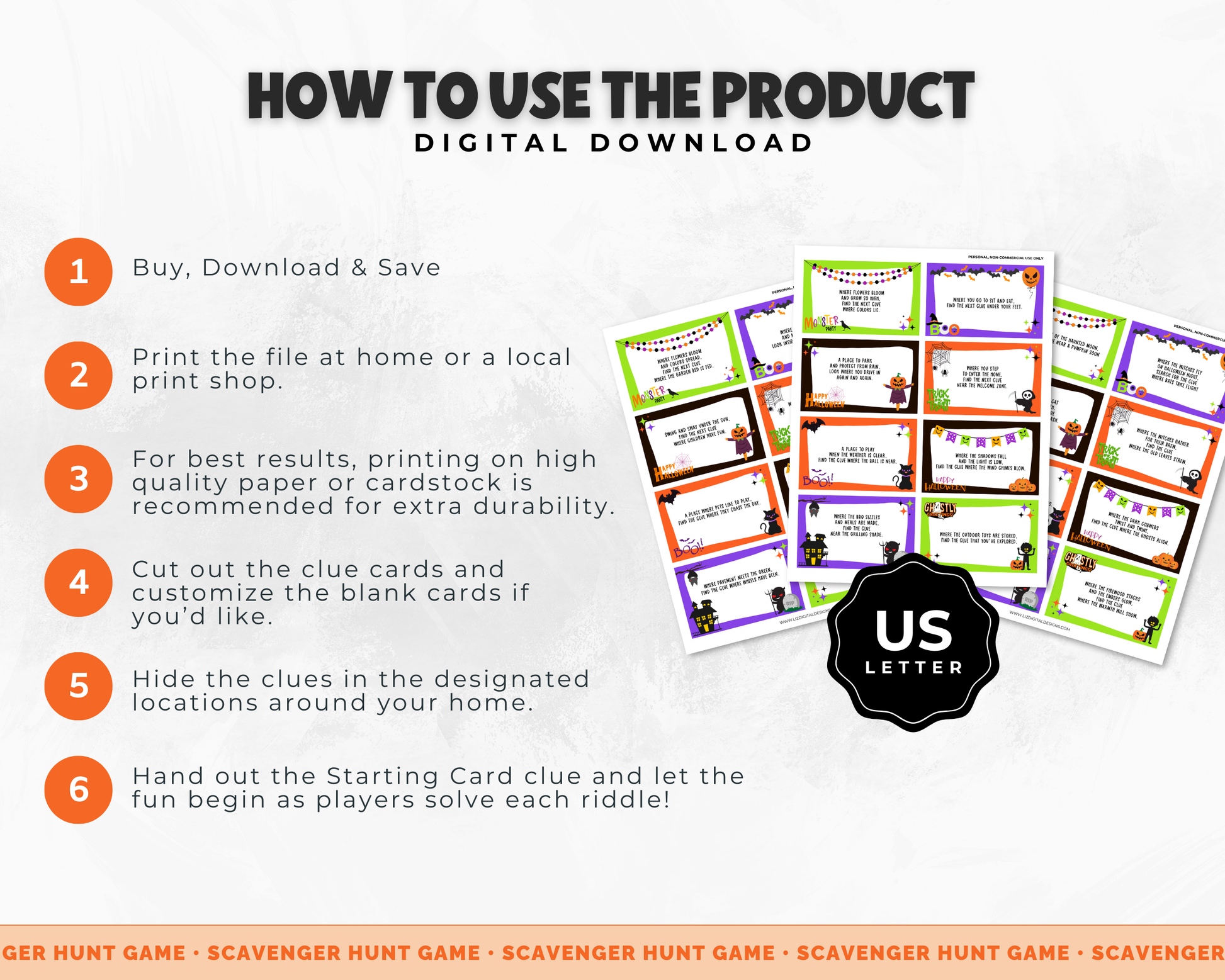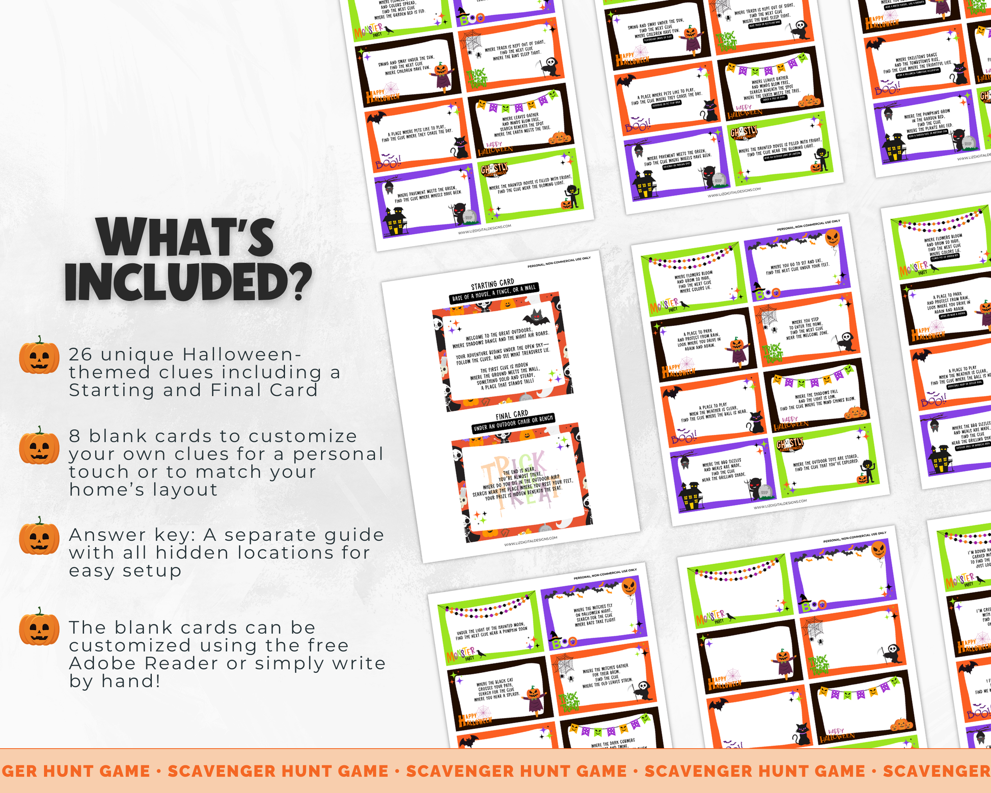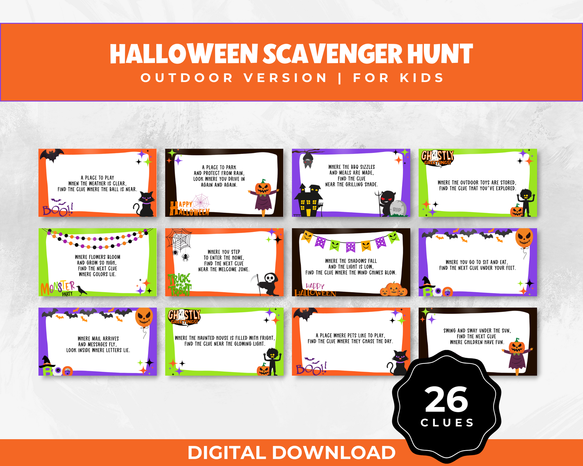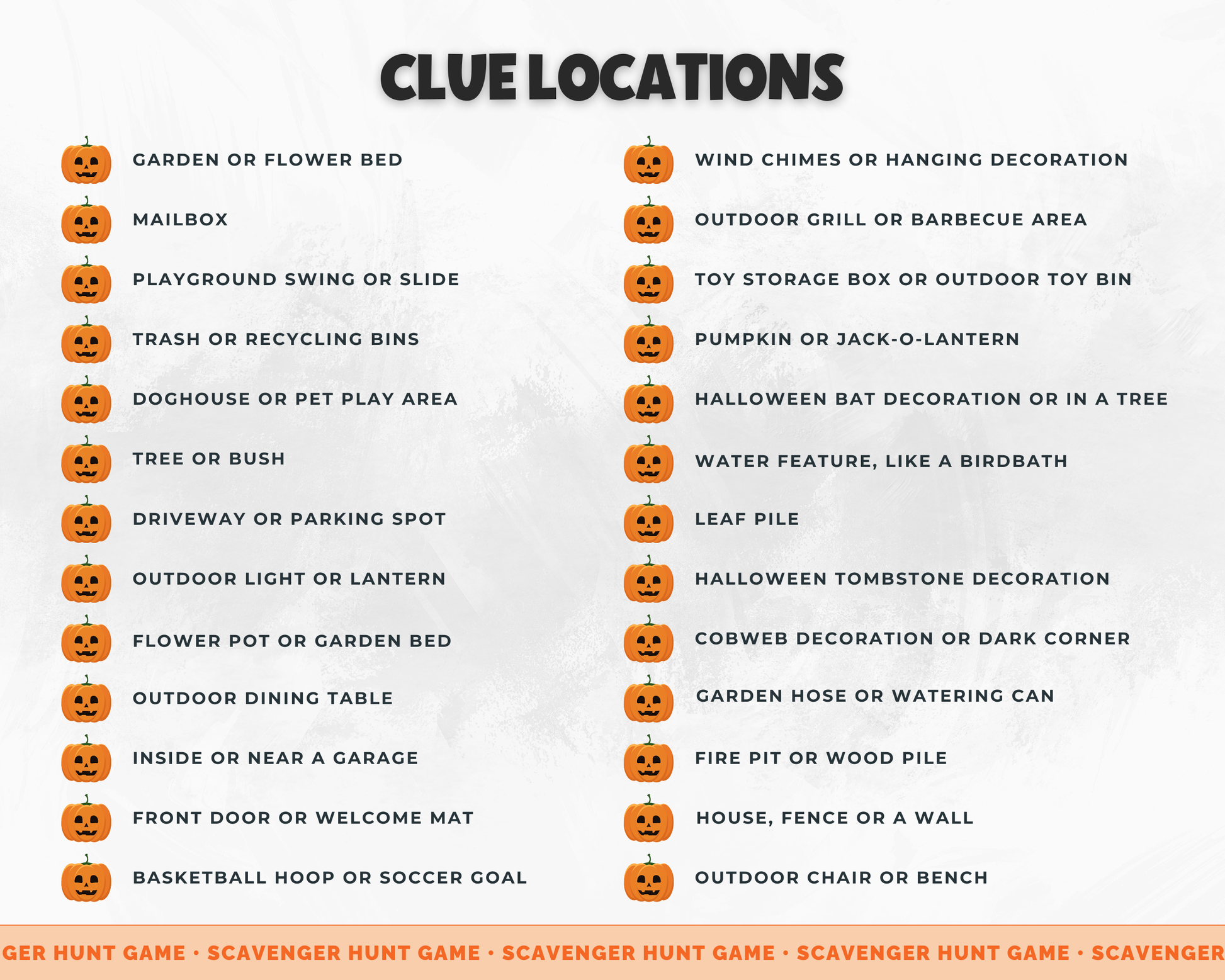 π 26 Clue Cards: 26 unique Halloween-themed clues, including a starting card and a final card to guide the hunt from beginning to end