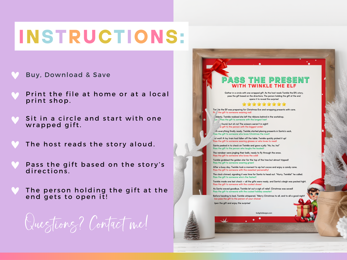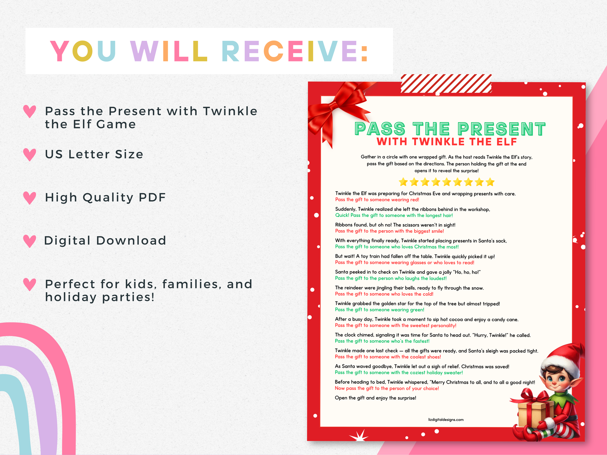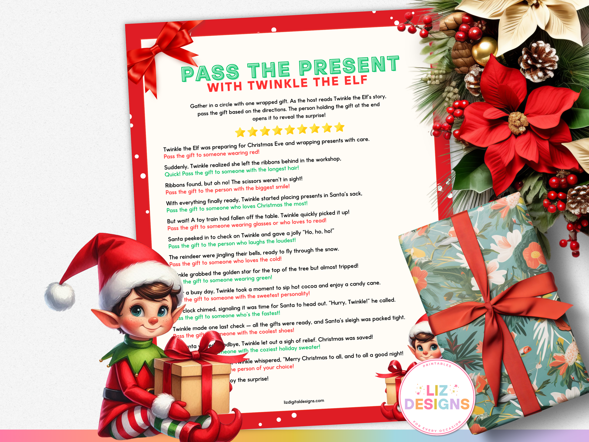 The ππππ πππ πππππππ ππππ ππππ πππππππ πππ πππ is perfect for family gatherings, Christmas parties, or gift exchanges! This printable Christmas game brings festive fun to your holiday season. Players will pass the gift around based on a fun and quirky story featuring Twinkle the Elfβguaranteed to keep everyone laughing and engaged! Ideal for group play, this Christmas Gift Game is a great choice for Holiday Party Games and Gift Swap Games!