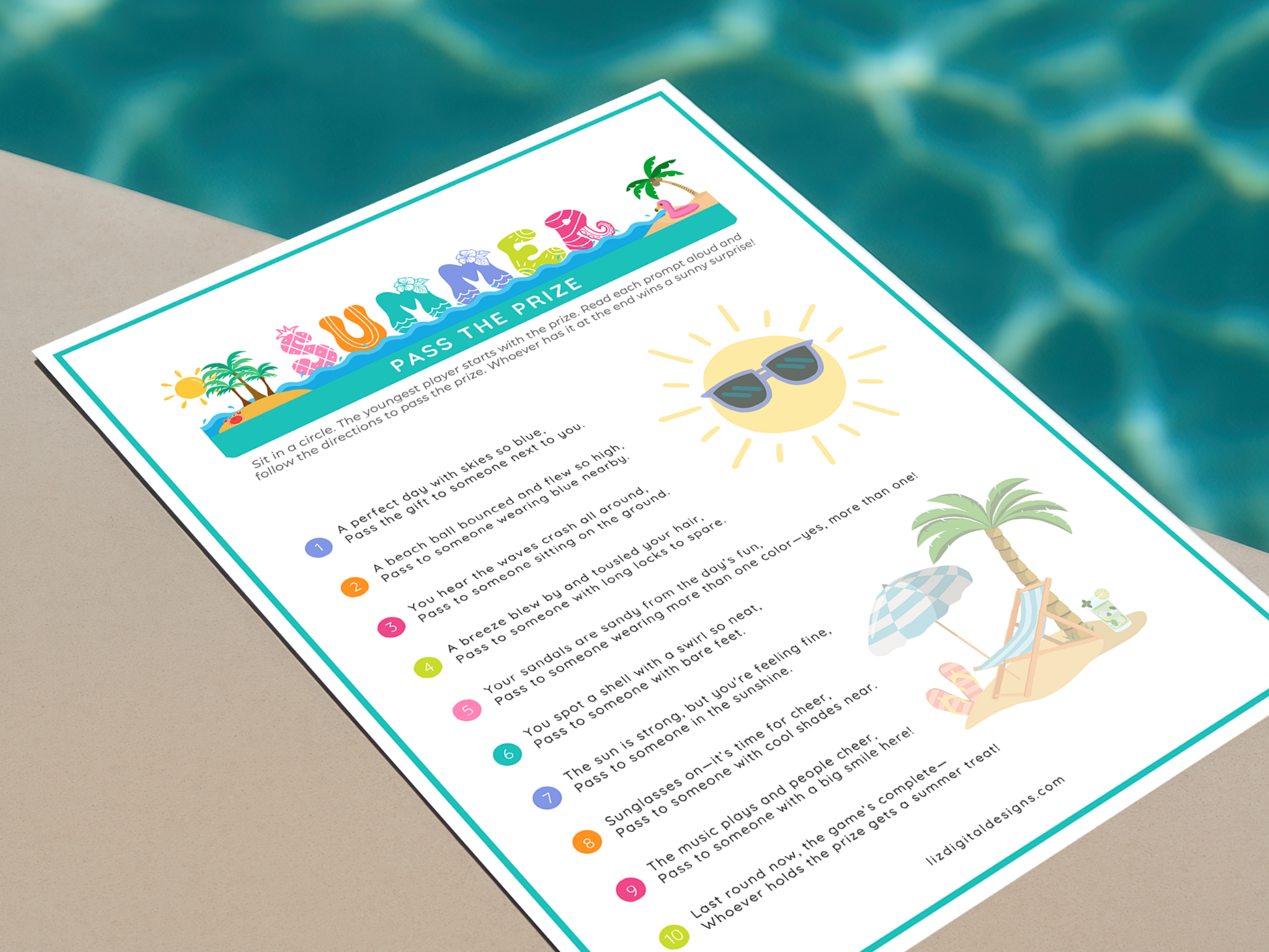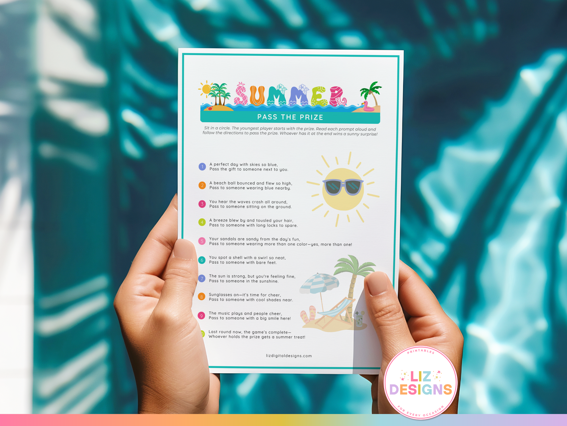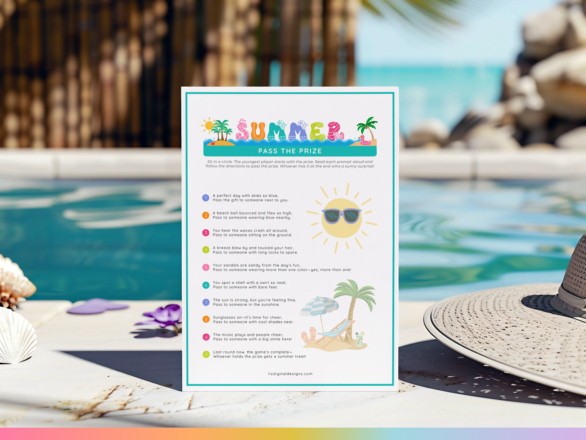 Get the laughter flowing and the gifts moving with this ๐๐๐๐๐๐ ๐๐๐๐ ๐๐๐ ๐๐๐๐๐ ๐๐๐๐! This interactive, rhyming game is the perfect way to hand out prizes or favors at your next summer bash. Guests pass the gift around based on playful prompts in the story. Great for all ages and guaranteed to get everyone smiling! Whether you call it a Pass the Gift Poem, Pass the Present, Prize Rhyme Game, or Pass the Parcel, this printable brings easy fun to any gathering. It's perfect for BBQs, beach parties, reunions, bachelorette weekends, and more!