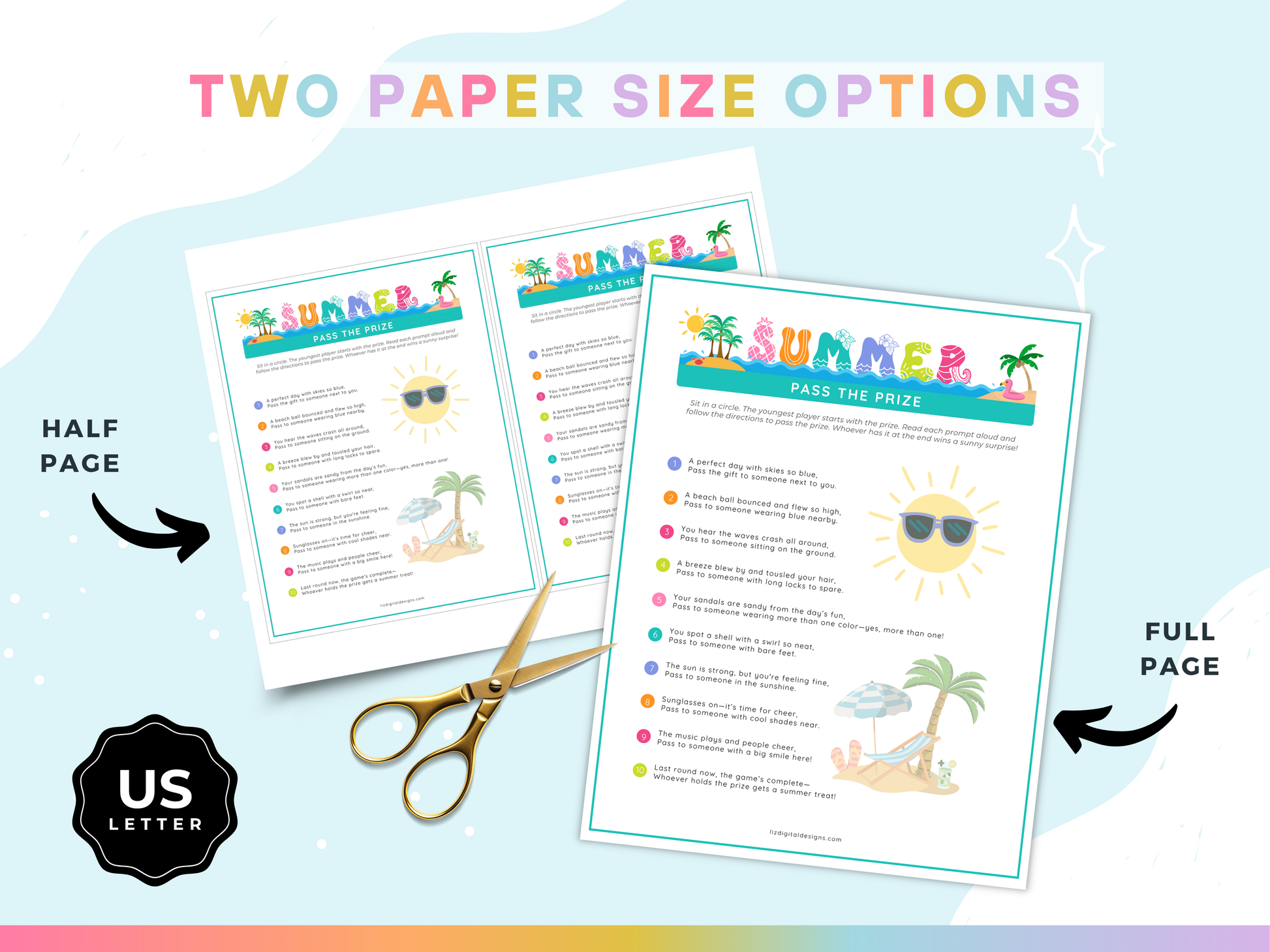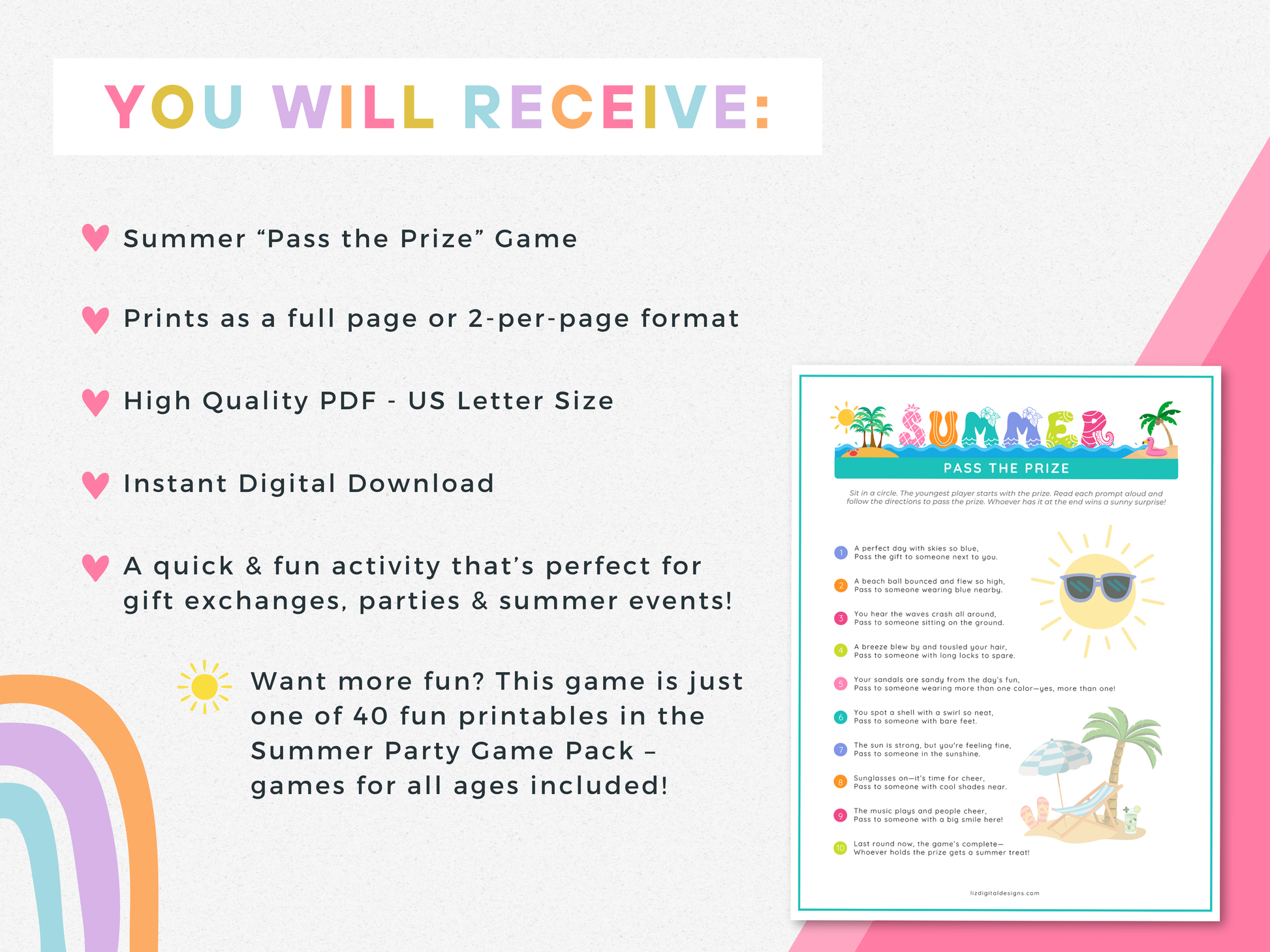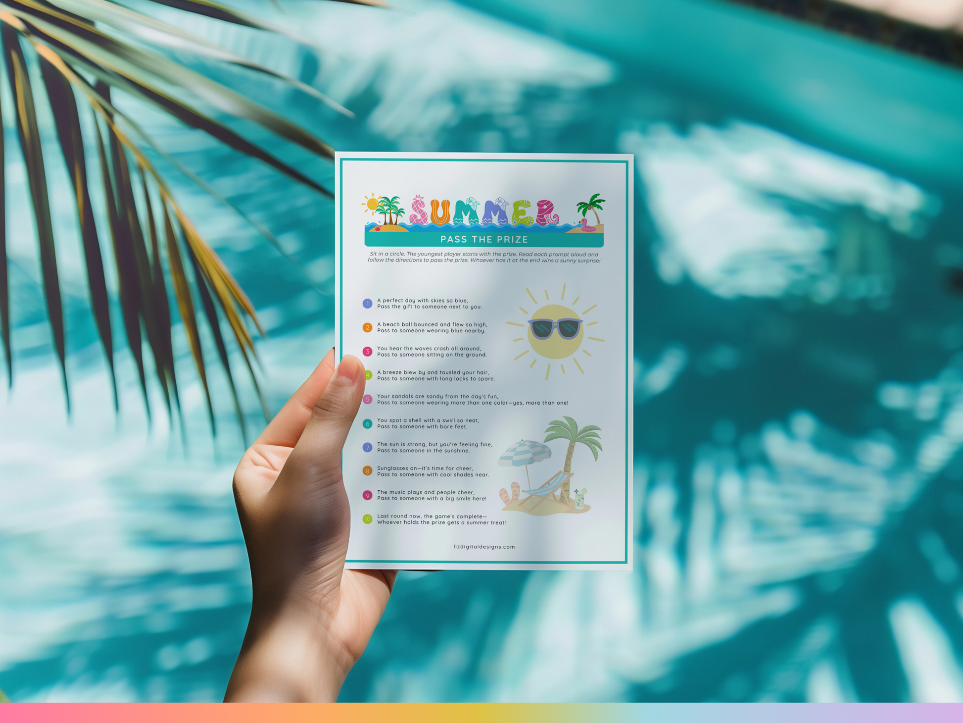 Get the laughter flowing and the gifts moving with this ๐๐๐๐๐๐ ๐๐๐๐ ๐๐๐ ๐๐๐๐๐ ๐๐๐๐! This interactive, rhyming game is the perfect way to hand out prizes or favors at your next summer bash. Guests pass the gift around based on playful prompts in the story. Great for all ages and guaranteed to get everyone smiling! Whether you call it a Pass the Gift Poem, Pass the Present, Prize Rhyme Game, or Pass the Parcel, this printable brings easy fun to any gathering. It's perfect for BBQs, beach parties, reunions, bachelorette weekends, and more!