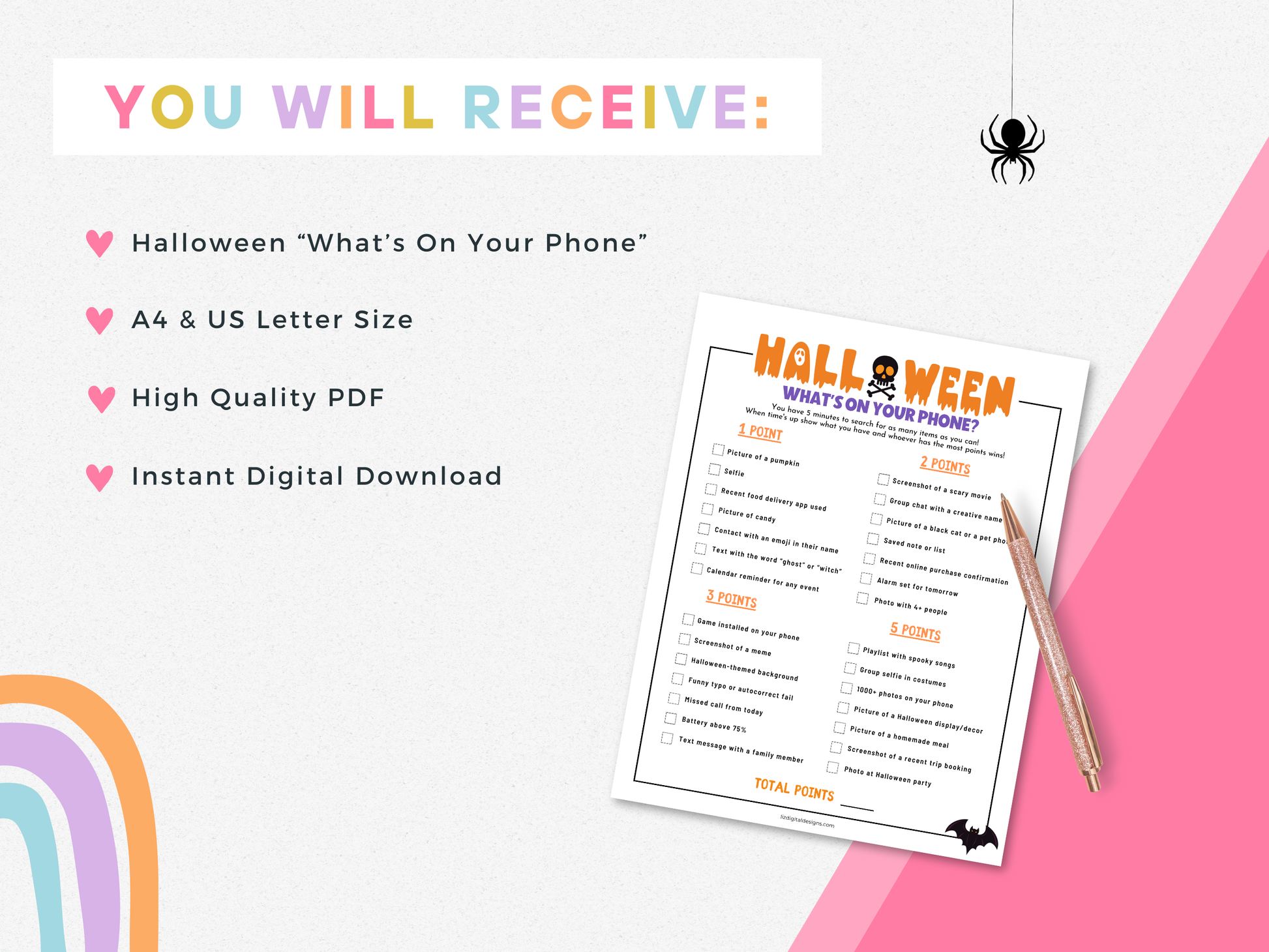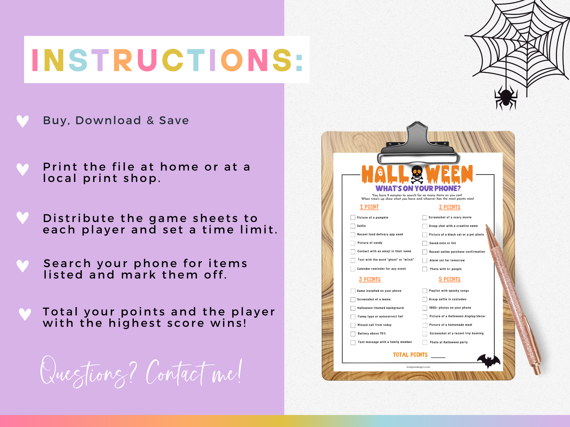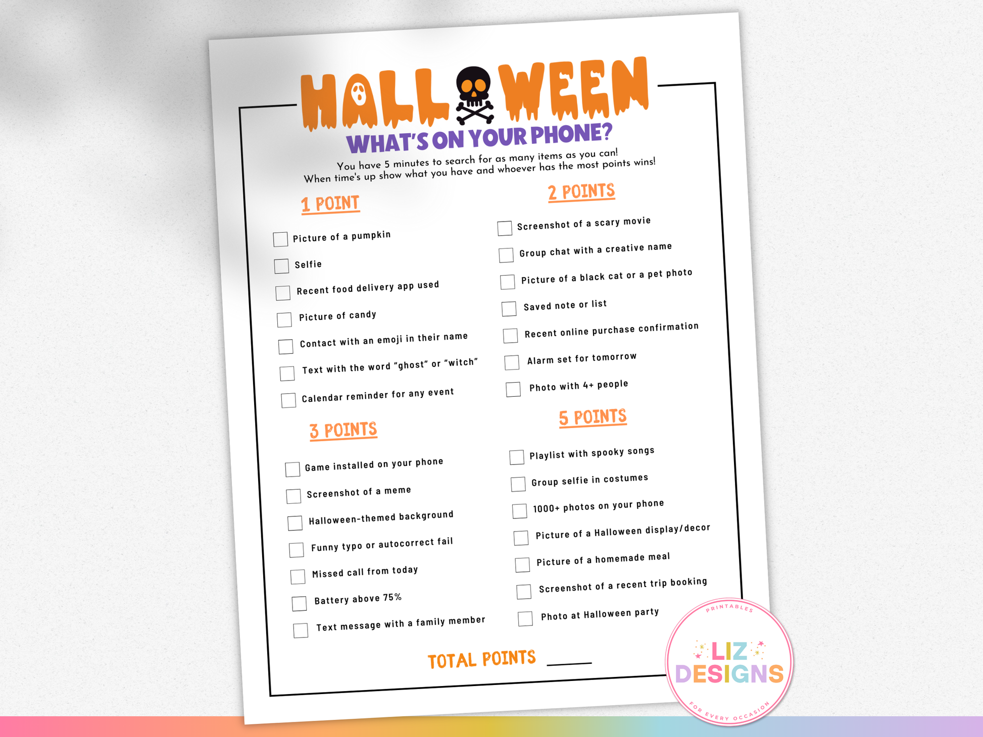 Get ready for spooky fun with this πππππππππ ππππ'π ππ ππππ πππππ ππππ! Perfect for Halloween parties, game nights, or gatherings with friends and family. This fun and easy party game is designed for adults and teens to enjoy as they search their phones for Halloween and everyday items. The player with the most points wins!