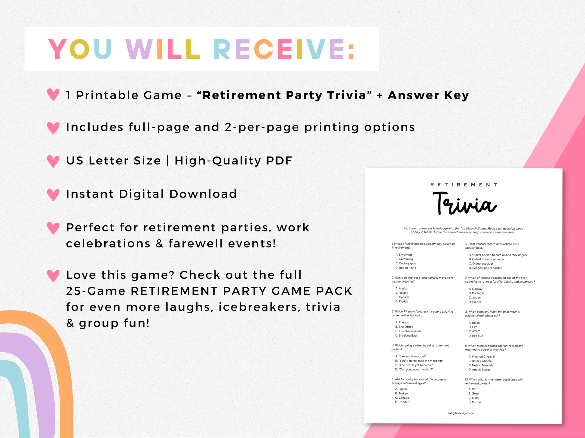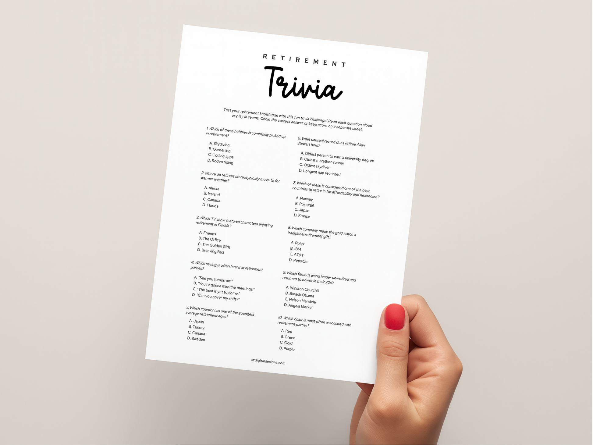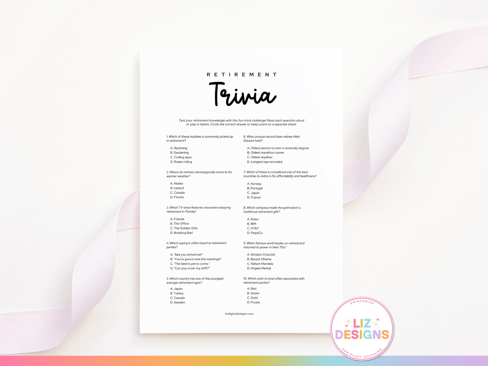 Celebrate the amazing retiree with this fun and easy-to-play ππππππππππ ππππππ game! A perfect printable for office parties, farewell lunches, and retirement celebrations! This lighthearted trivia challenge features fun facts and surprising retirement-related questions that guests will love guessing!