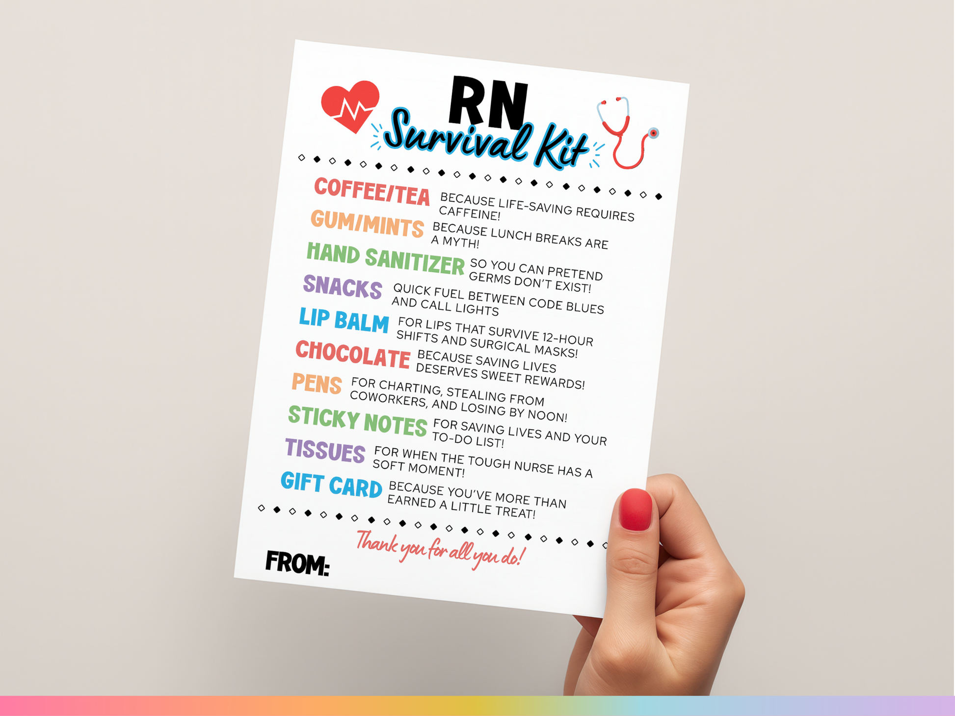Perfect for National Nurses Week, staff appreciation events, or βjust because,β this printable survival kit tag pairs perfectly with small goodies like coffee, snacks, gum, and hand sanitizer. A simple gesture with a big impact for the everyday heroes in scrubs.