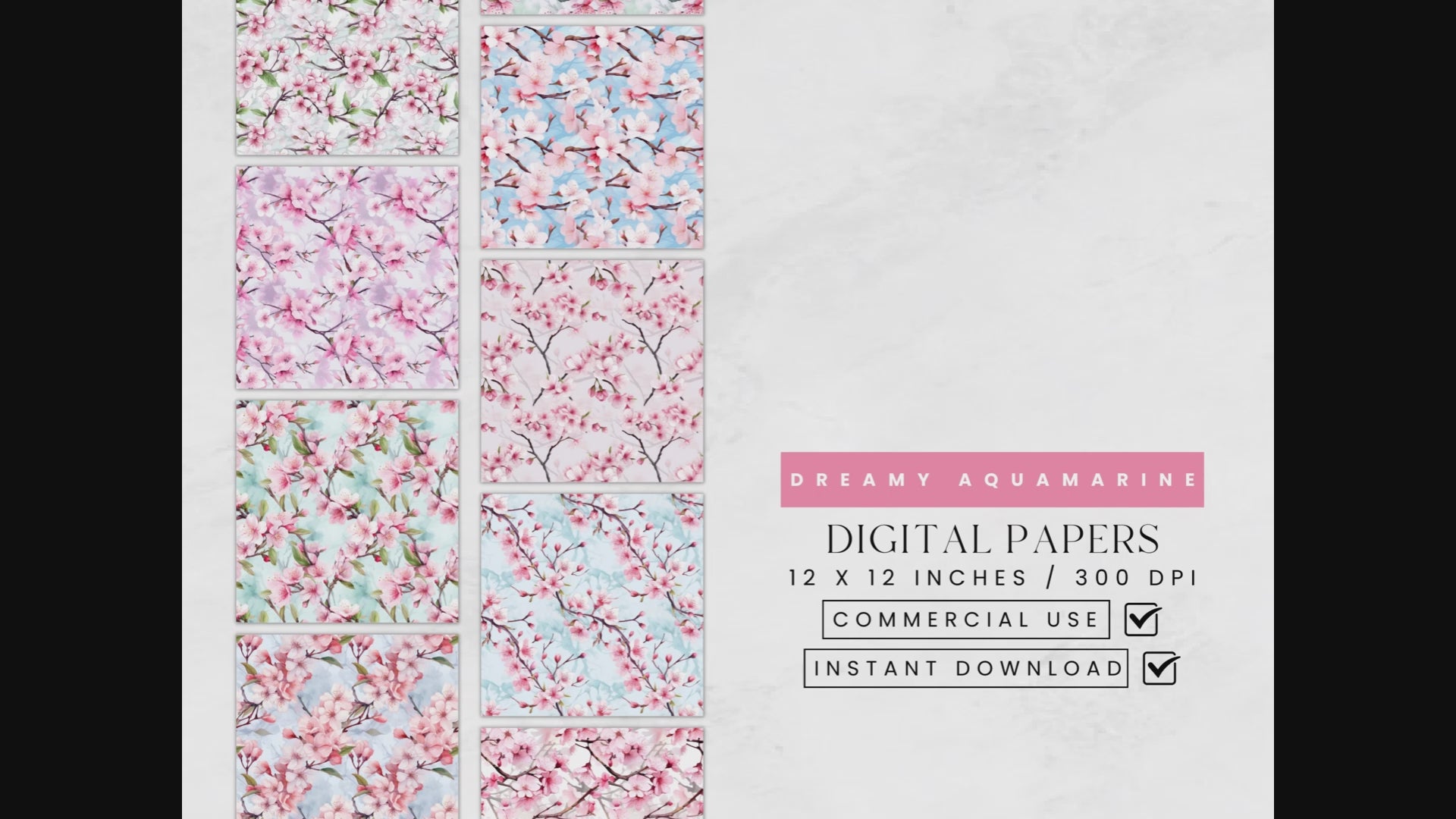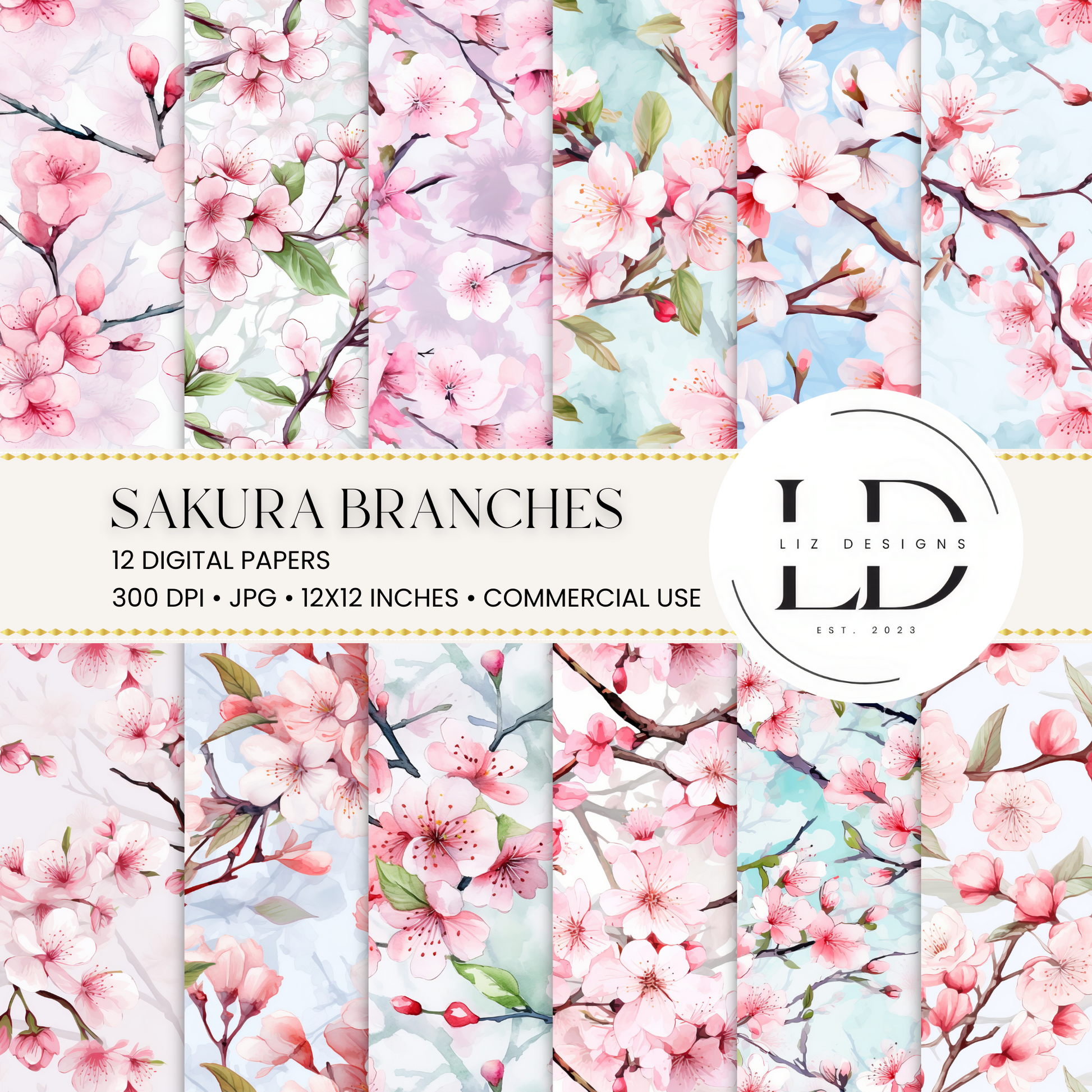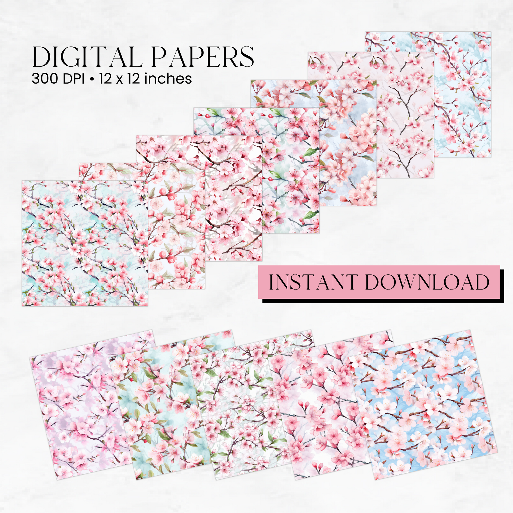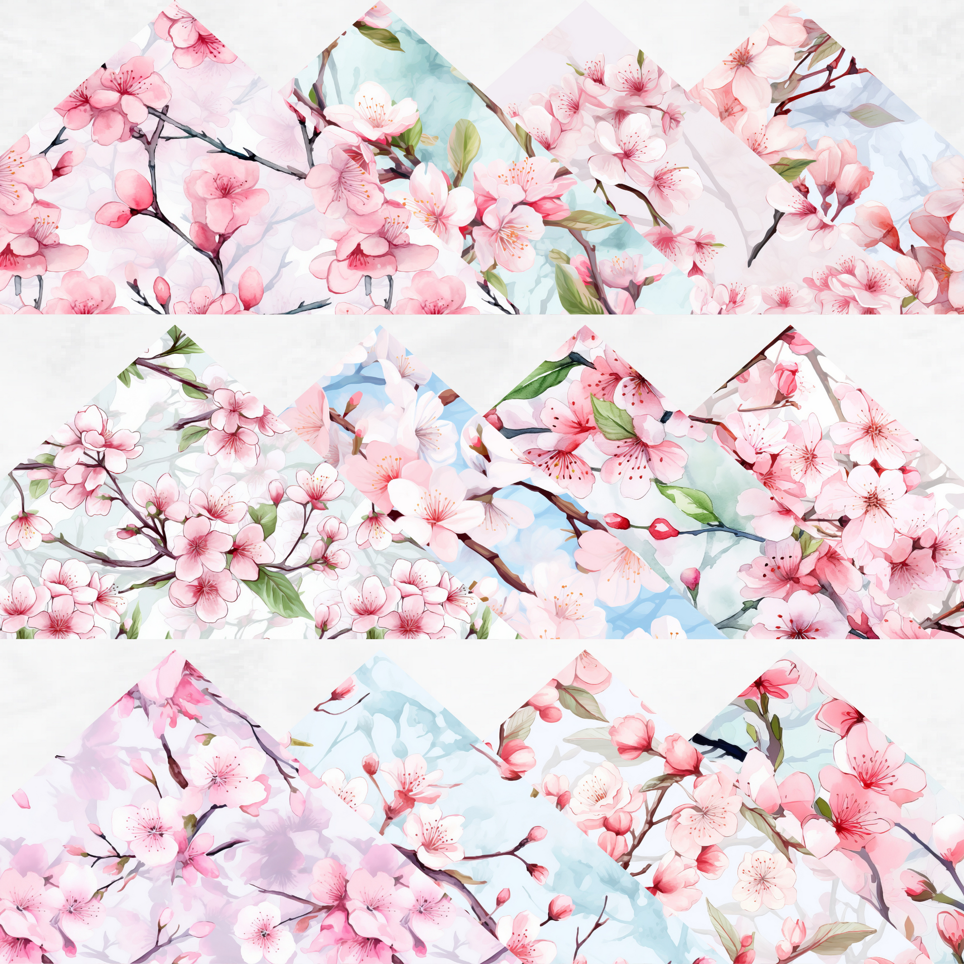 This is a beautiful set of 12 seamless Sakura Branches digital papers. Each image measures 12" x 12" at 300 DPI resolution. The papers are beautiful and versatile floral patterns. Perfect for scrapbooking, digital backgrounds, invitations, journals, planners, bookmarks, beautiful wall art, greeting cards, logo and branding elements, engaging social media graphics and so much more!