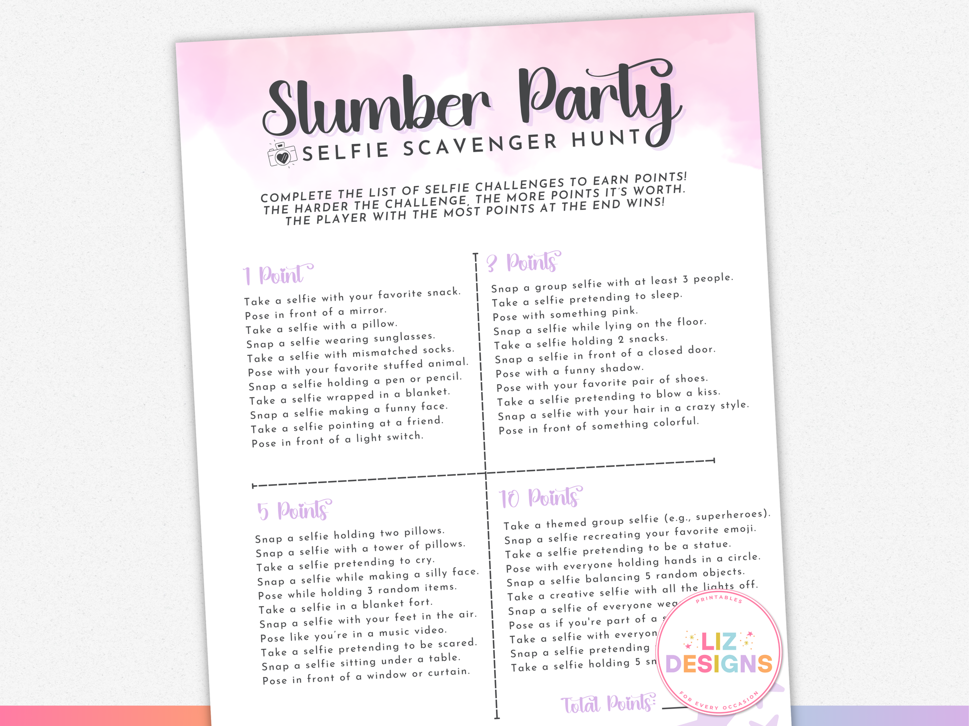 Check out the πππππππ πππππ ππππ ππππ, which includes this selfie scavenger hunt and ππ ππππ’ππ’π¨π§ππ₯ π ππ¦ππ¬ for endless fun! Perfect for creating the ultimate sleepover experience.Β