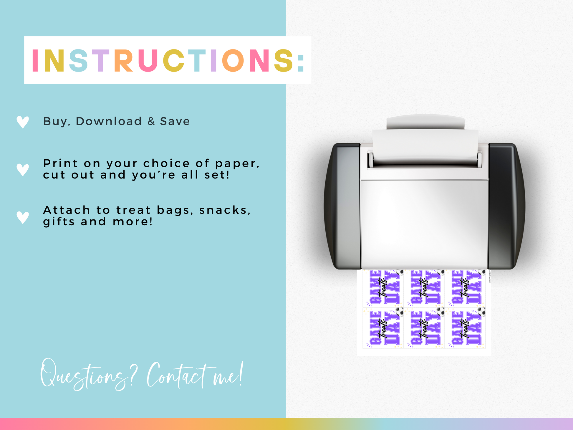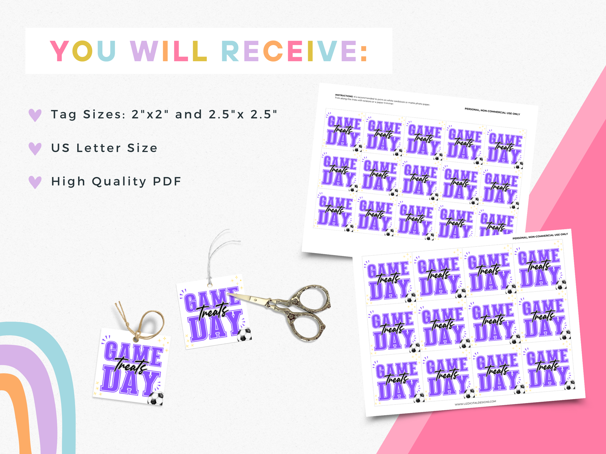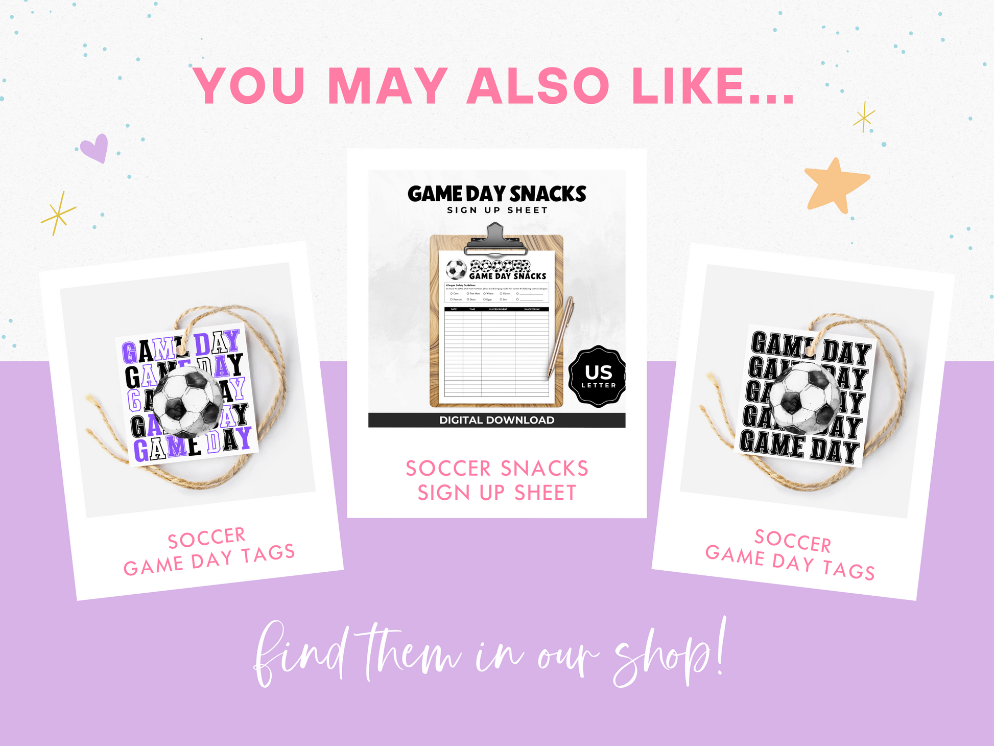 These ππππππ ππππ πππ πππππ ππππ are ideal for soccer games and parties, tailgates, sports-themed events, or as a special Good Luck Gift Tag for your favorite sports team. Featuring a vibrant purple and black soccer design and the phrase "Game Day Treats," these Soccer Treat Tags add excitement and spirit to any gathering. Theyβre perfect as Team Snack Tags and Game Day Favor Tags!
