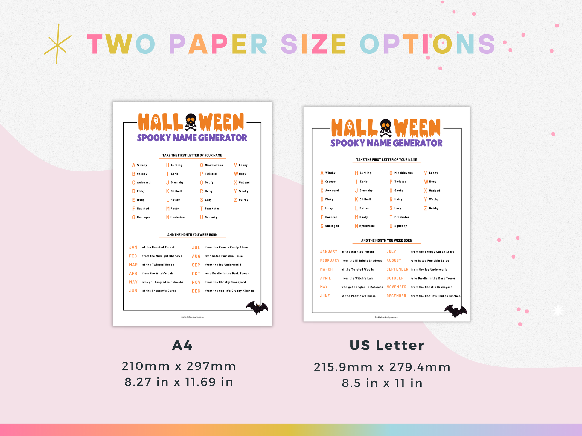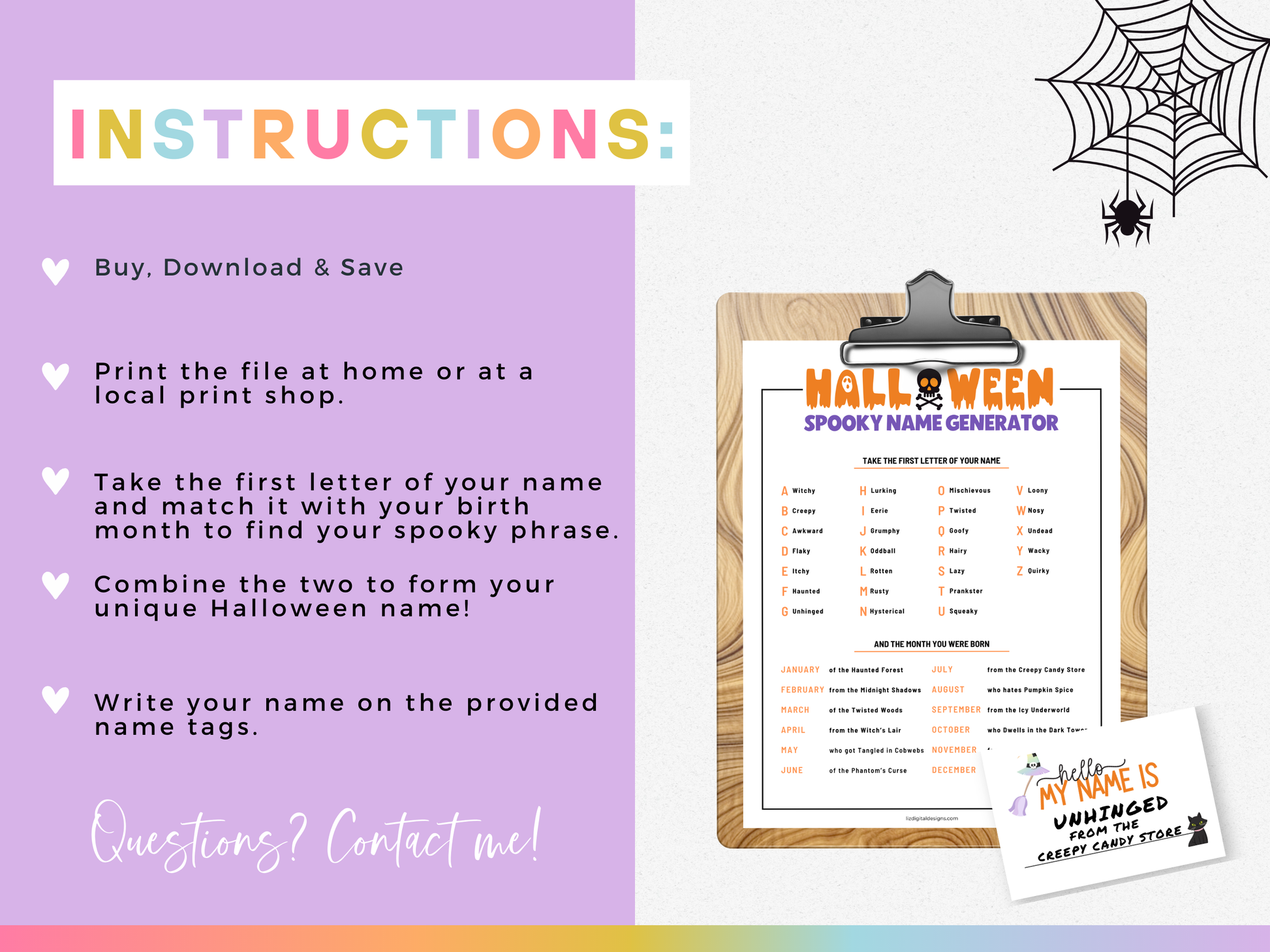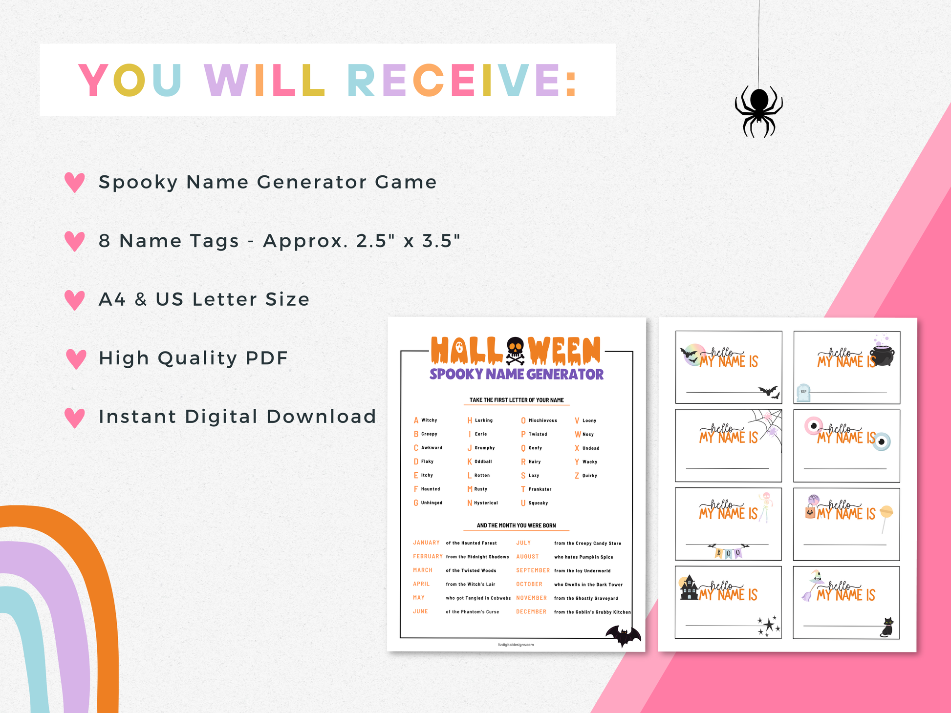 Bring some Halloween fun to your event with the πππππππππ ππππππ ππππ πππππππππ! Perfect for parties, family gatherings, or classrooms, this game lets players create their own unique Halloween names by combining the first letter of their name with their birth month. The game comes with printable name tags, so everyone can proudly wear their spooky new identity!