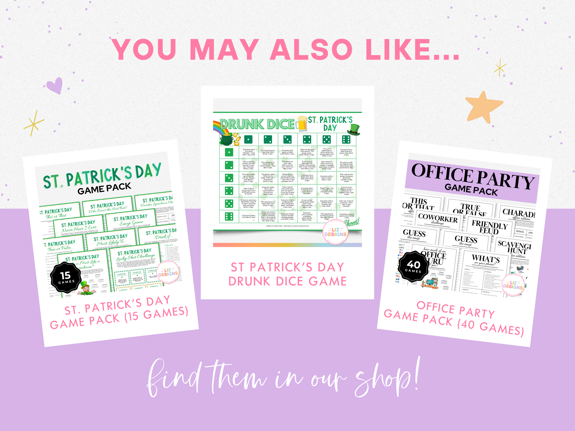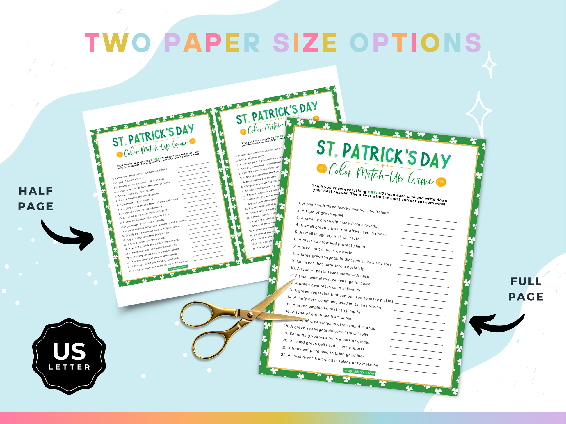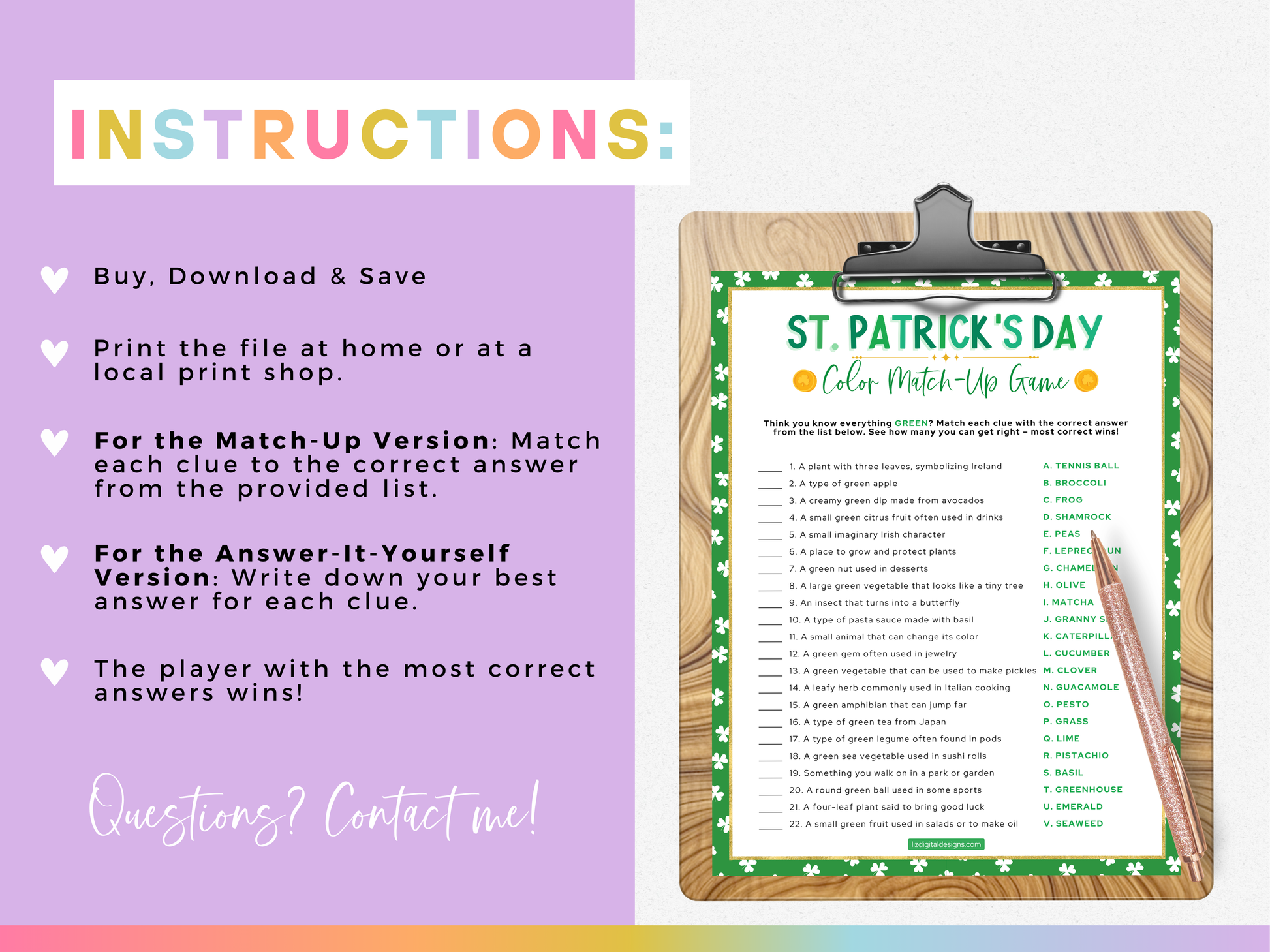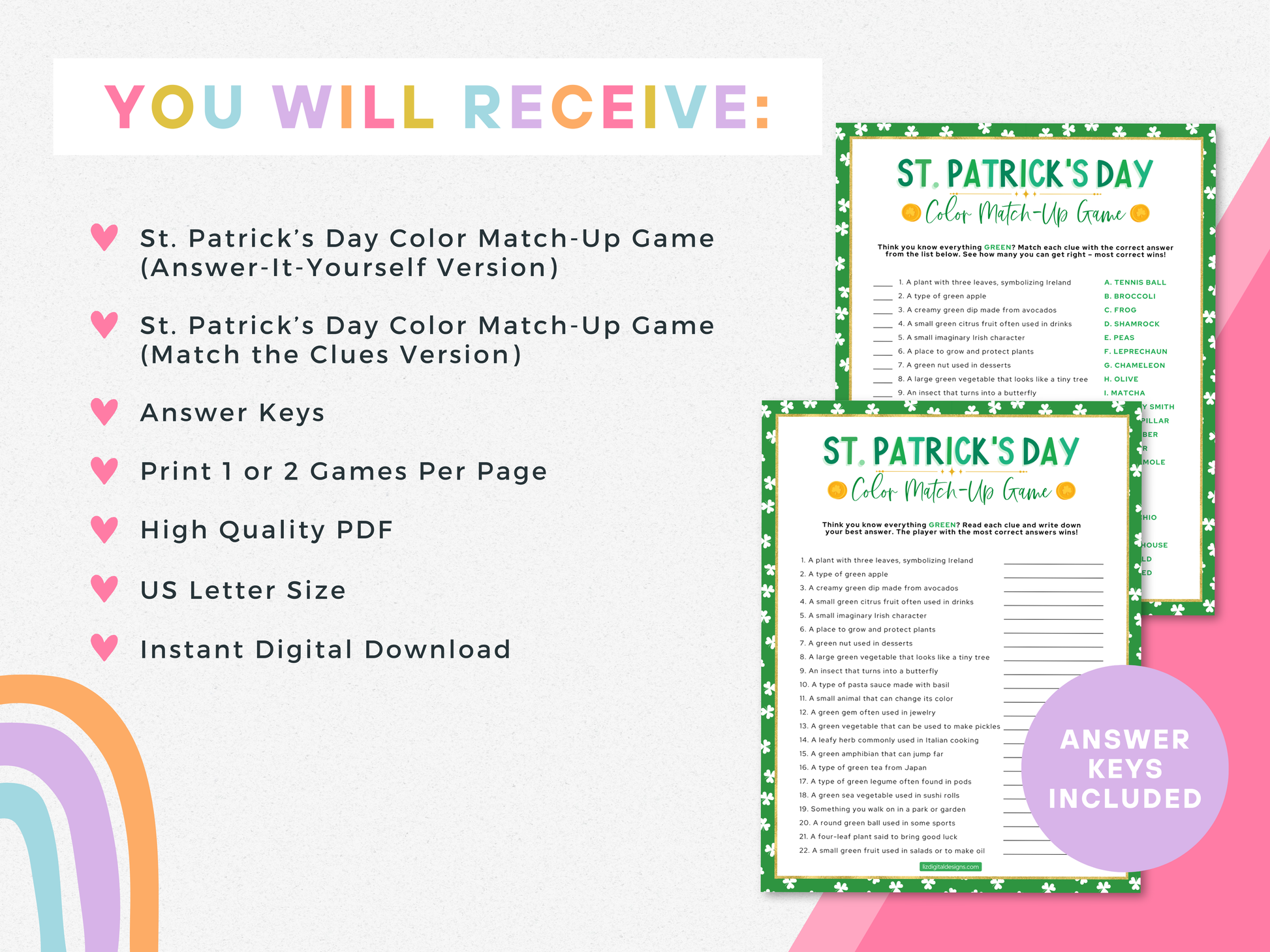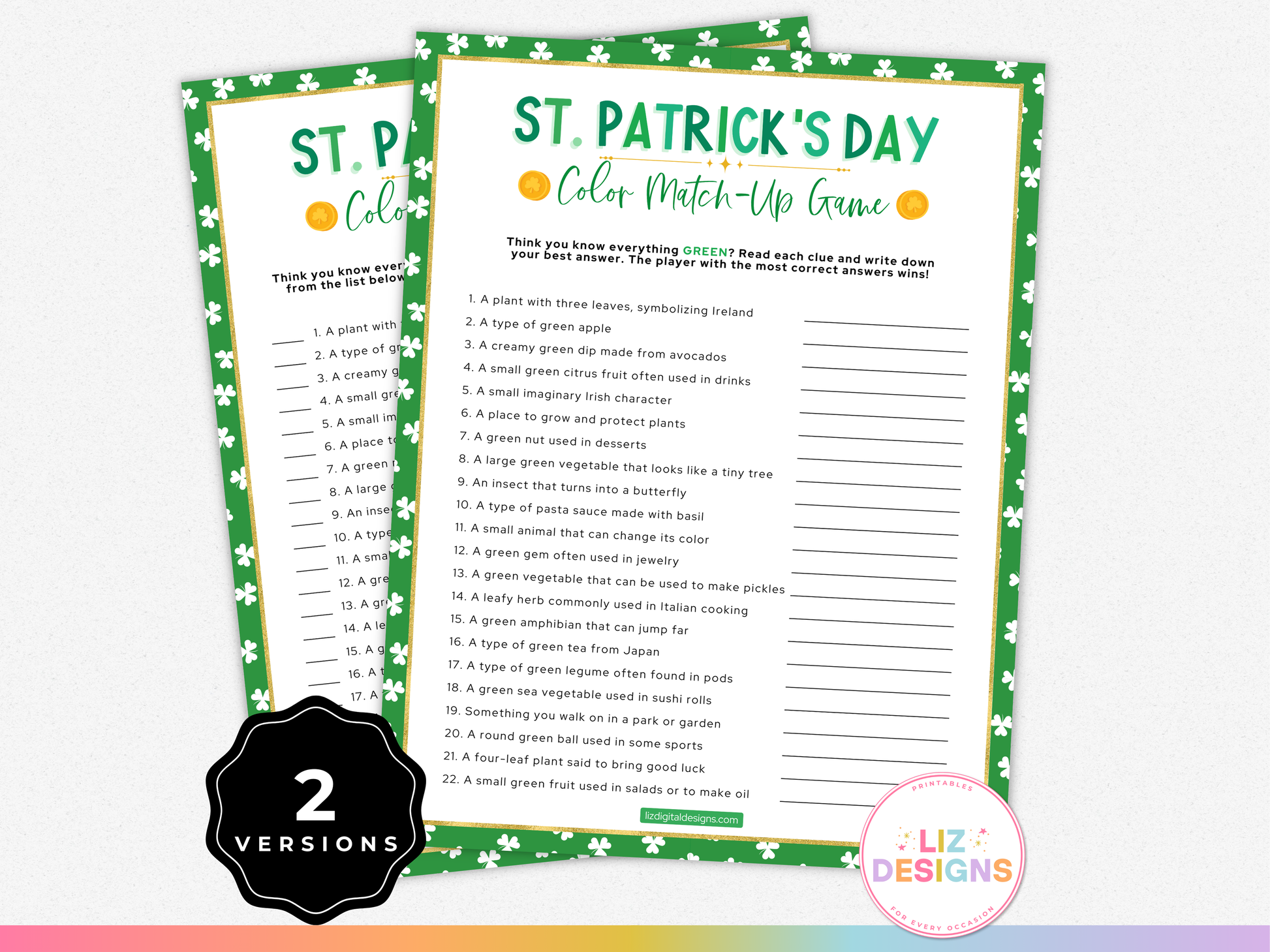 πThe ππ. πππππππ'π πππ πππππ πππππ-ππ ππππ includes two game versionsβan Answer-It-Yourself version and a Match-Up versionβmaking it perfect for kids, adults, family game nights, and even office or classroom parties! Whether you're hosting an Irish-themed party or just looking for a fun St. Paddyβs Day activity, this printable game has you covered.π