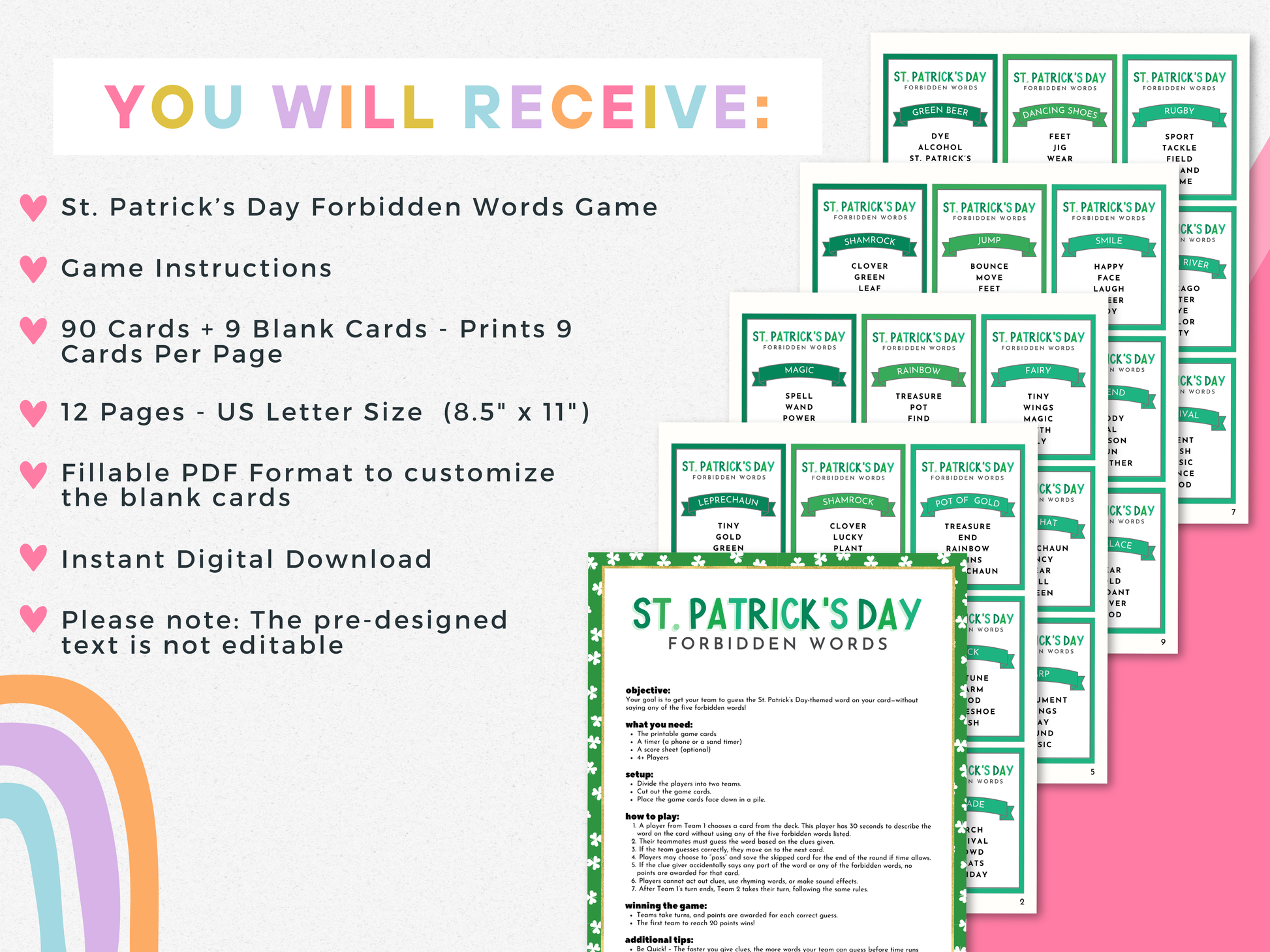 Get ready for some St. Patrick’s Day fun with this 𝐒𝐓. 𝐏𝐀𝐓𝐑𝐈𝐂𝐊'𝐒 𝐃𝐀𝐘 𝐅𝐎𝐑𝐁𝐈𝐃𝐃𝐄𝐍 𝐖𝐎𝐑𝐃𝐒 𝐆𝐀𝐌𝐄! Perfect for family game night, office parties, or adult game nights, this printable party game is a must-have for your St. Paddy’s Day celebrations. Whether you're hosting a Saint Patrick’s Day party, planning a bar crawl game, or looking for a fun leprechaun-themed activity, this game is great for all ages!