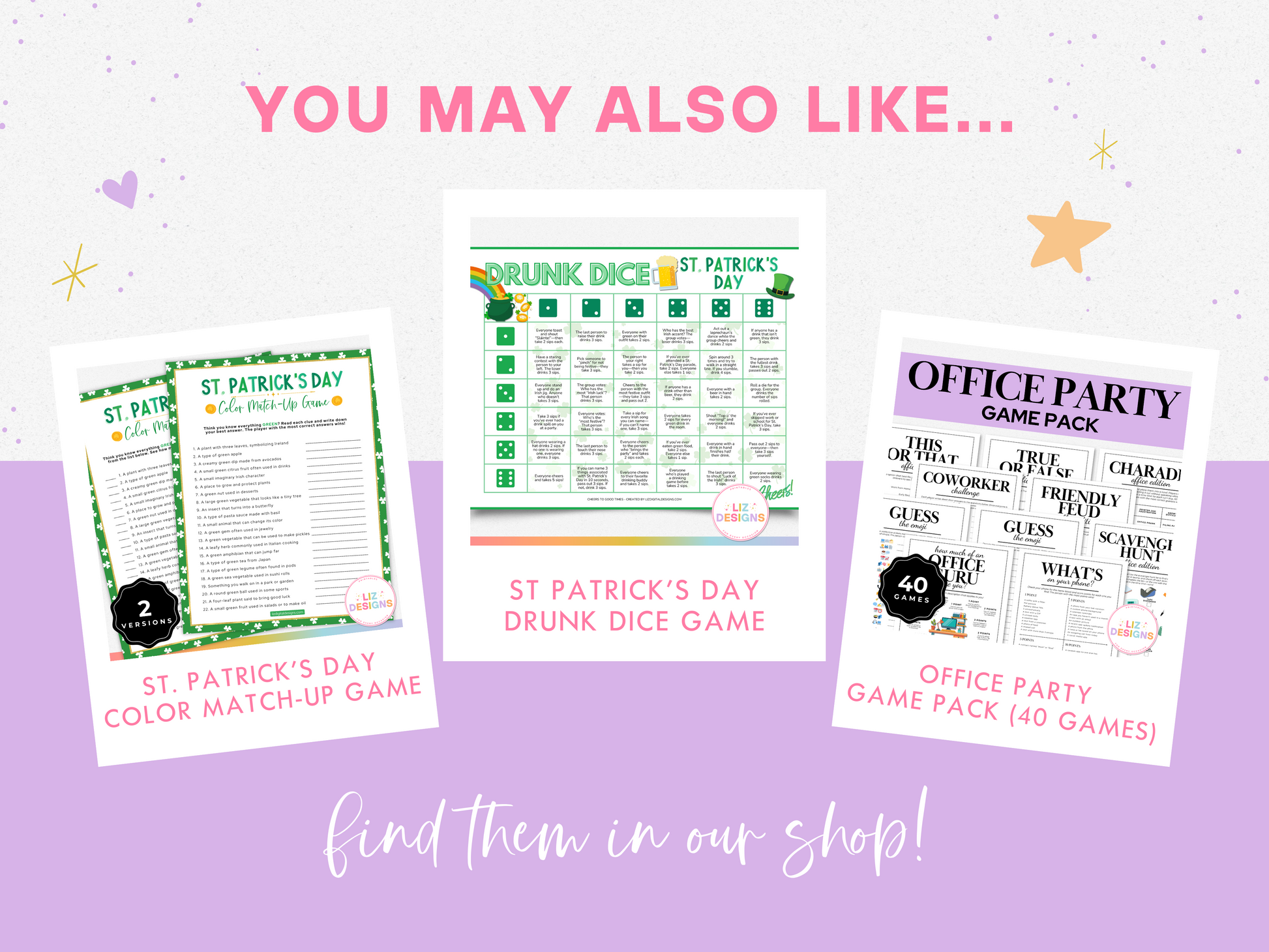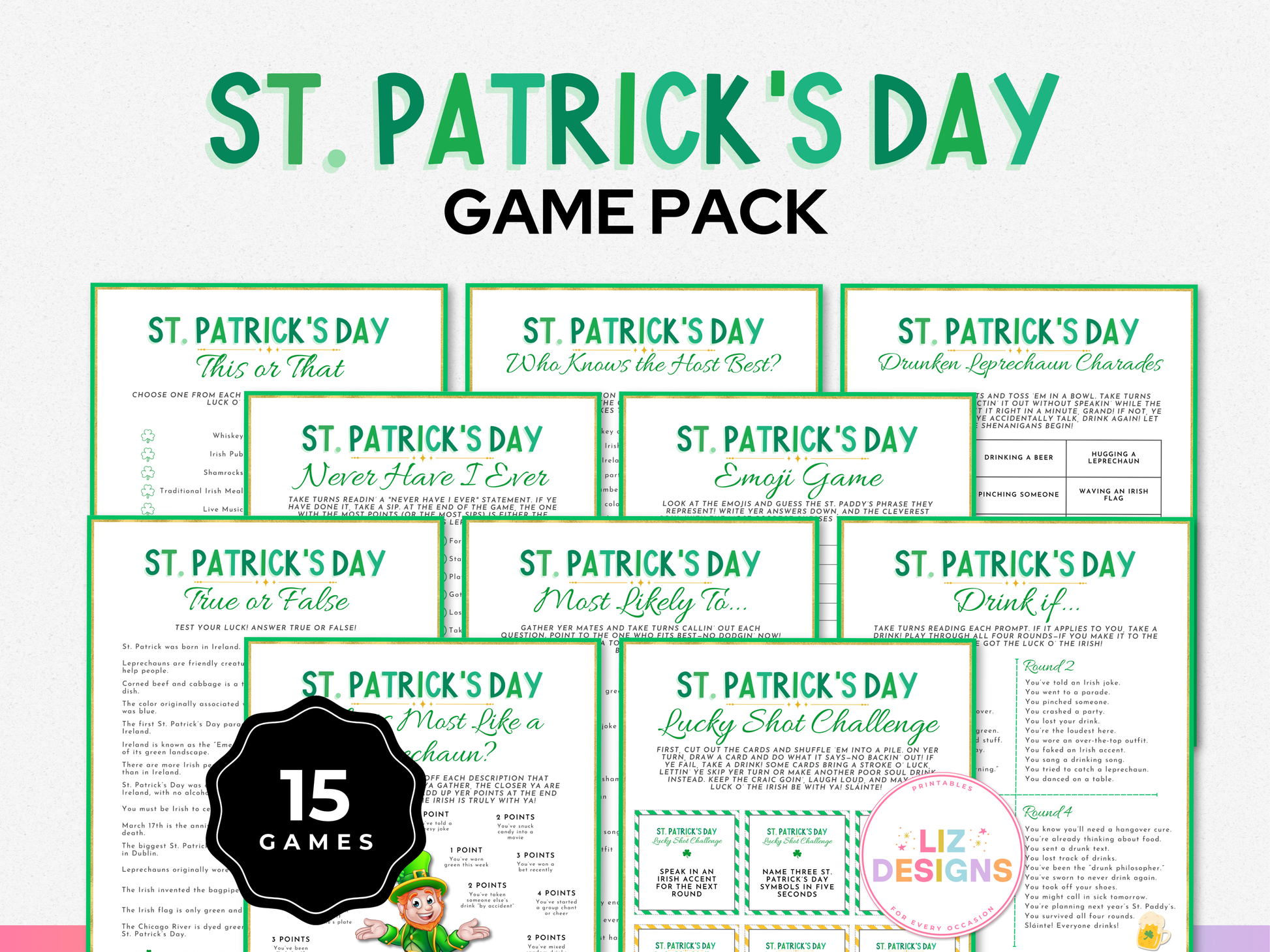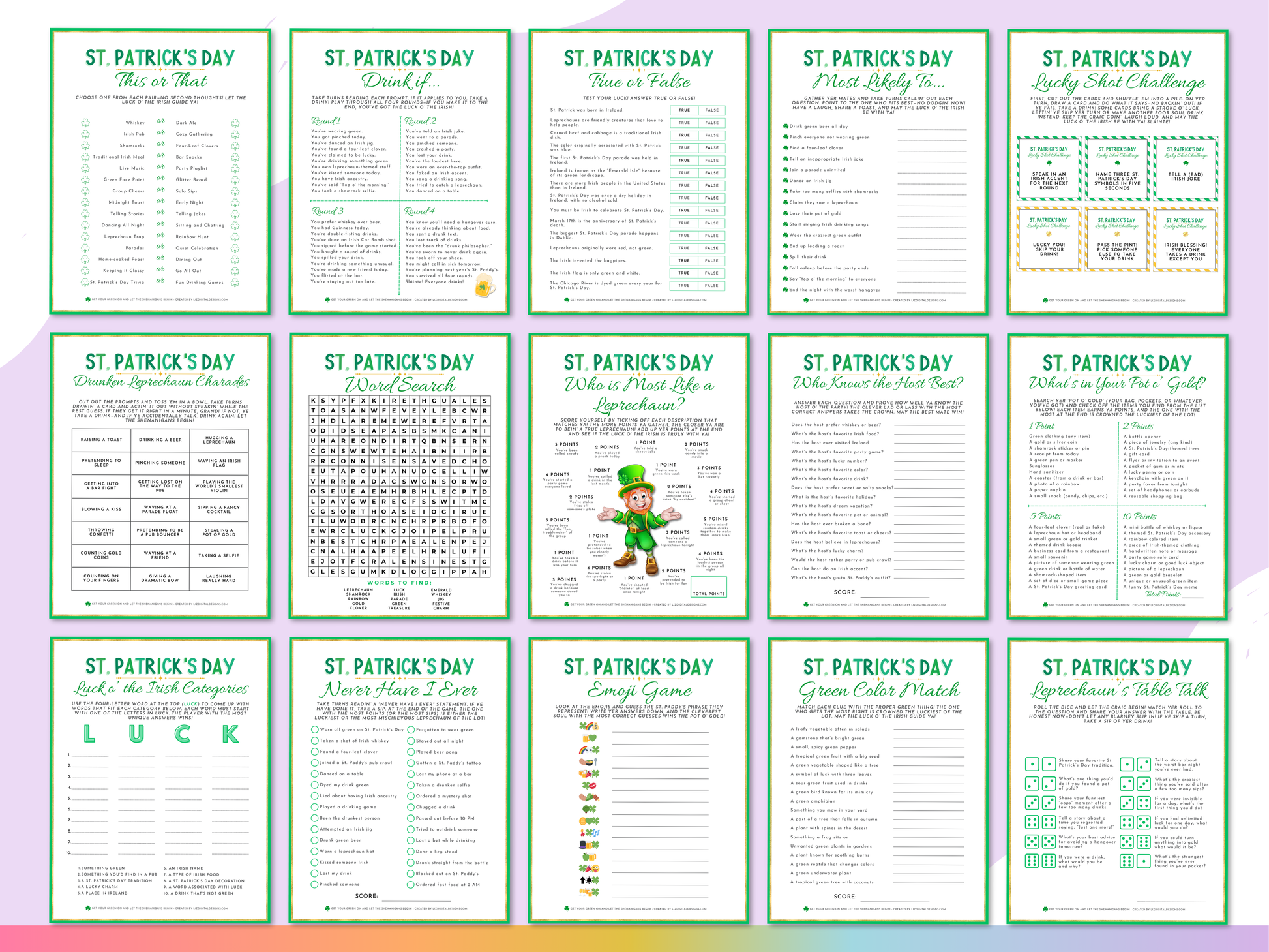 Ready to bring the luck oβ the Irish to your party? This printable ππ. πππππππ'π πππ πππππ ππππ ππππ is the perfect addition to your adult party, family game night, or even a virtual celebration! Featuring festive trivia, fun challenges, and drinking games, itβs guaranteed to bring laughter and good times to the table!