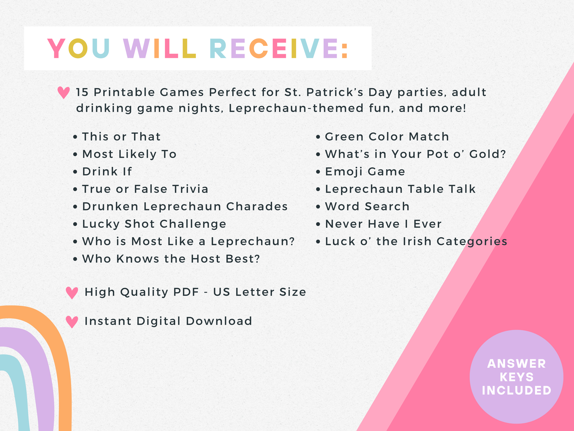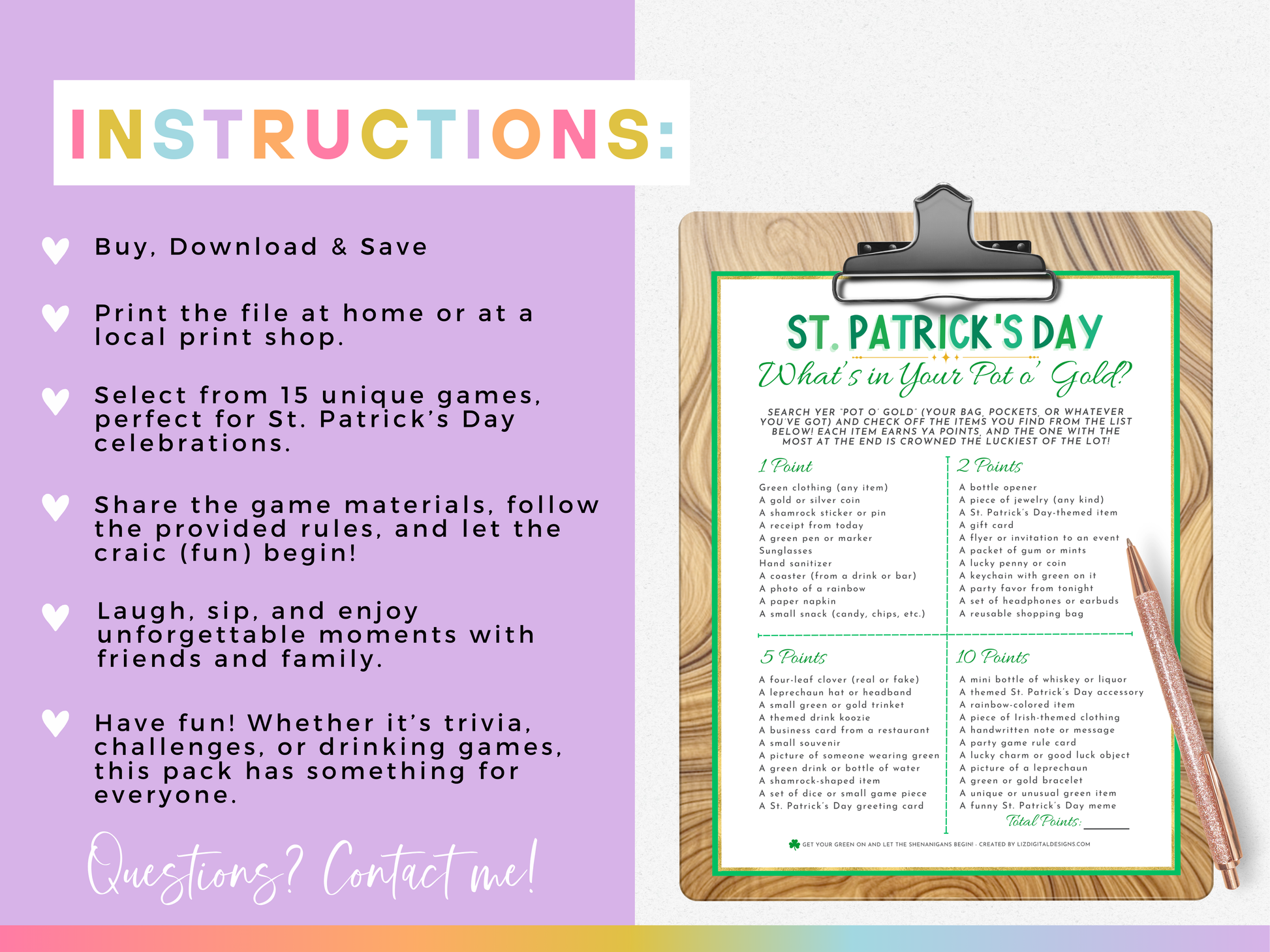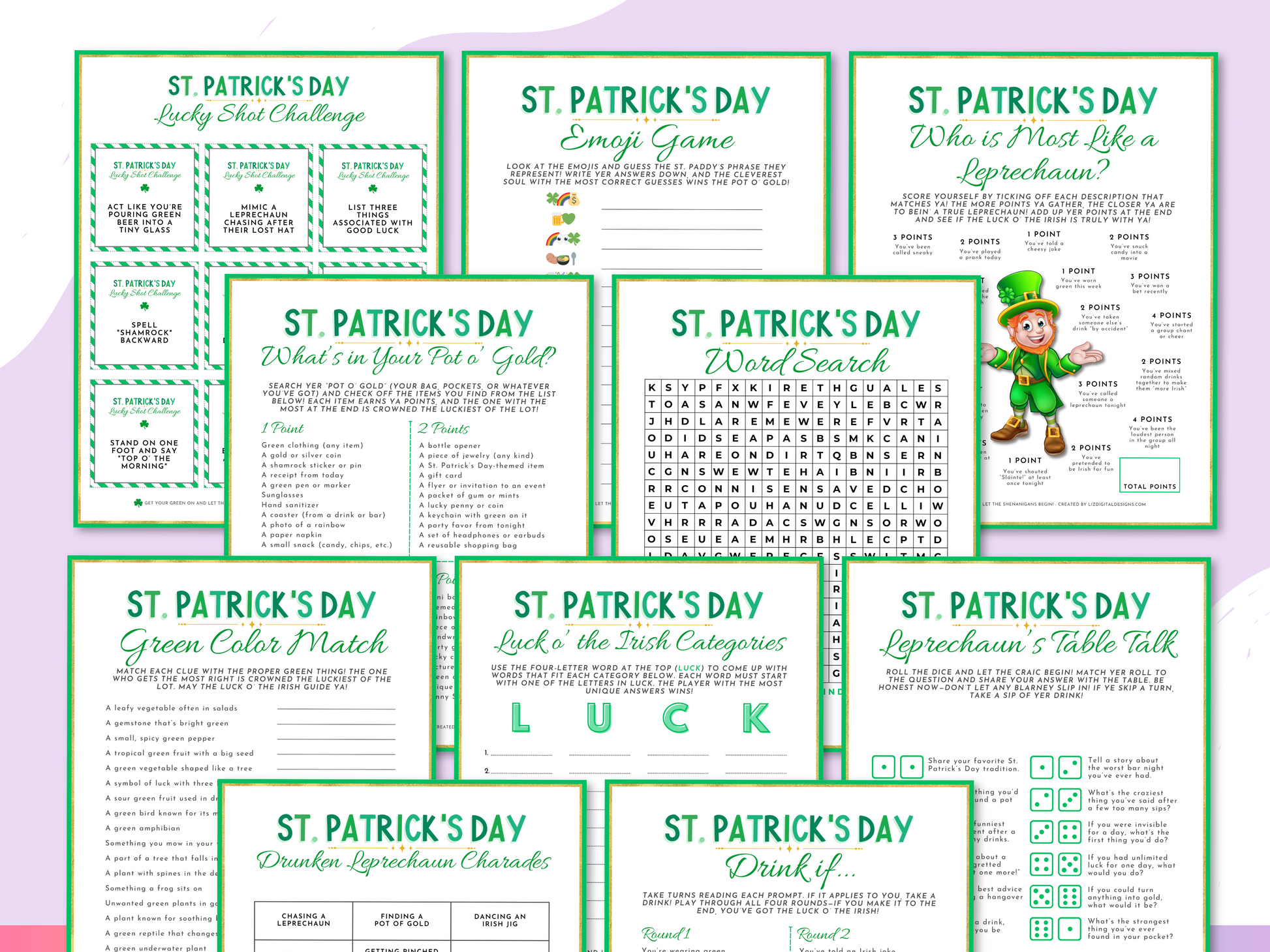Ready to bring the luck oβ the Irish to your party? This printable ππ. πππππππ'π πππ πππππ ππππ ππππ is the perfect addition to your adult party, family game night, or even a virtual celebration! Featuring festive trivia, fun challenges, and drinking games, itβs guaranteed to bring laughter and good times to the table!
