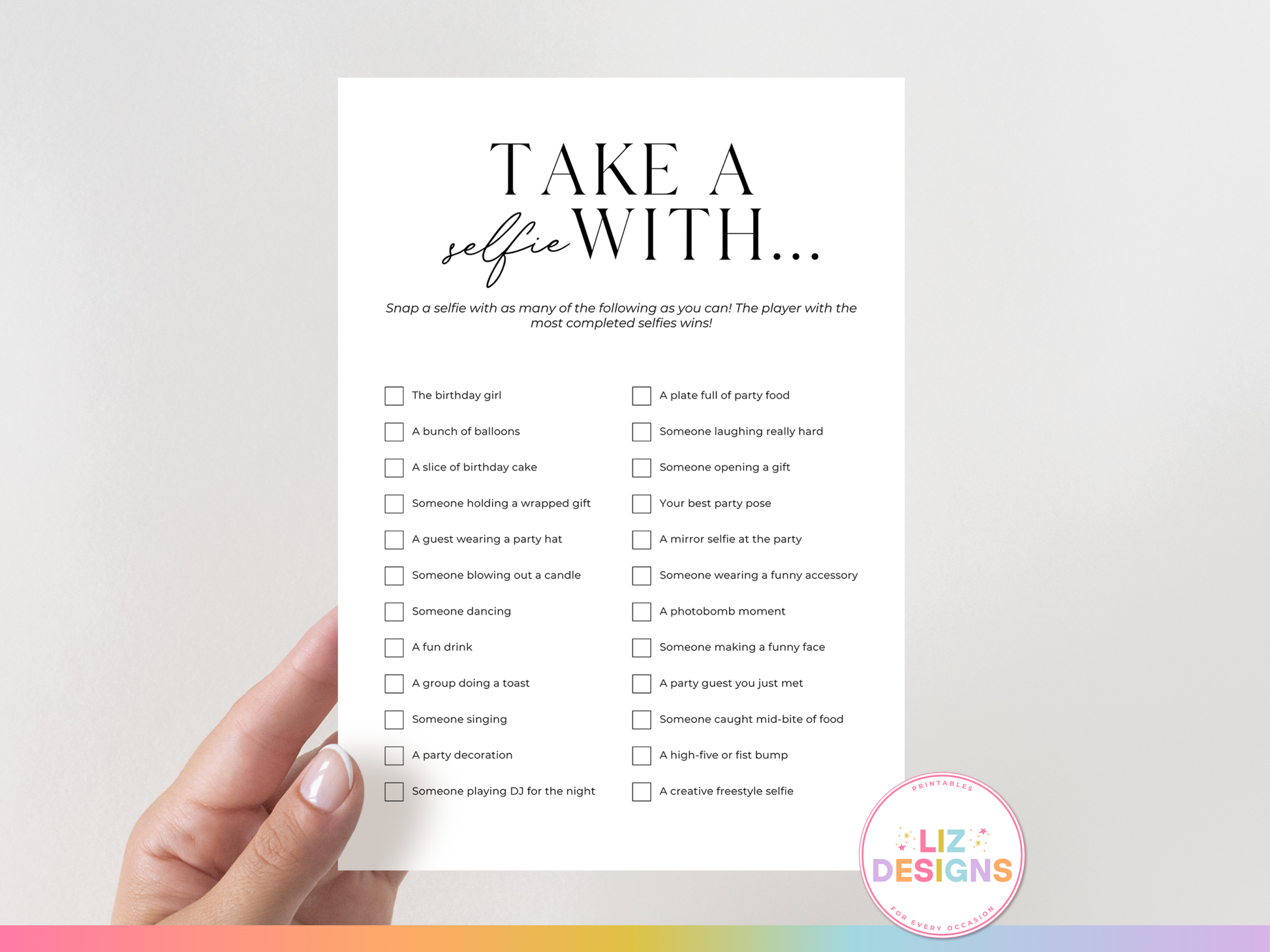 Get ready to capture the best moments at your party with this fun ππππ π ππππ ππ ππππ (πππππππππ ππππ ππππ) - ππππππππ ππππ πππππππ! Challenge your guests to snap selfies with different party-themed prompts β the player with the most completed selfies wins! Perfect for a birthday party, girls' night, or even a teen or adult scavenger hunt!
