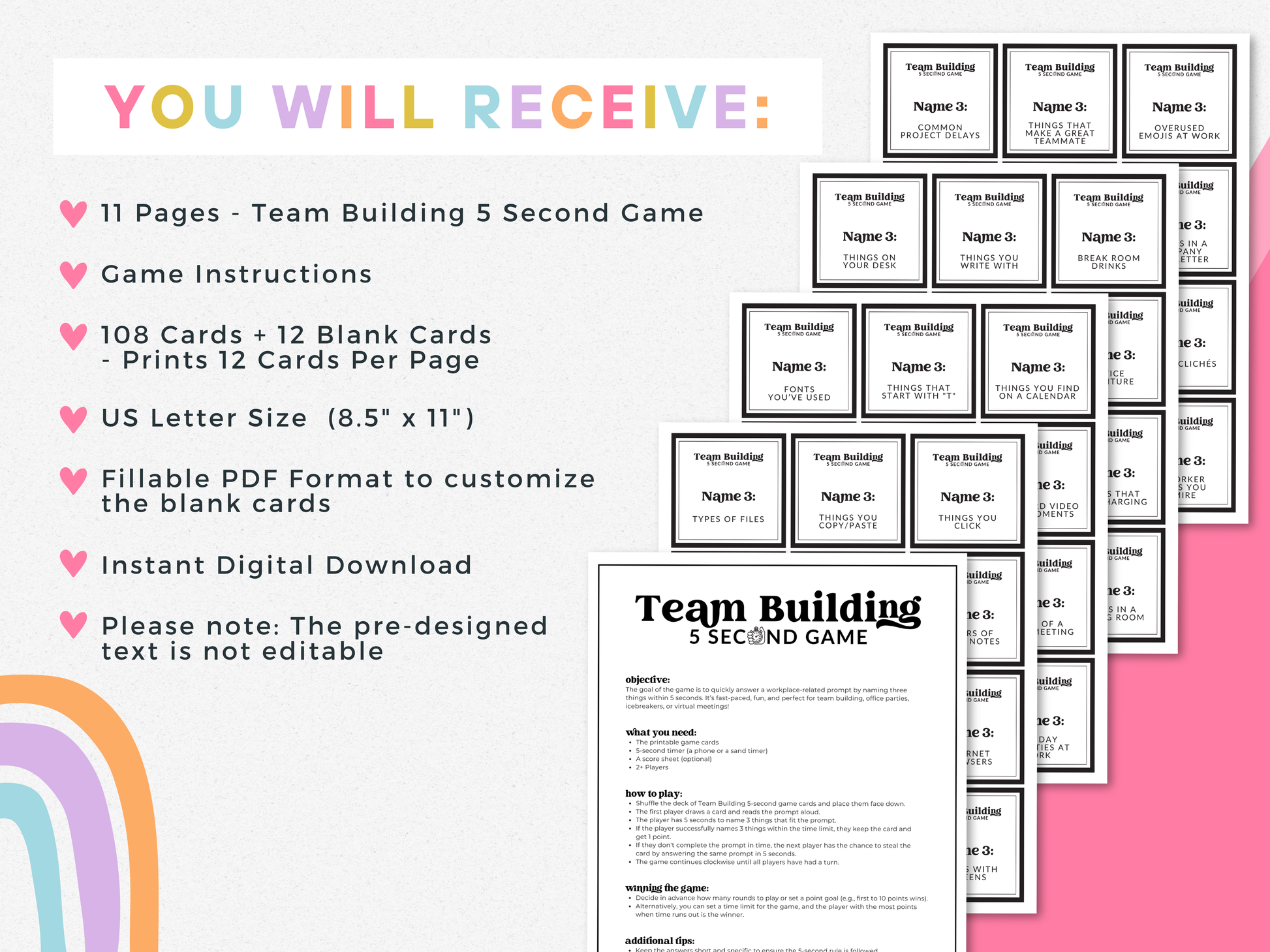 π Use the 12 blank cards to add personalized team prompts or inside jokes