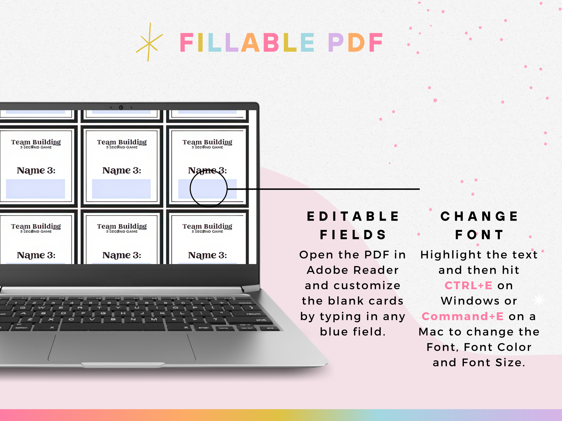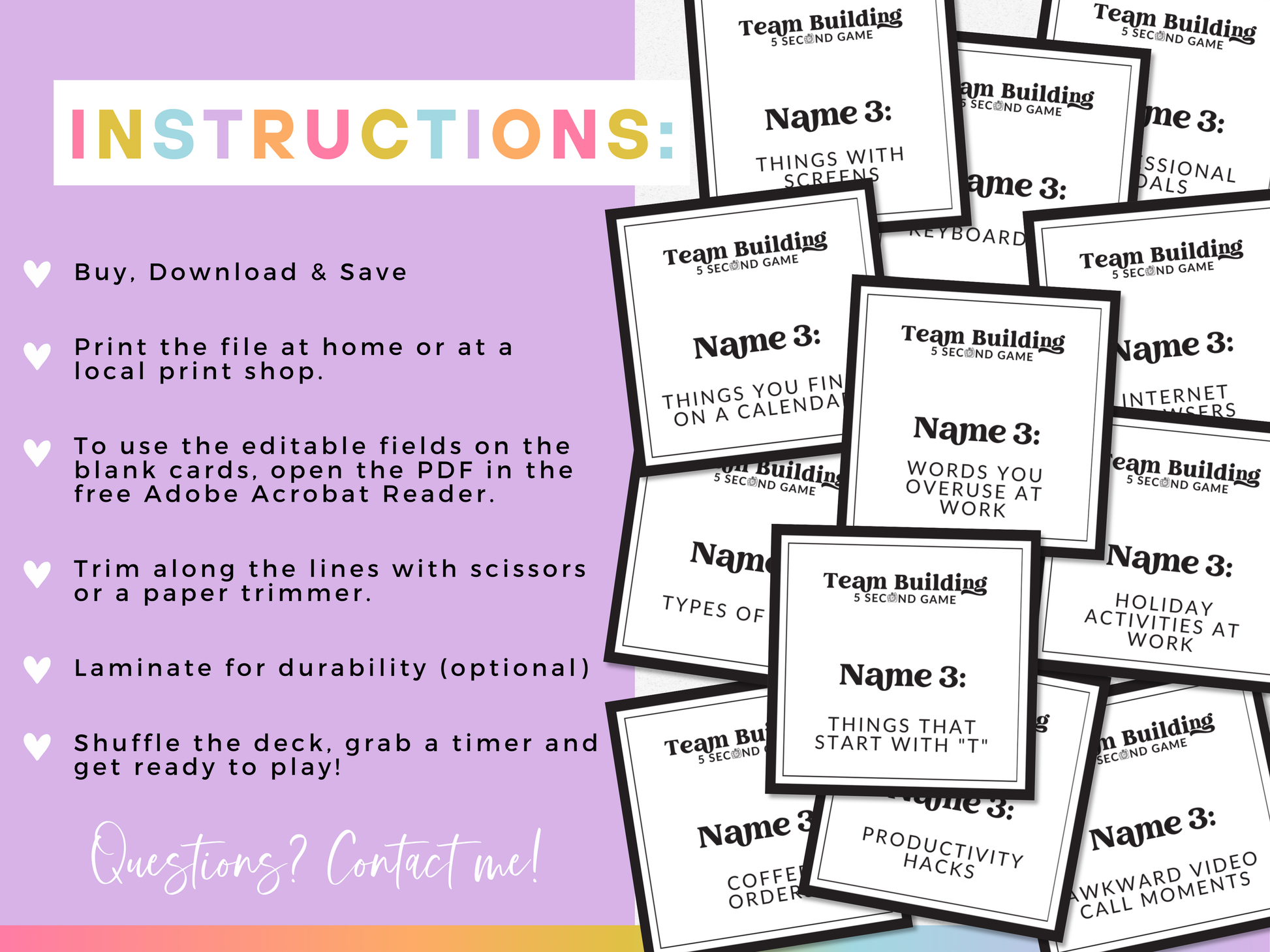 Make meetings less meh and team time more fun with this ππππ ππππππππ π ππππππ ππππ! This printable icebreaker is made for laughs, fast thinking, and connection. With 108 witty βName 3β cards, this game is the perfect way to energize staff meetings, virtual happy hours, office parties, or remote retreats.