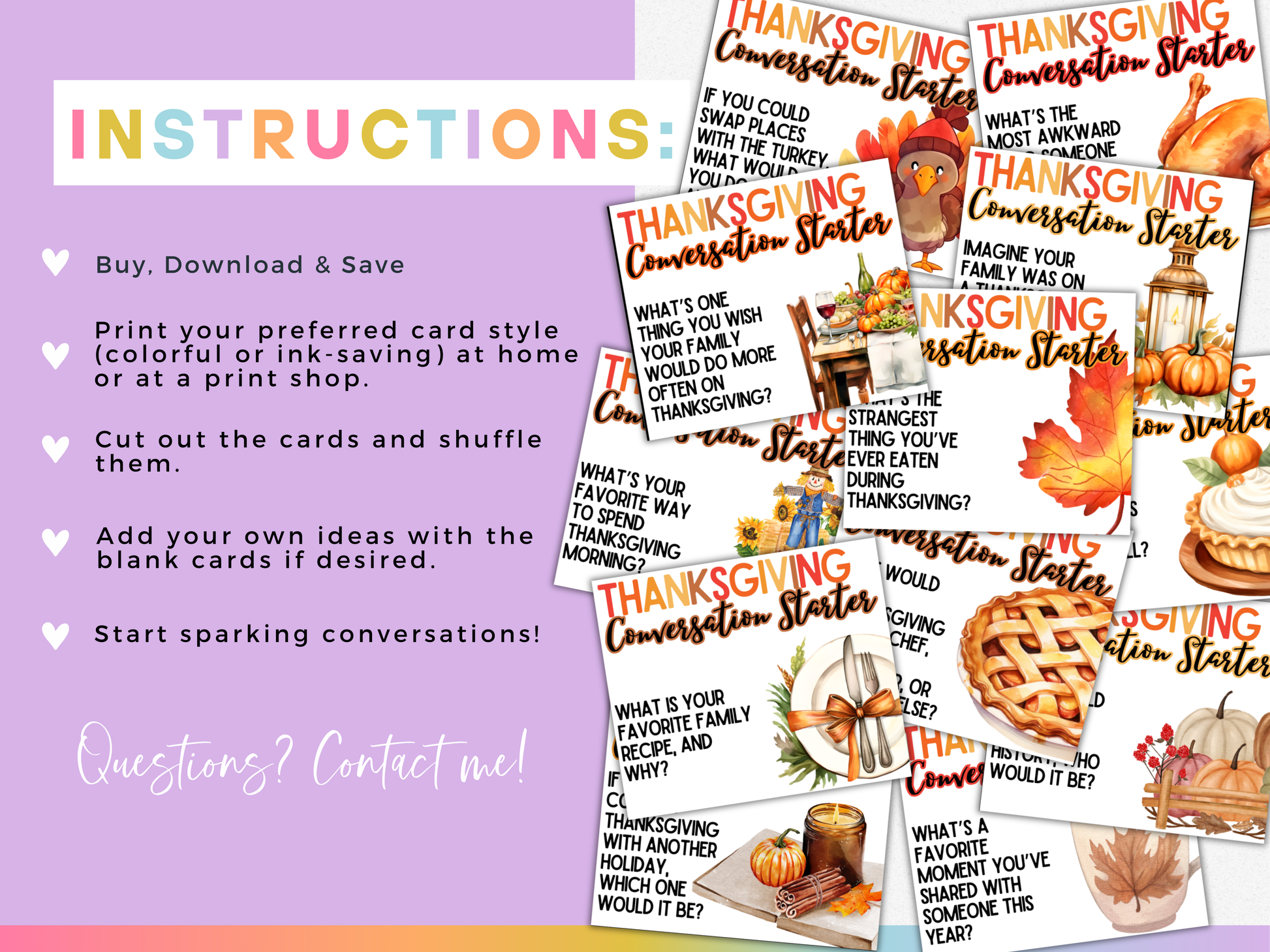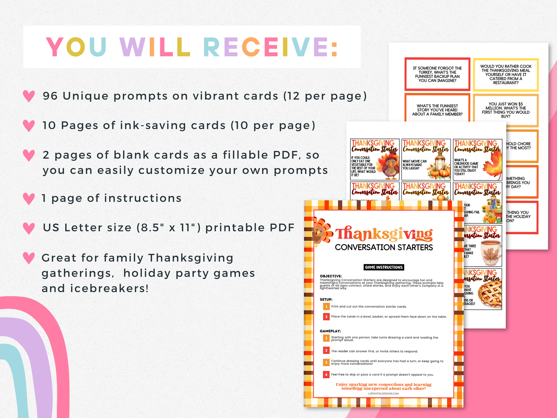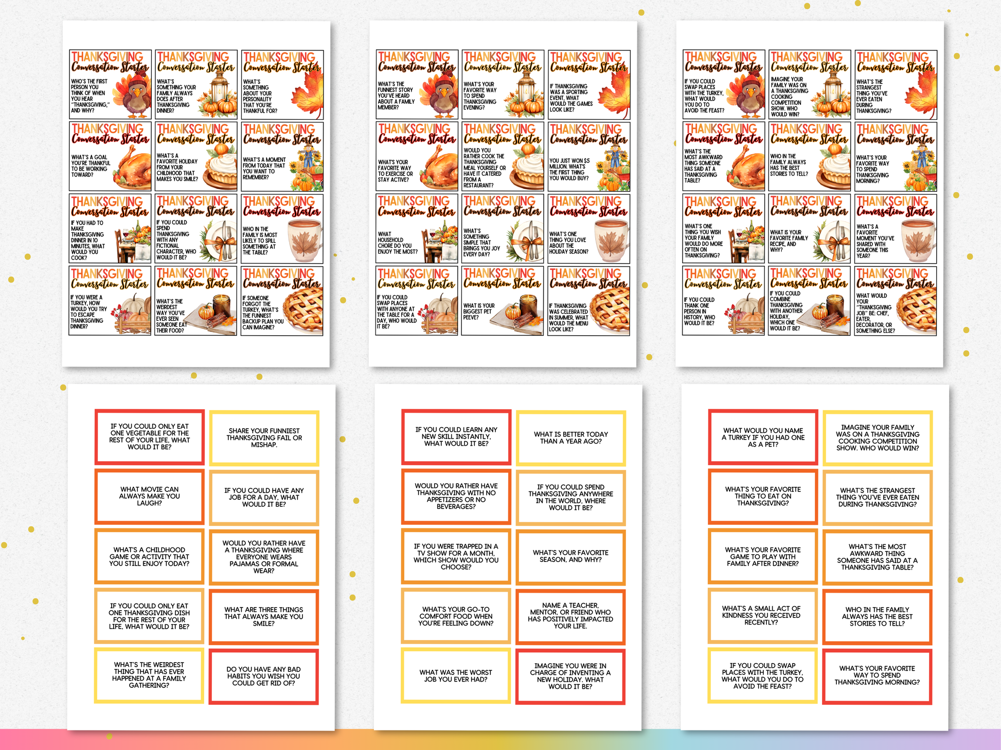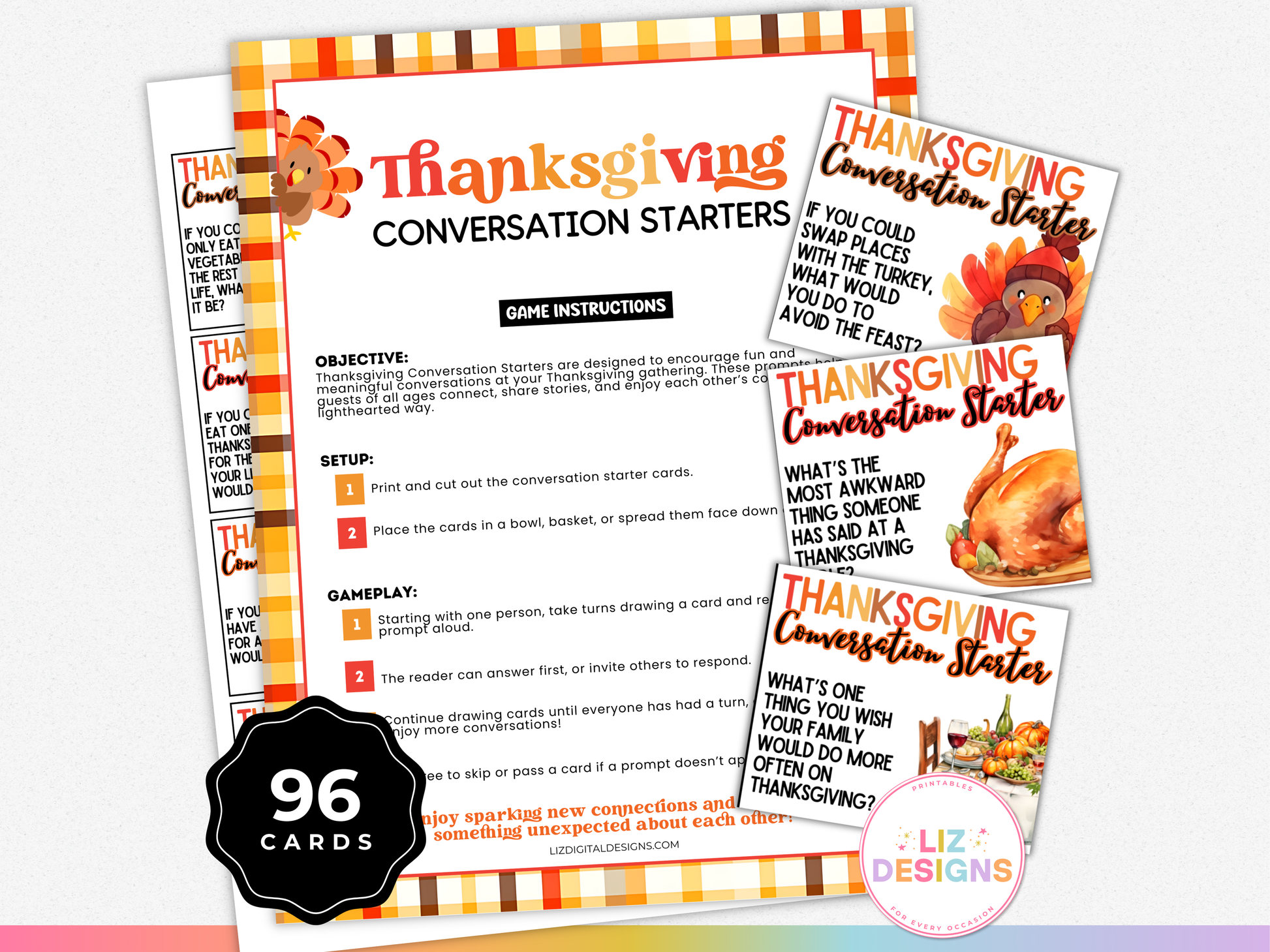 These printable ππππππππππππ ππππππππππππ ππππππππ are the perfect way to bring laughter, meaningful discussions, and fun to your family Thanksgiving dinner! With 96 unique prompts, this 21-page set is great for all ages and makes an excellent family game or dinner icebreaker to keep everyone engaged!