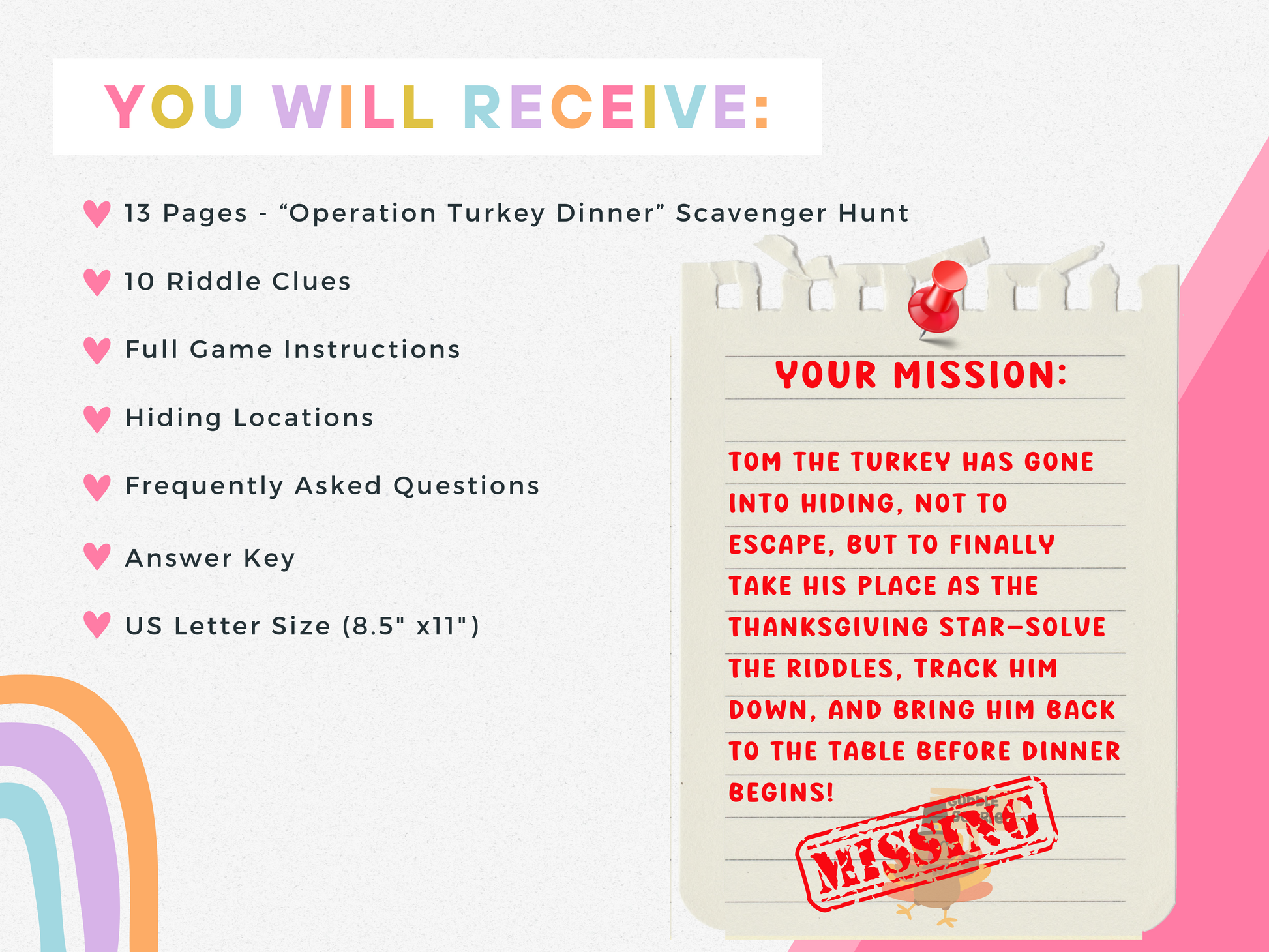 In this Thanksgiving edition, Tom the Turkey has gone into hidingβnot to escape, but because heβs ready to become the star of Thanksgiving dinner! Heβs cleverly tucked himself away, leaving a trail of tricky riddles behind to make the hunt even more thrilling.