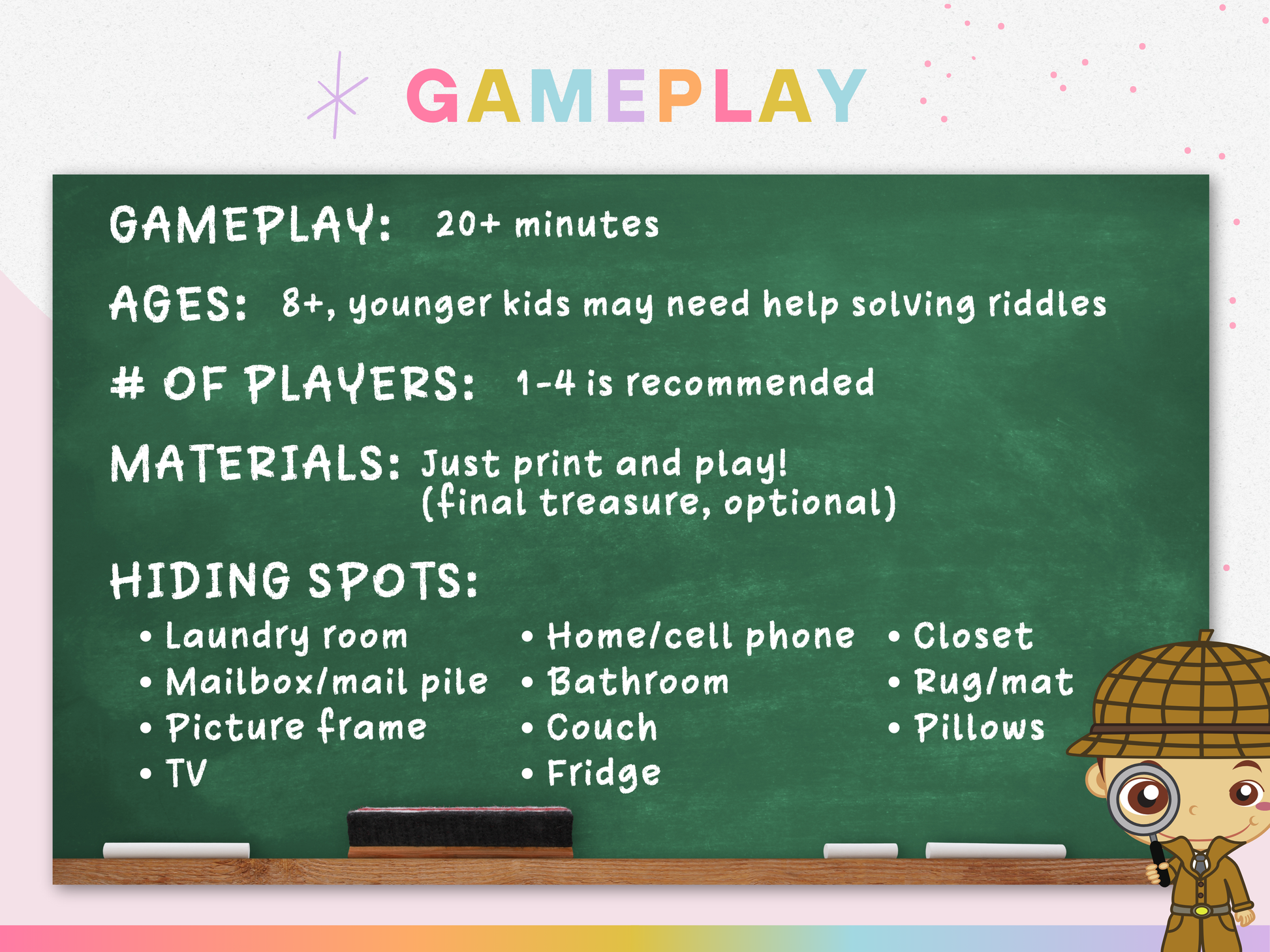 π Cut the clue cards in half and hide them in the spots listed in the instructions.