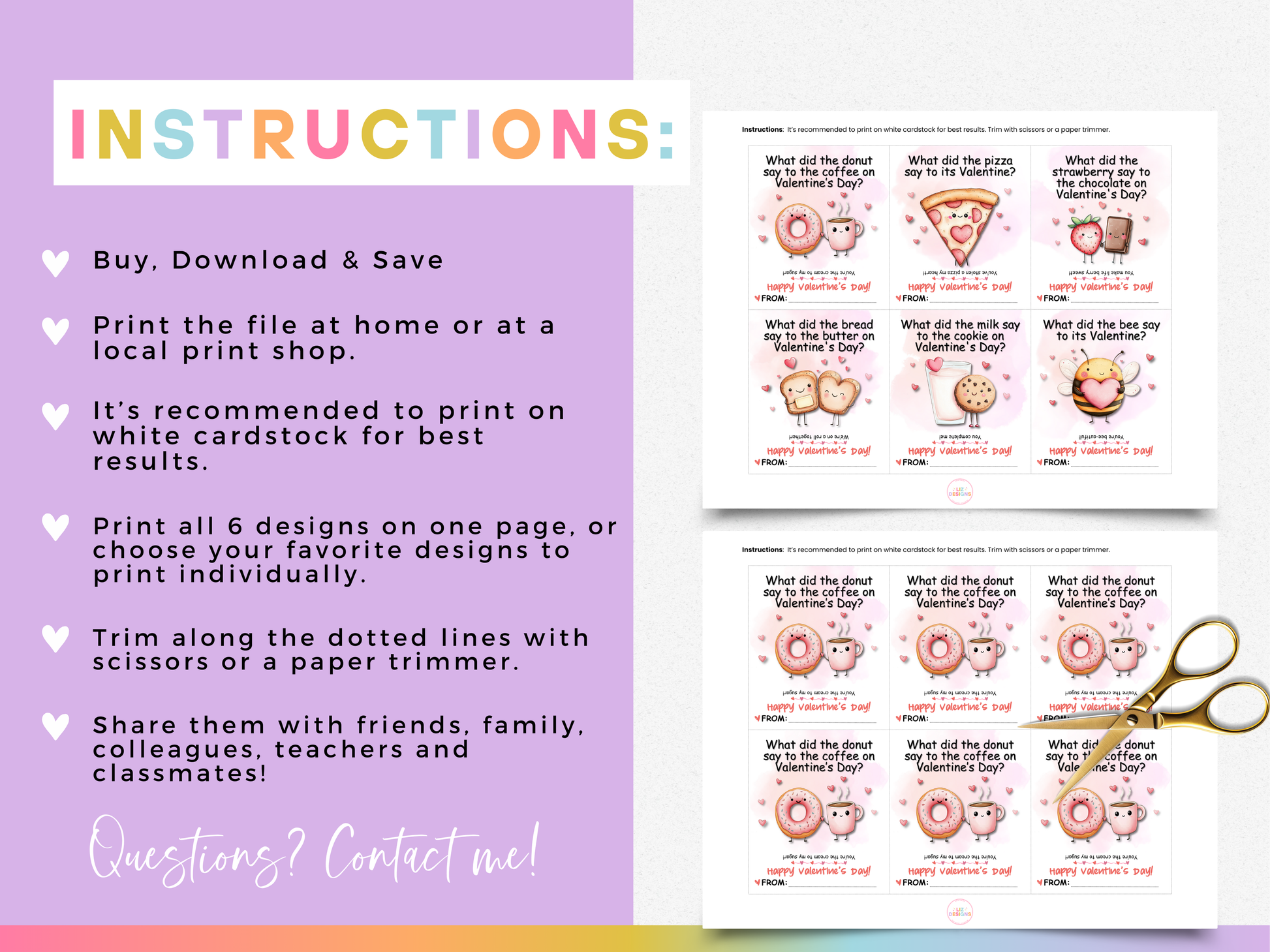 π Includes 6 unique Valentine joke designs (coffee & donut, bee, milk & cookie, pizza, strawberry & chocolate, bread & butter)