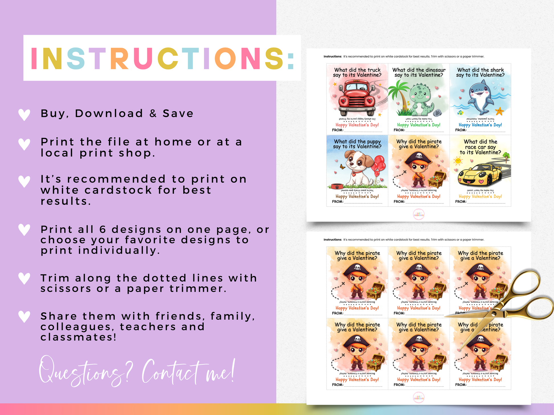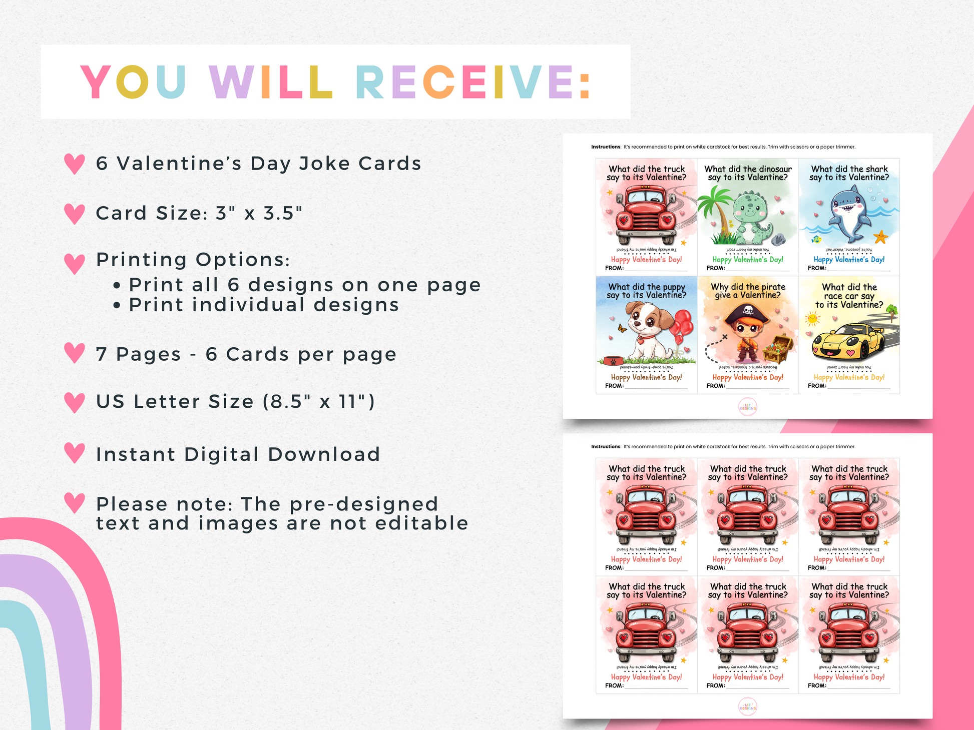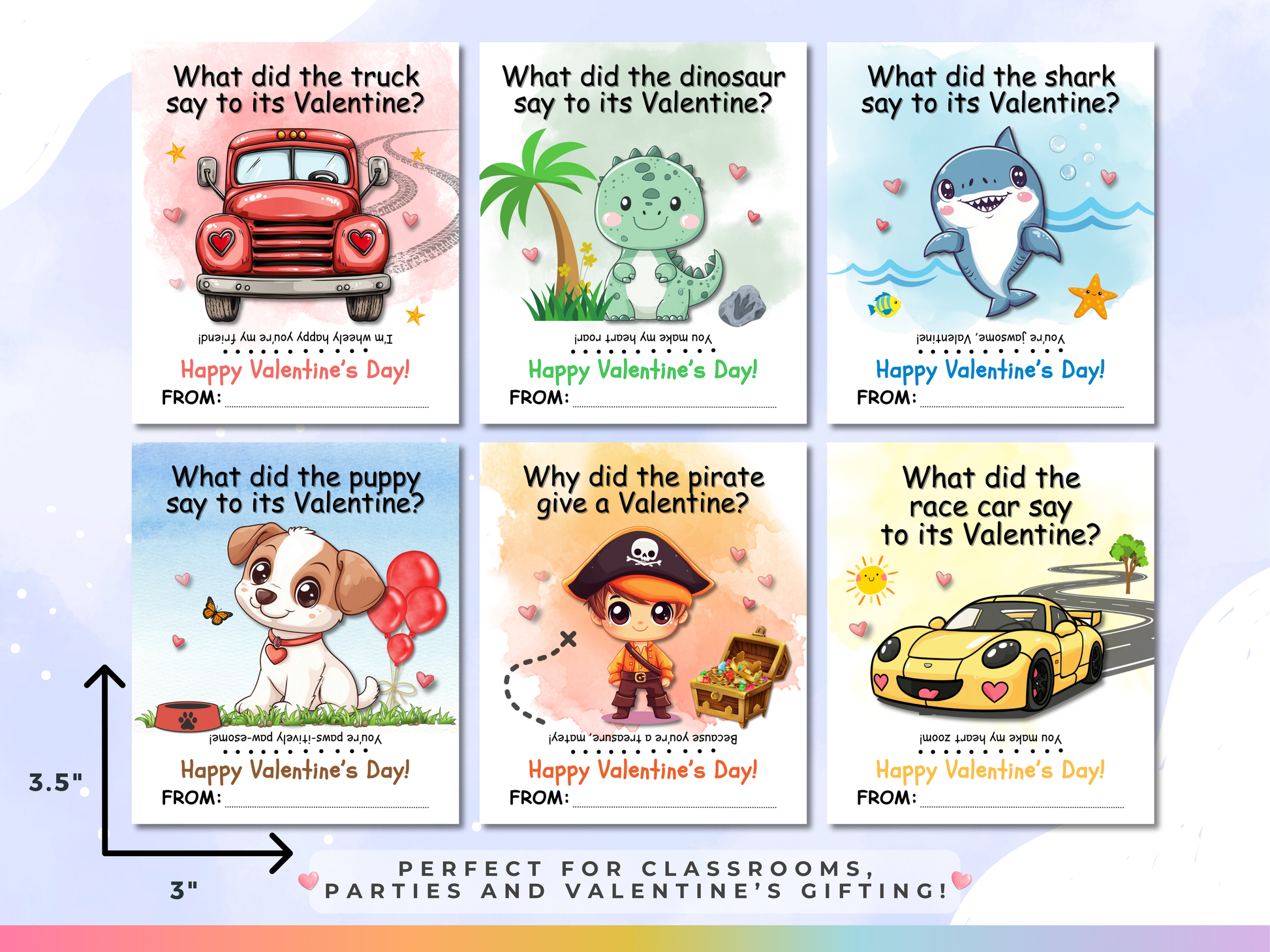 These πππππππππ'π πππ ππππ πππππ are the perfect addition to your classroom Valentines or school exchanges. Designed to delight kids with cute jokes and playful themes, these cards feature adorable illustrations like dinosaurs, puppies, race cars, and moreβmaking them the ultimate Valentines for boys and girls alike!