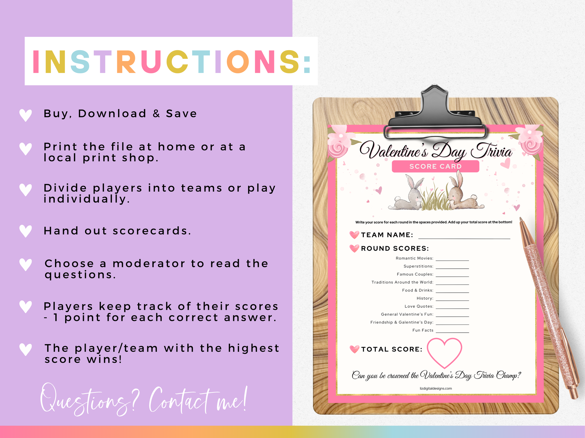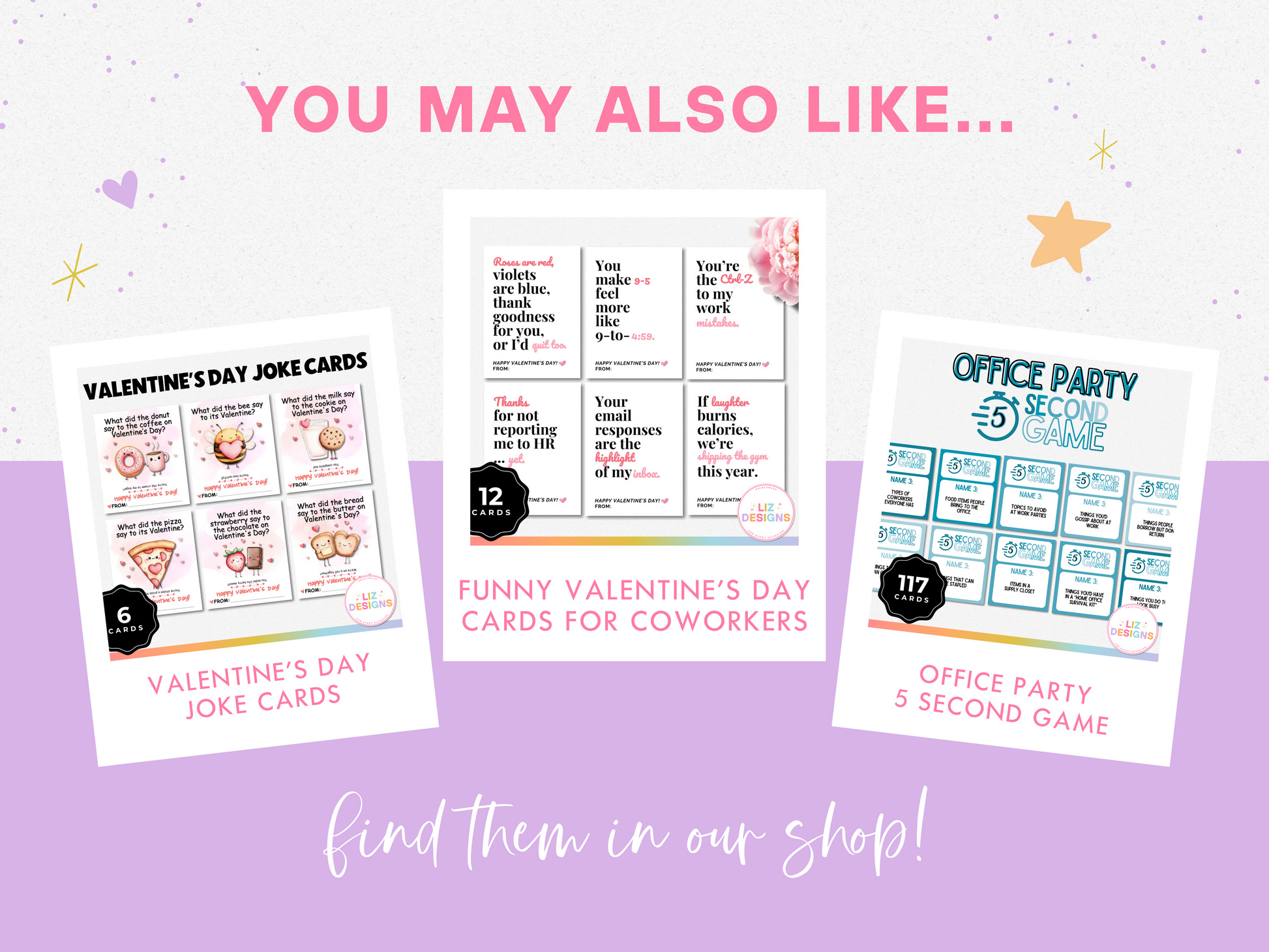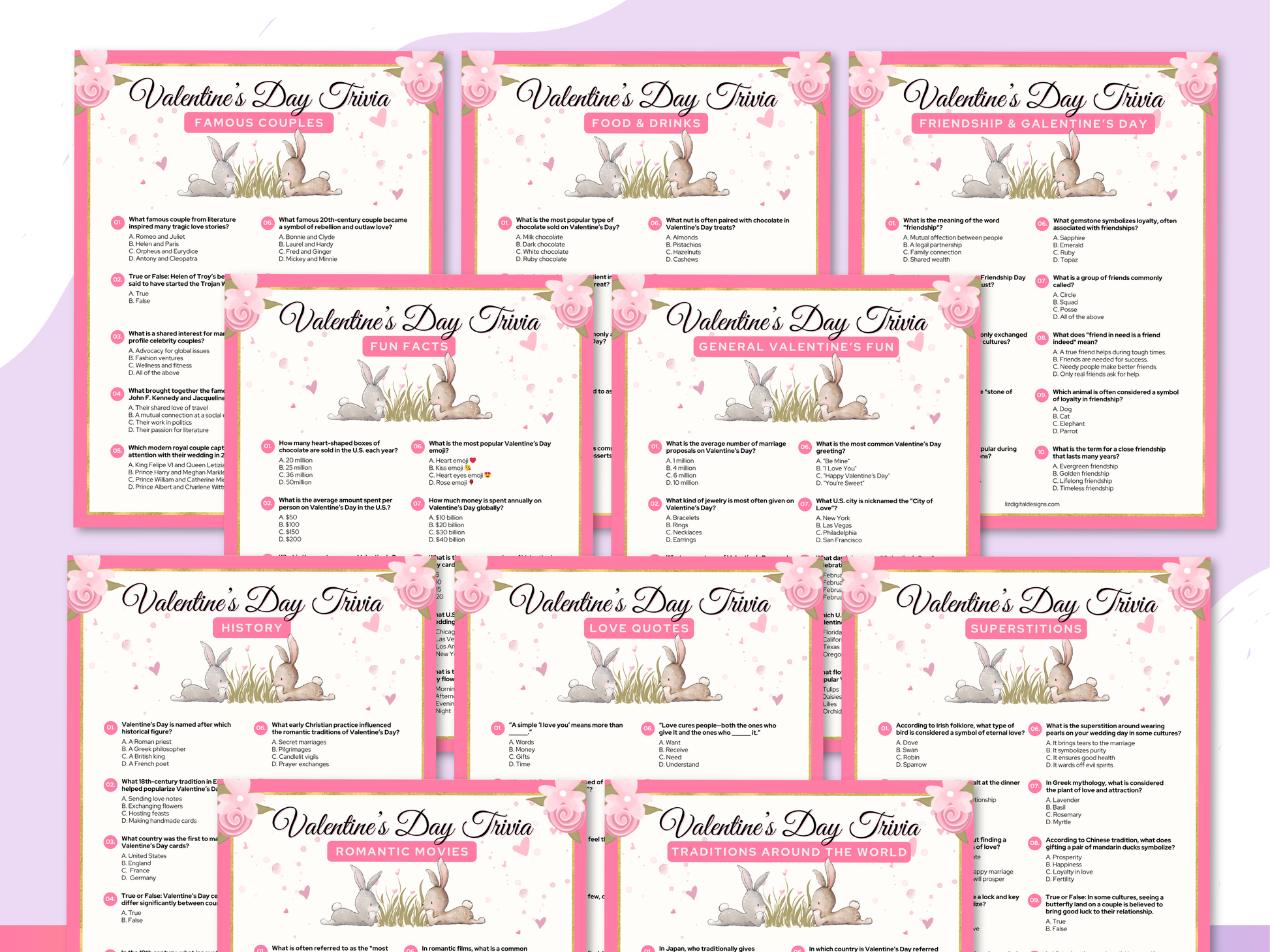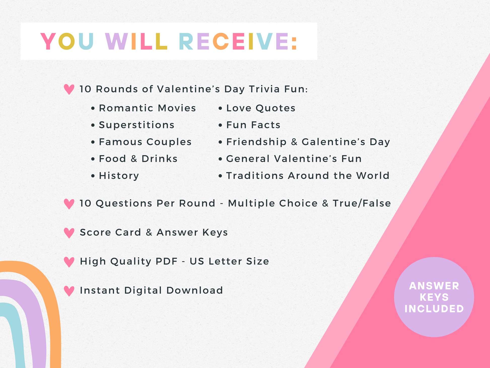 Looking for a fun and engaging activity for your Valentine’s Day celebration? This 𝐕𝐀𝐋𝐄𝐍𝐓𝐈𝐍𝐄'𝐒 𝐃𝐀𝐘 𝐓𝐑𝐈𝐕𝐈𝐀 𝐆𝐀𝐌𝐄 𝐁𝐔𝐍𝐃𝐋𝐄 is the ultimate addition to your Valentine's Day party, Galentine’s Day gathering, or even a cozy night in with family and friends. With 10 rounds of unique questions, this printable party game is perfect for players of all ages—kids and adults alike!
