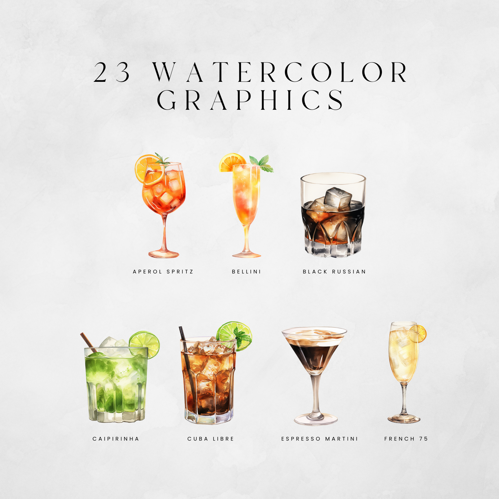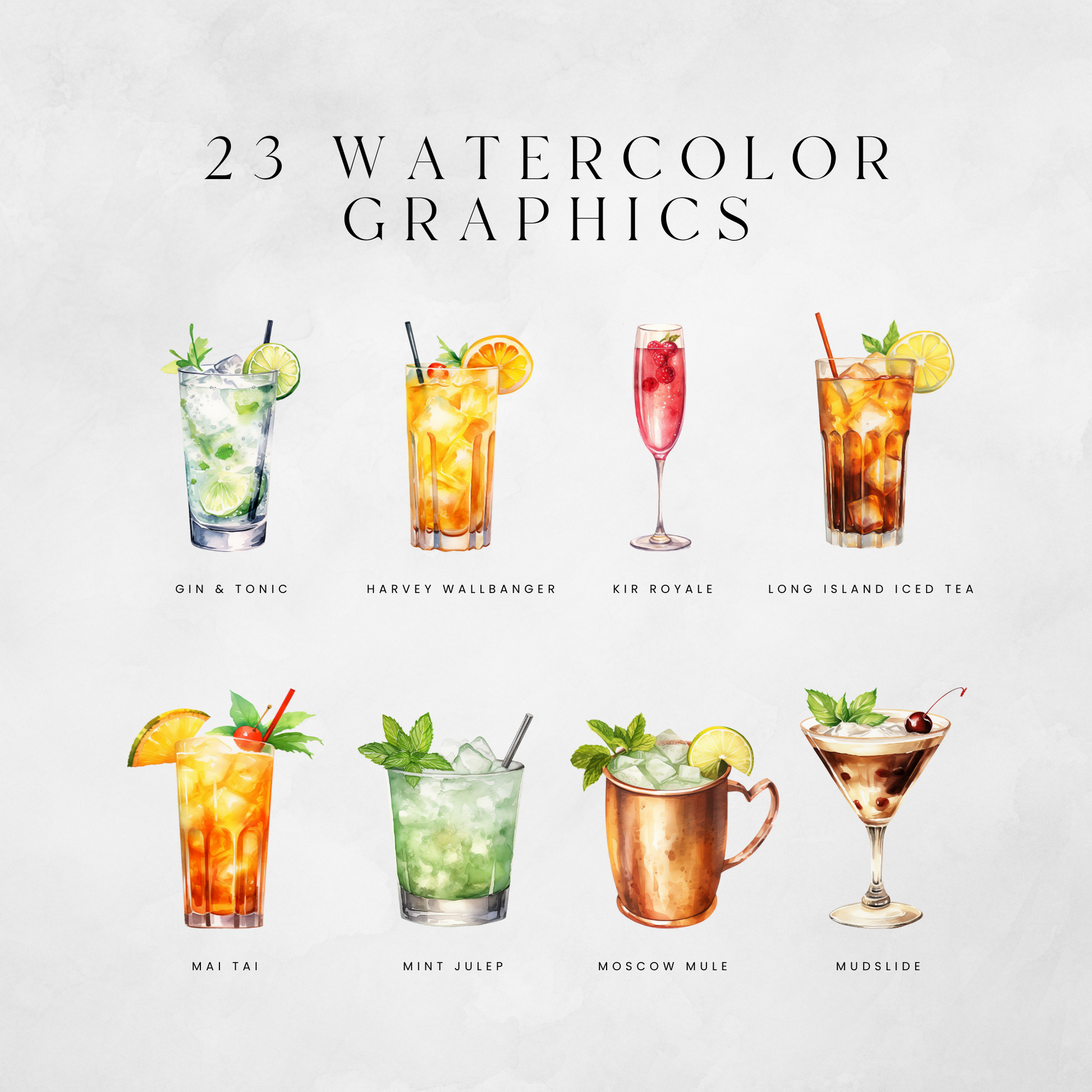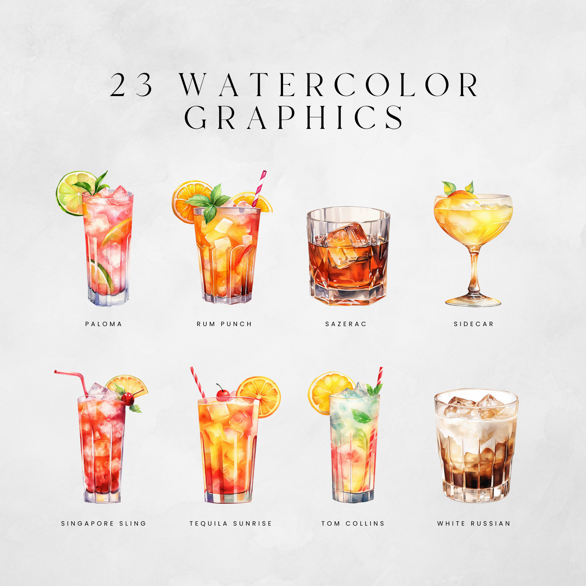 This Watercolor Cocktails Volume 1 Clipart Pack consists of 23 transparent PNG images of vibrant watercolor cocktails. These versatile illustrations are perfect for both personal and commercial projects such as invitations, posters and social media graphics. These high-quality images are also great for showcasing your favorite signature cocktails or creating a festive beverage menu!