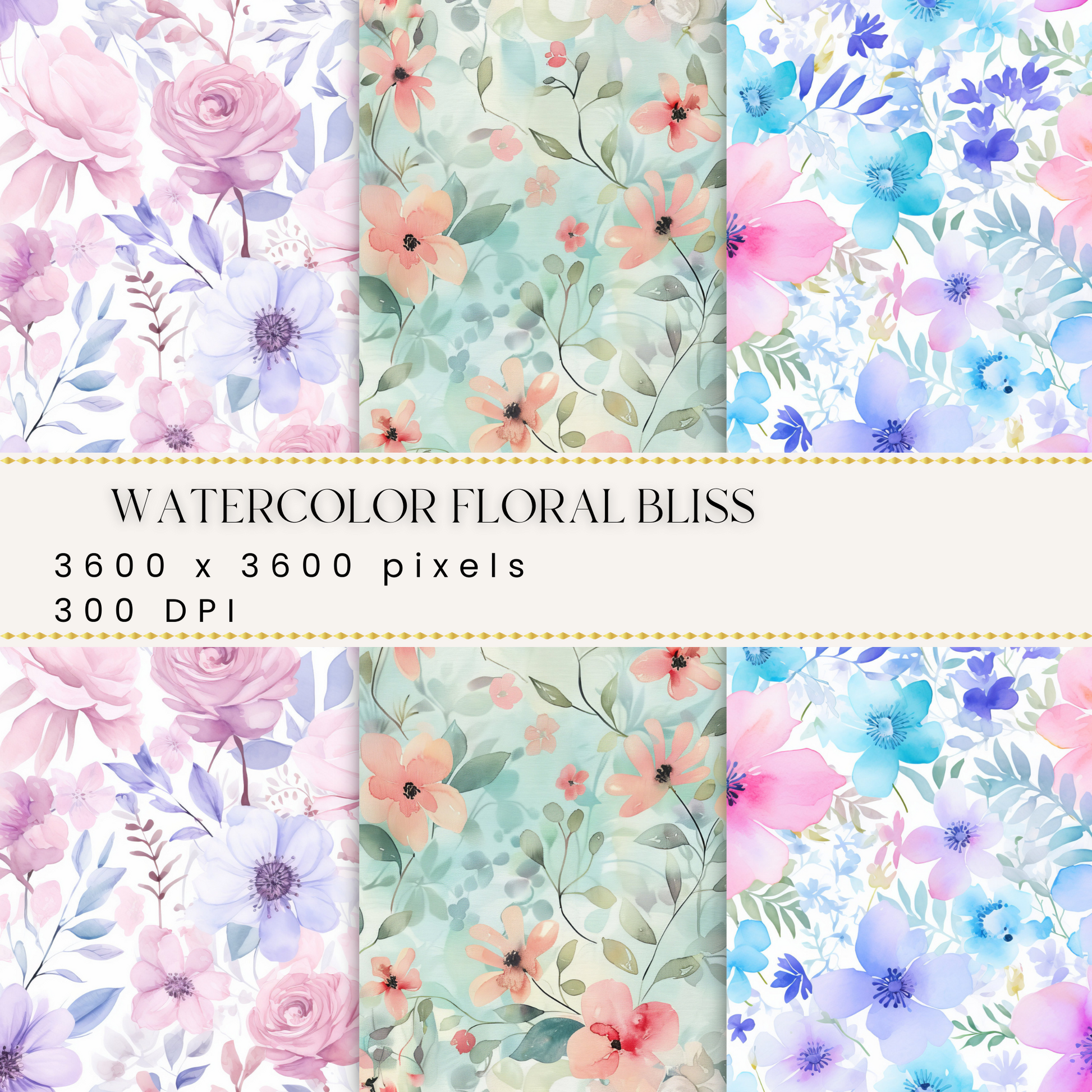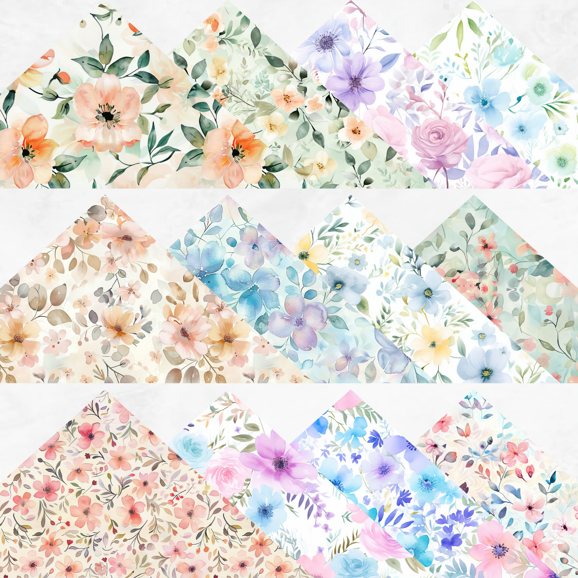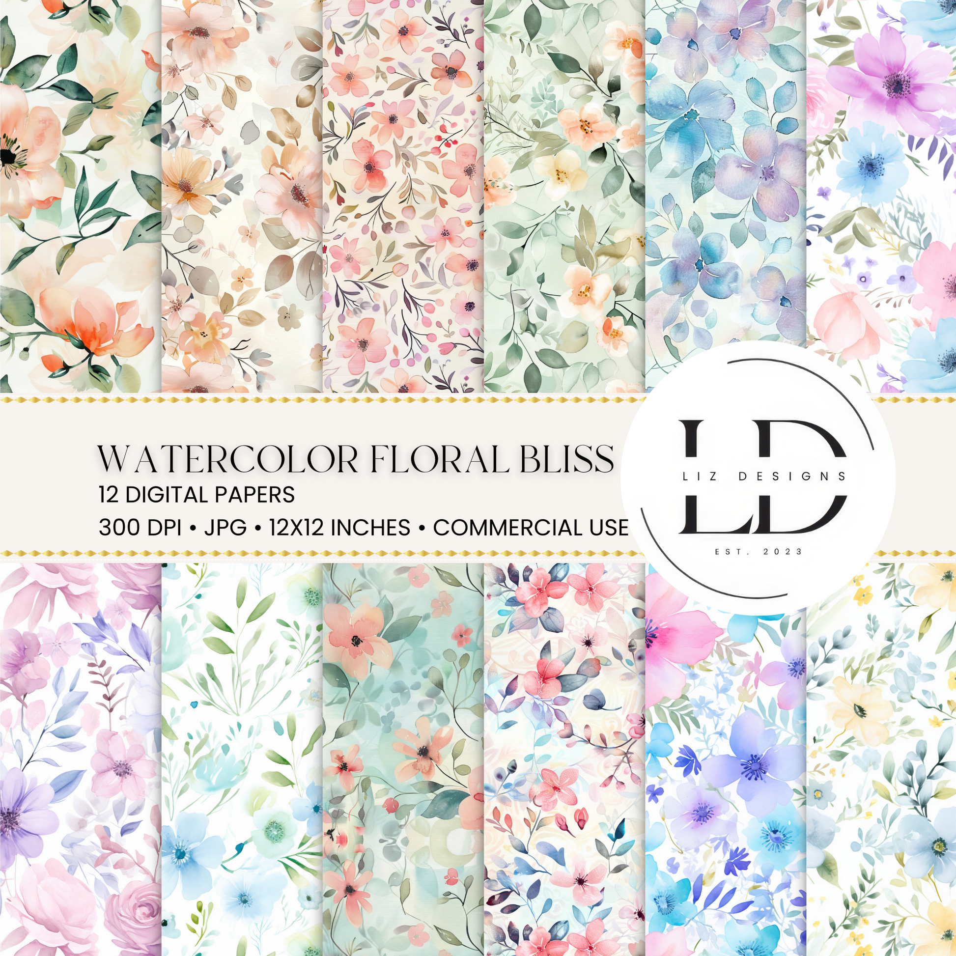 This is a beautiful set of 12 seamless Watercolor Floral Bliss digital papers. Each image measures 12" x 12" at 300 DPI resolution. Perfect for scrapbooking, digital backgrounds, invitations, journals and planners, beautiful wall art, greeting cards, logo and branding elements, engaging social media graphics and so much more!