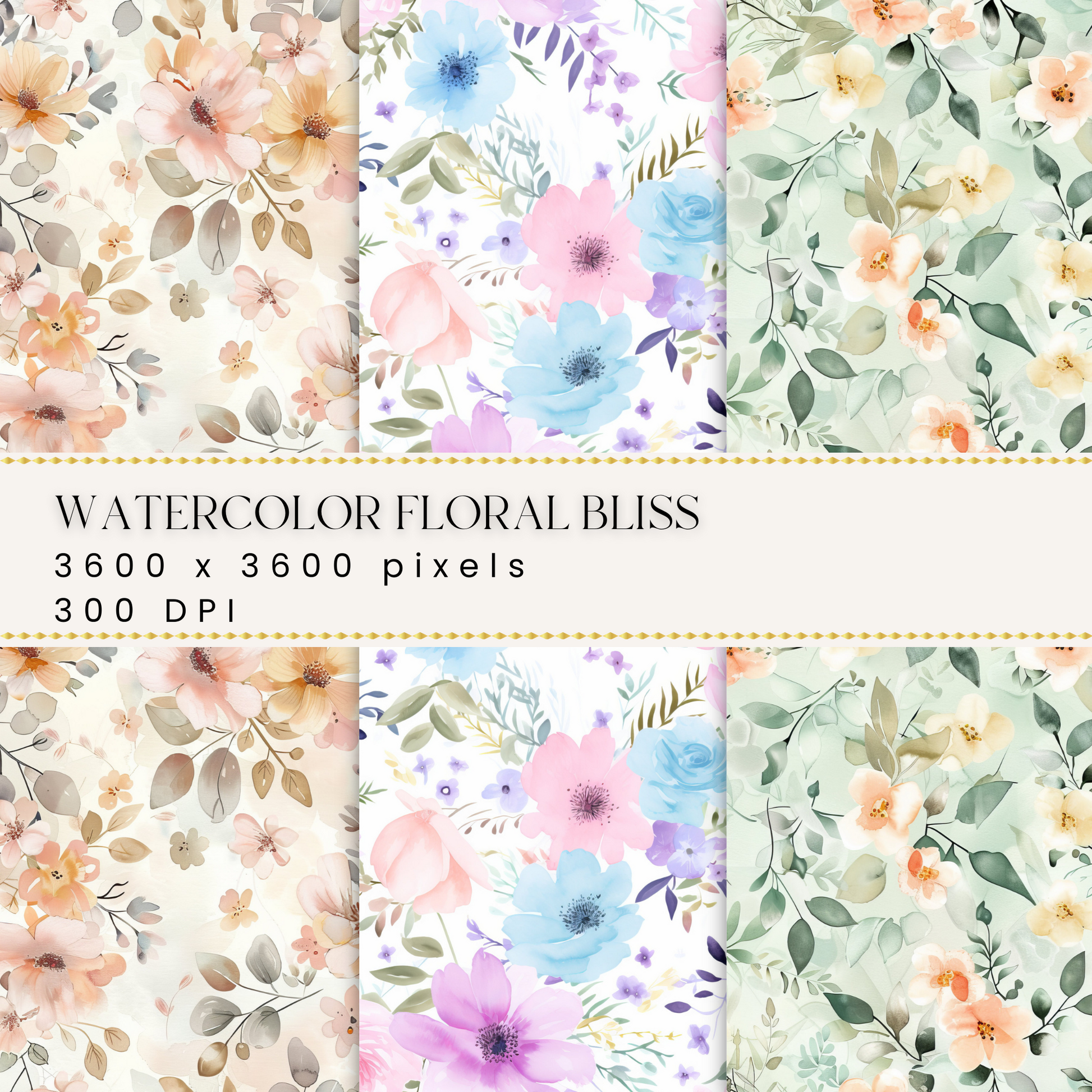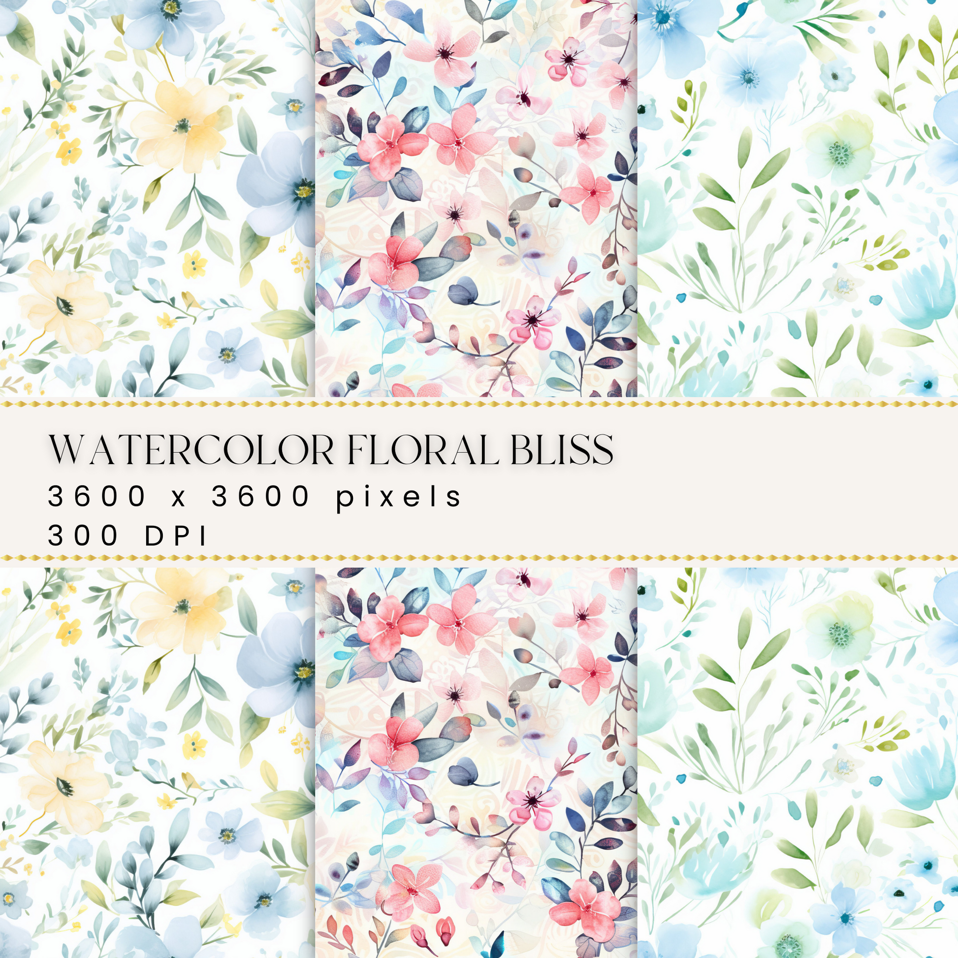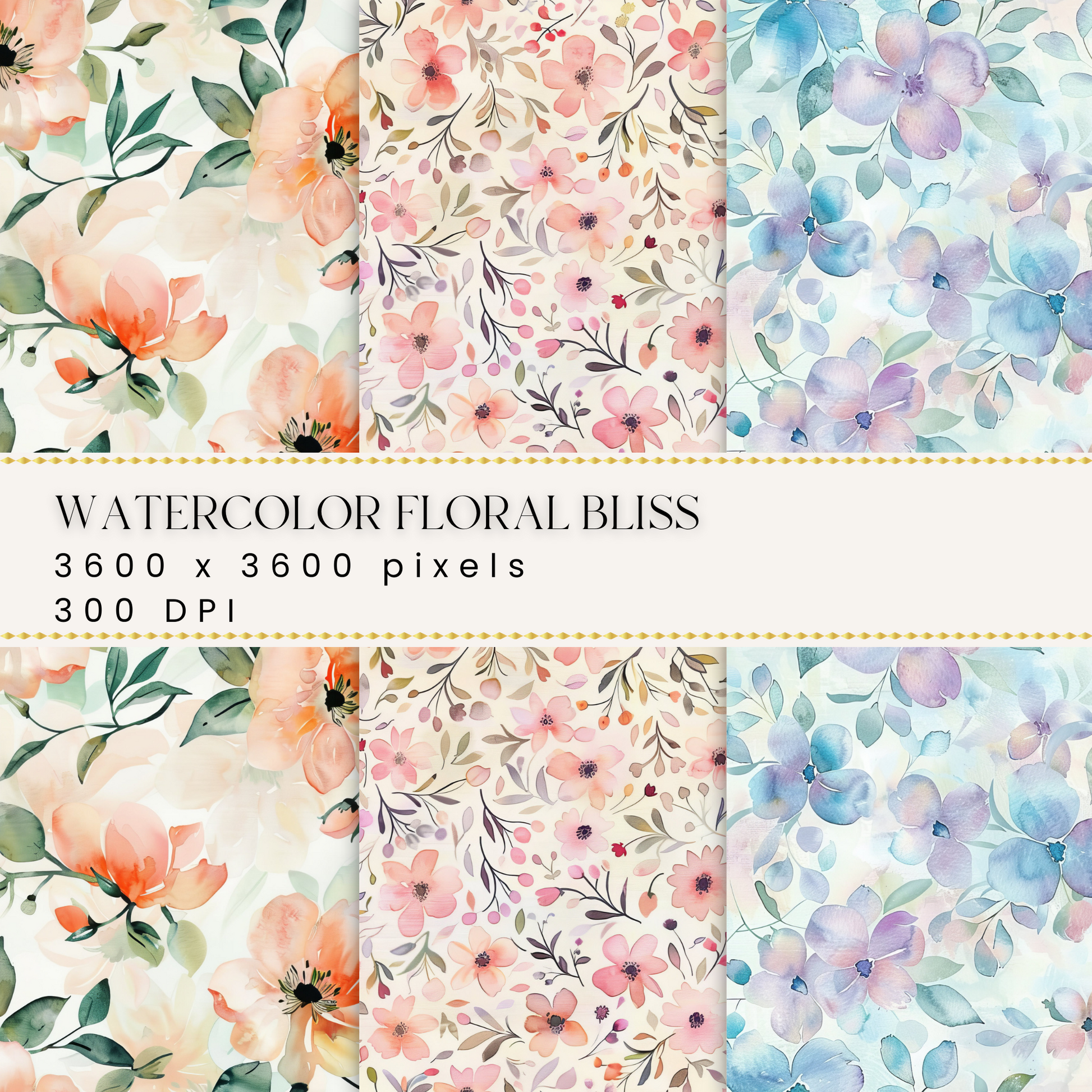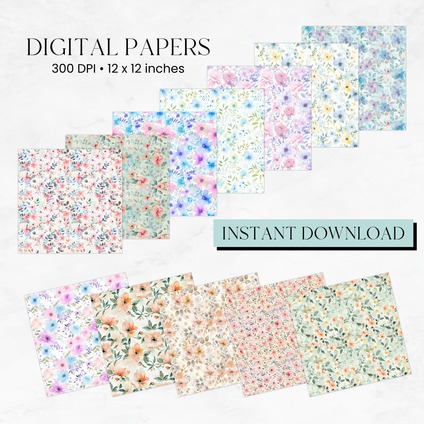 This is a beautiful set of 12 seamless Watercolor Floral Bliss digital papers. Each image measures 12" x 12" at 300 DPI resolution. Perfect for scrapbooking, digital backgrounds, invitations, journals and planners, beautiful wall art, greeting cards, logo and branding elements, engaging social media graphics and so much more!
