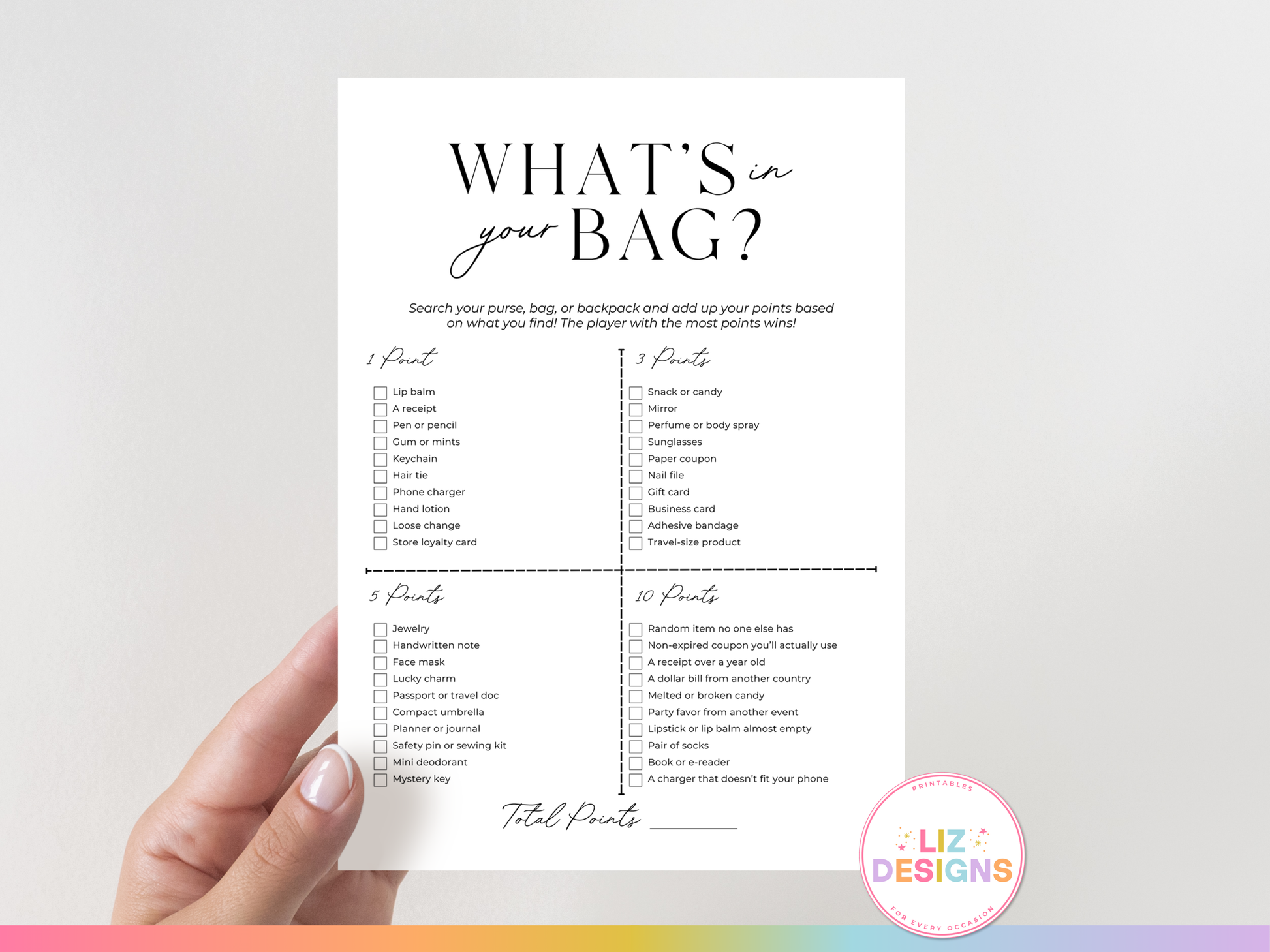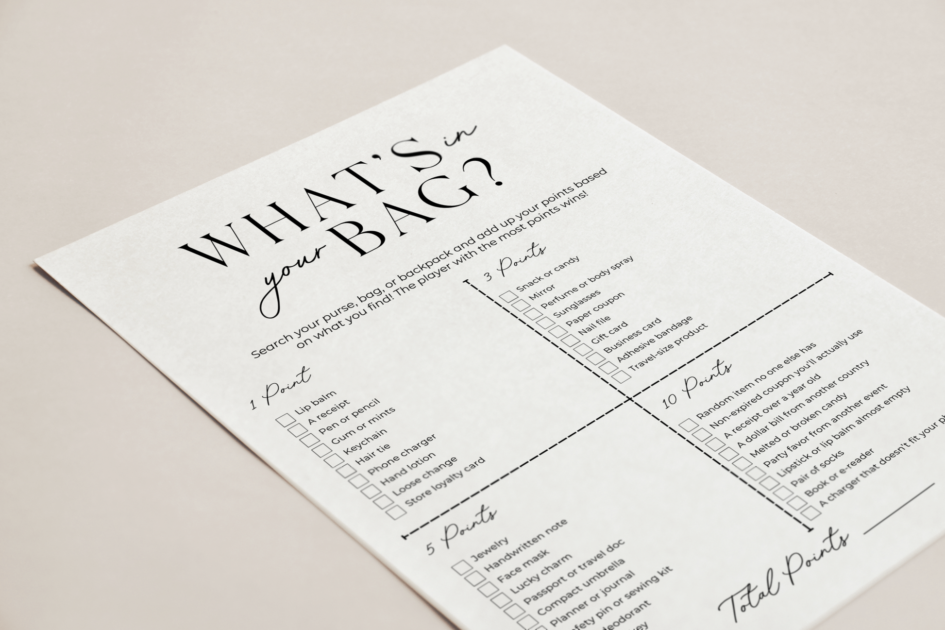 Get ready for some friendly competition with this ππππ'π ππ ππππ πππ? - ππππππππ πππππ ππππ! Search your purse, bag, or backpack and add up points based on the items you find. The guest with the most points wins!