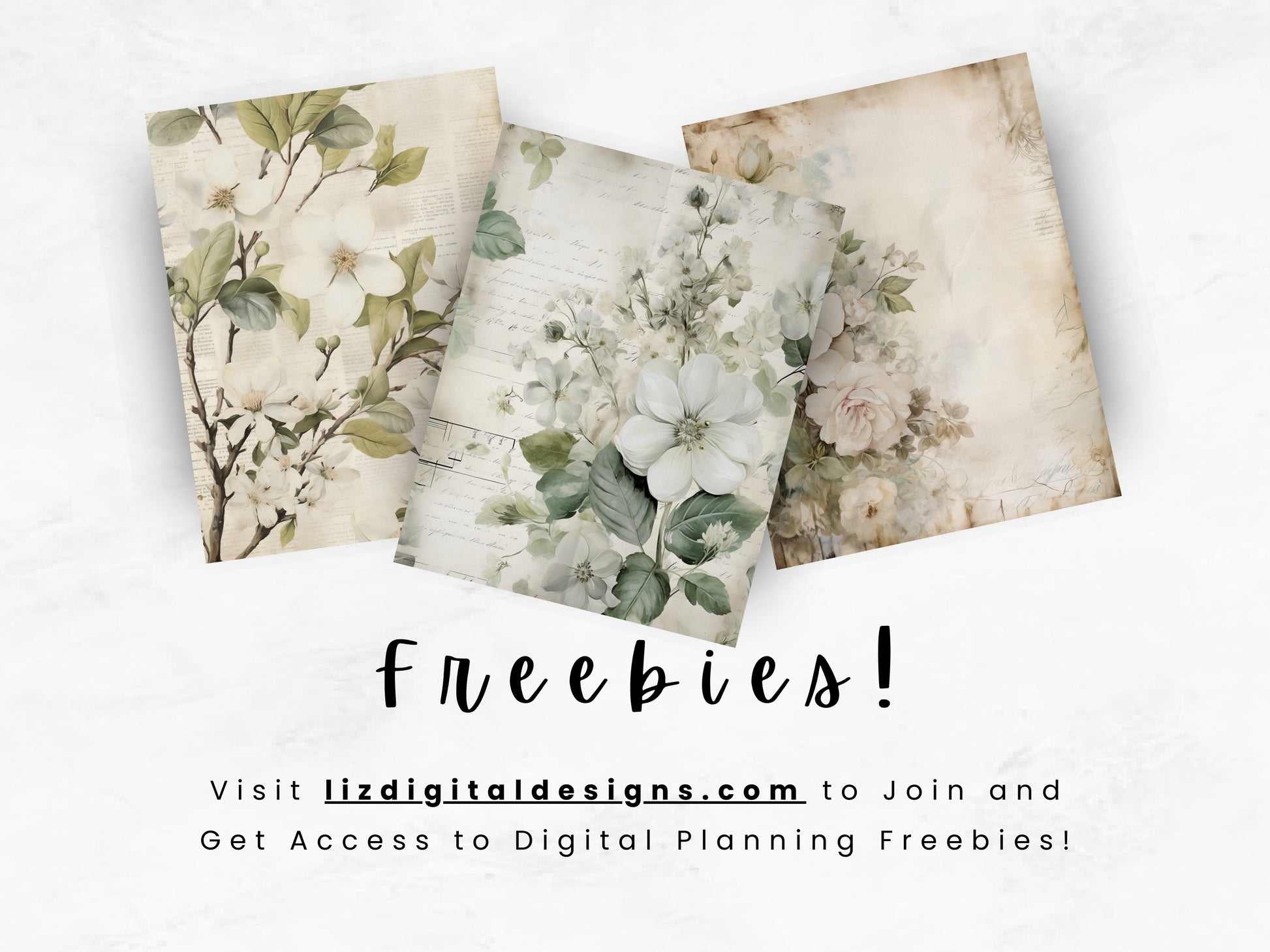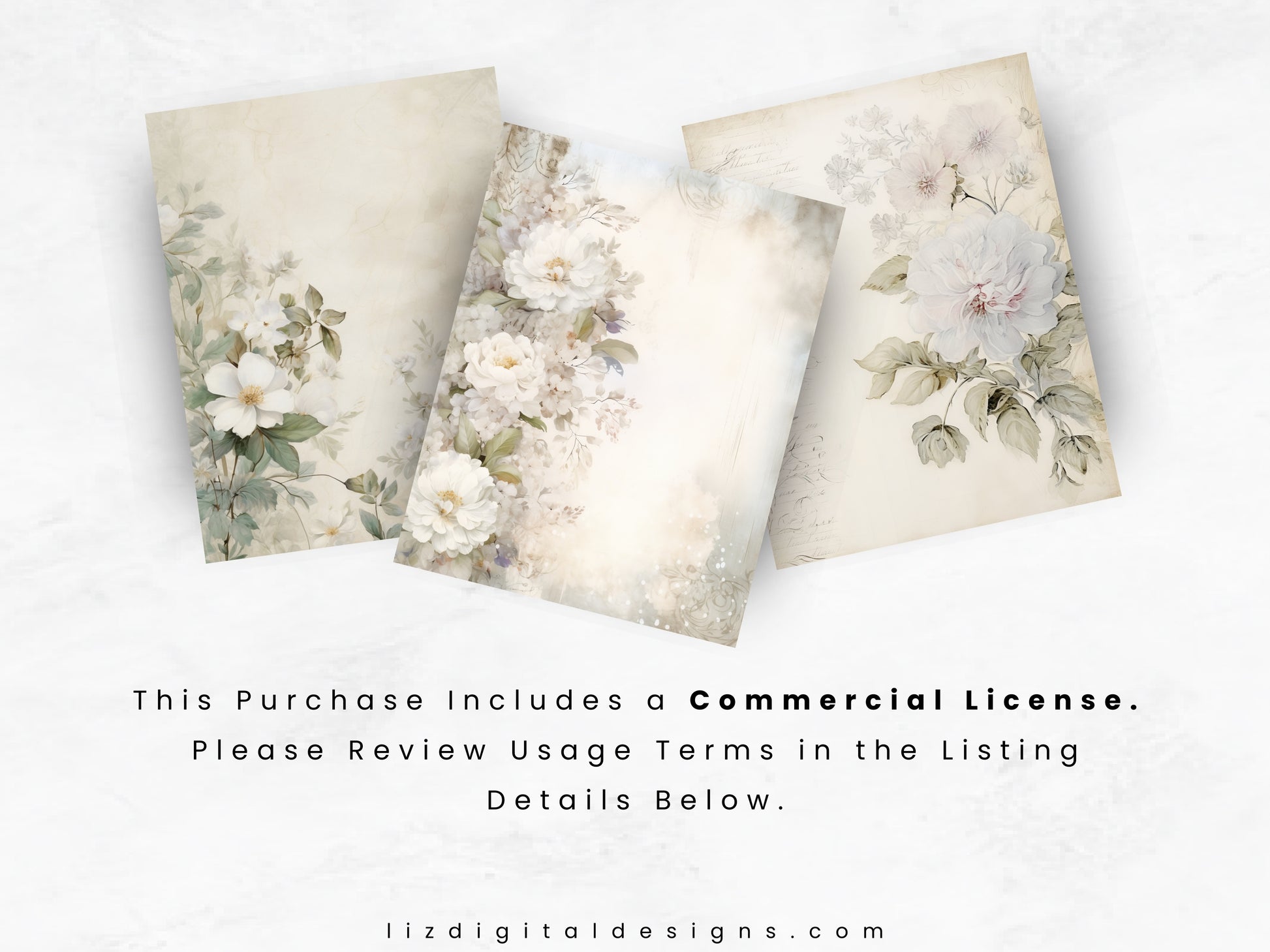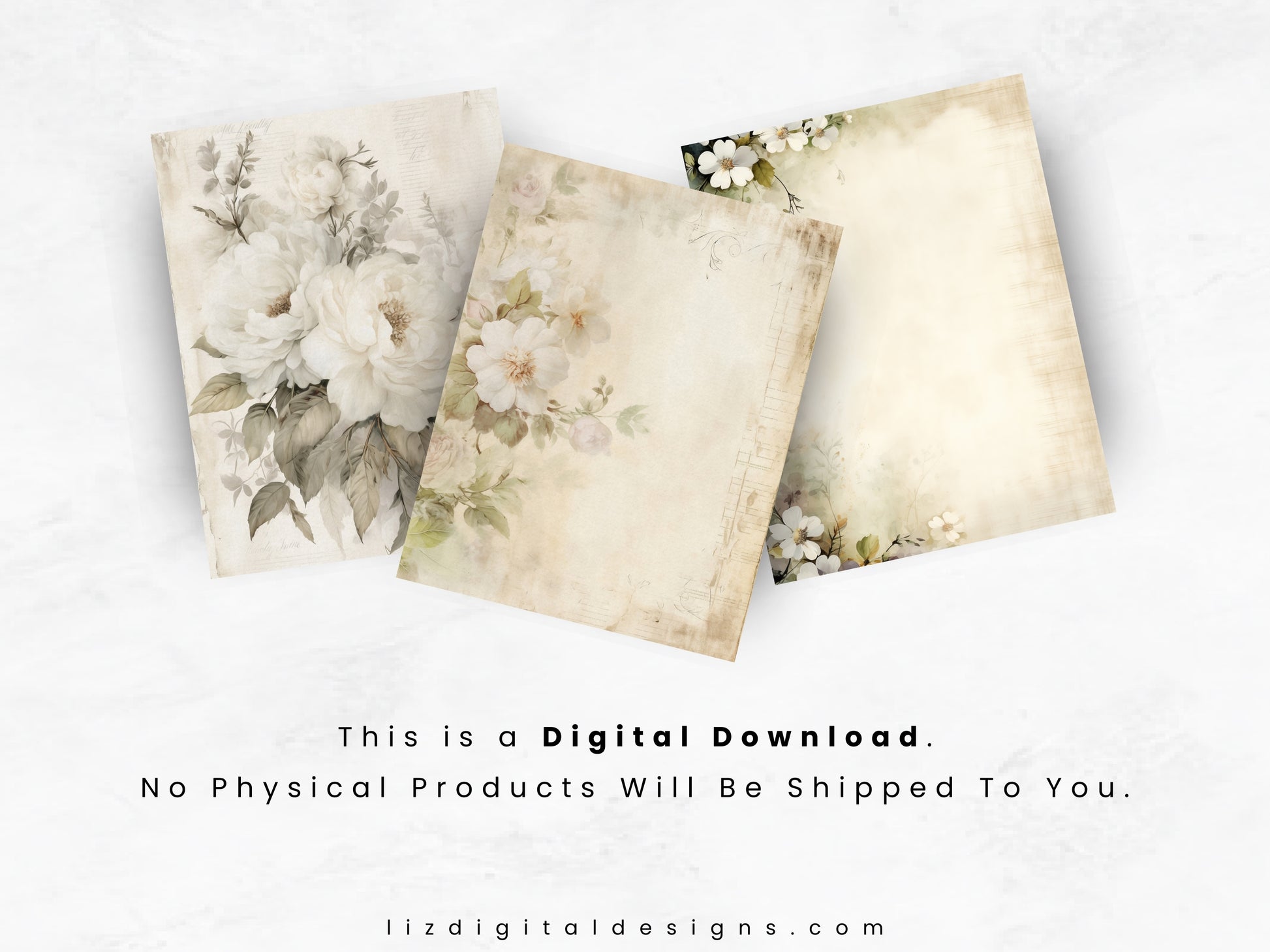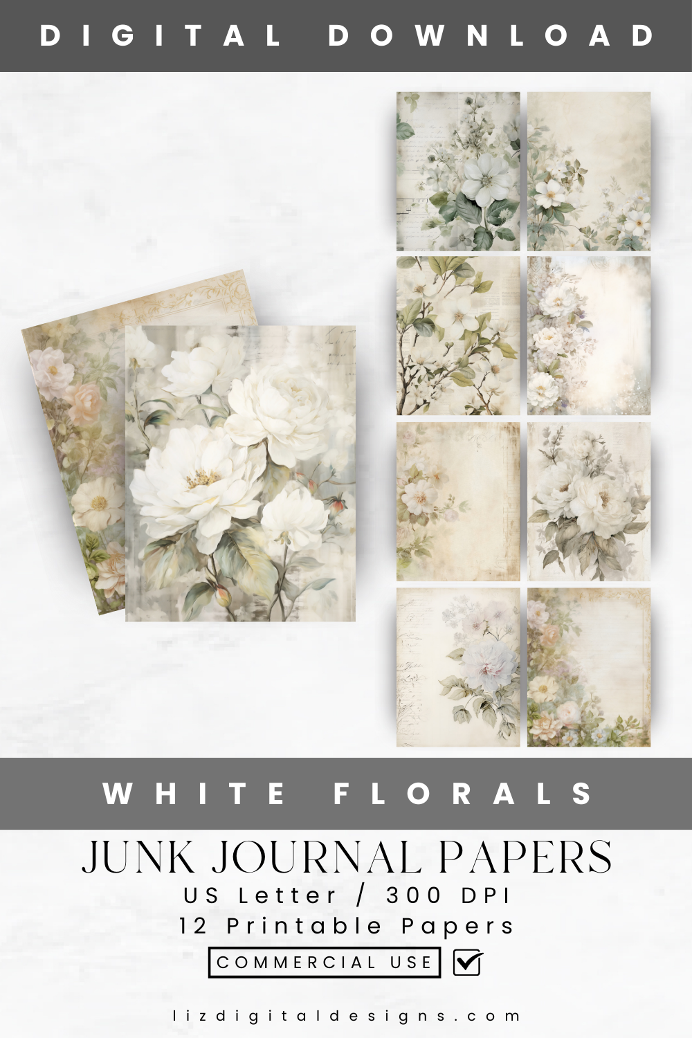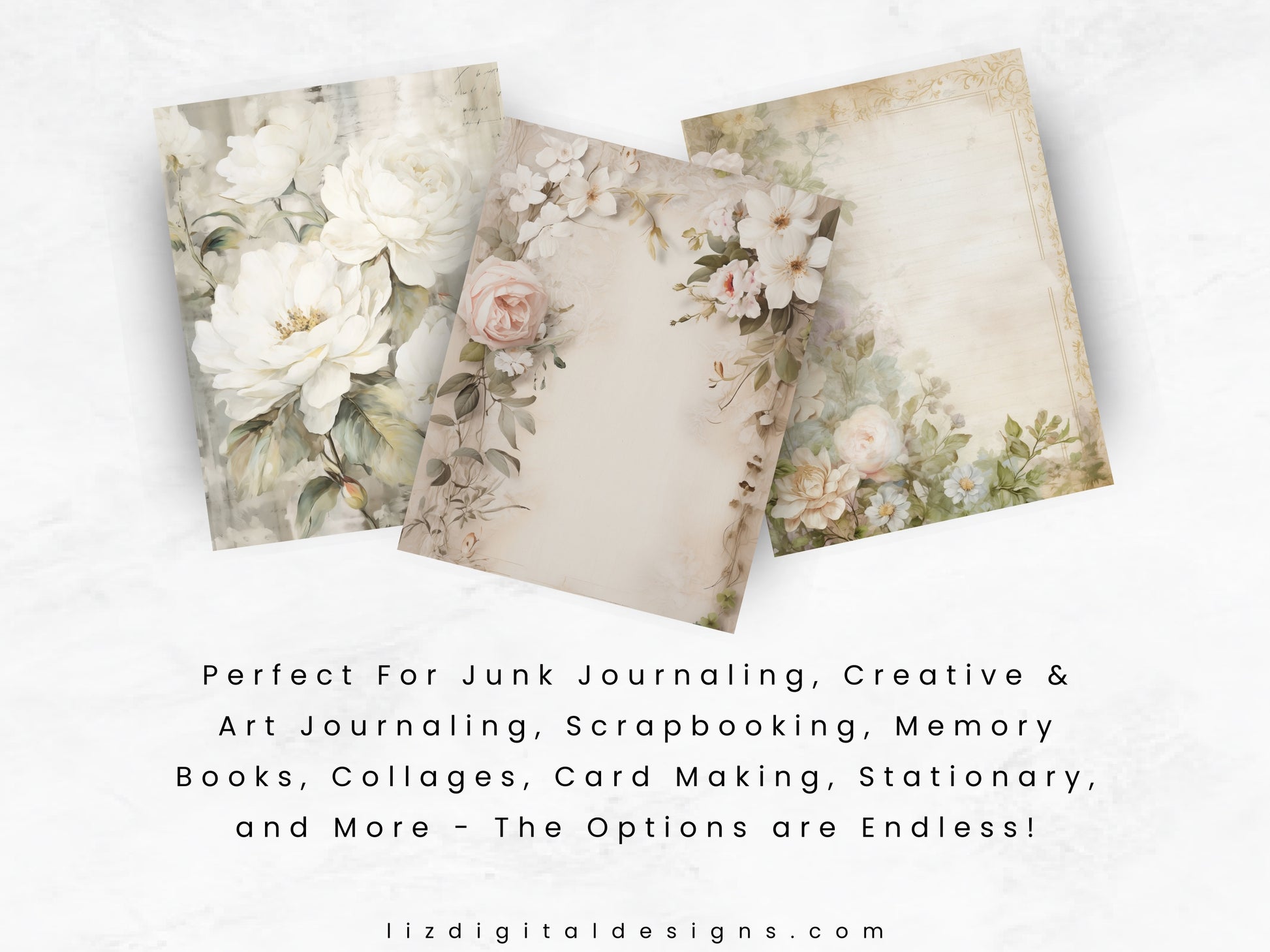 Beautiful, mix of vintage white floral digital papers with real paper textures for all of your creative needs! Whether you're a junk journal enthusiast, avid scrapbooker, or a passionate creative and art journaler, these versatile papers are designed to inspire. Use them in your collages, stationery, cards, invitations, scrapbooks, memory books, journals and planners today!