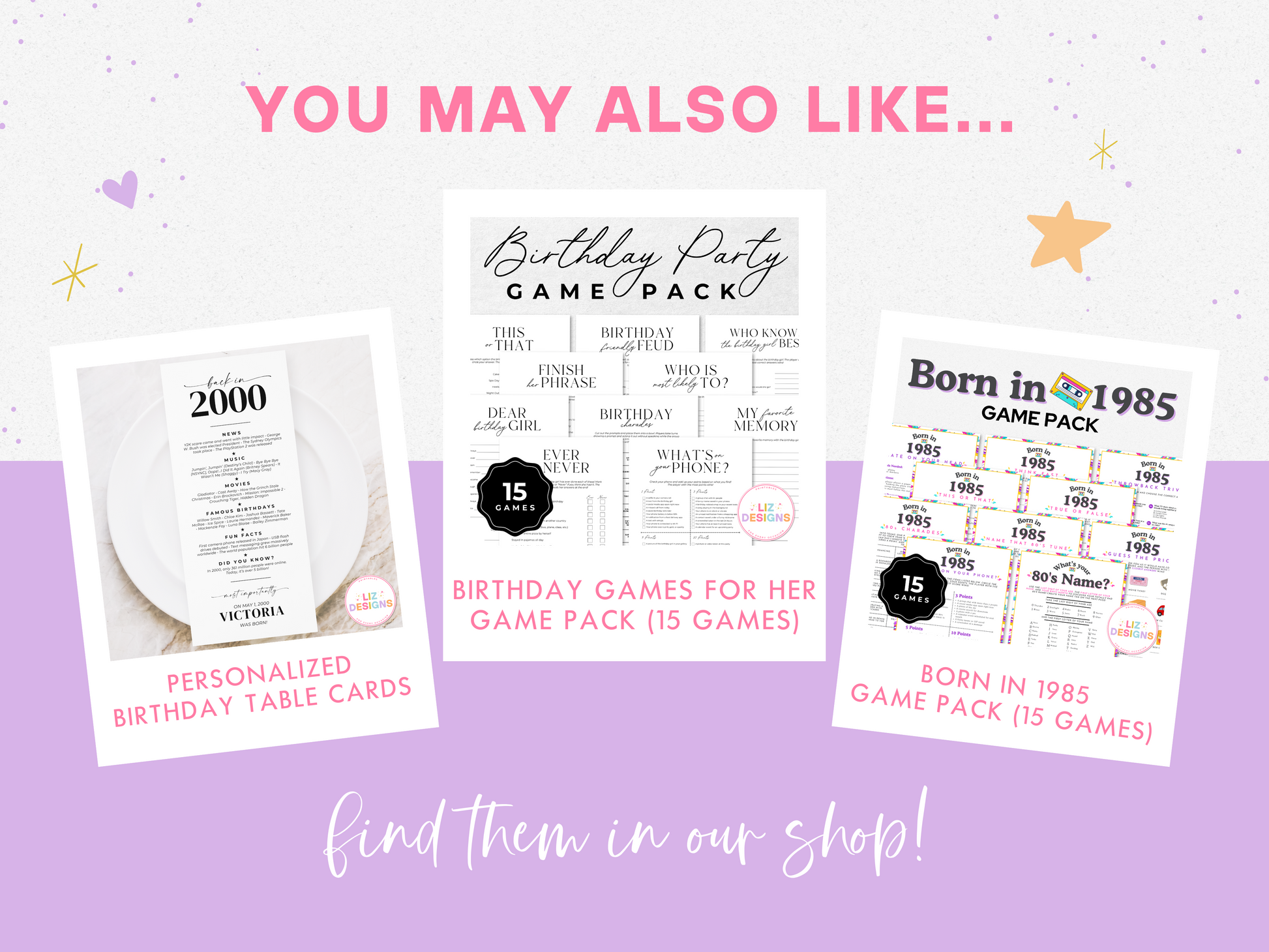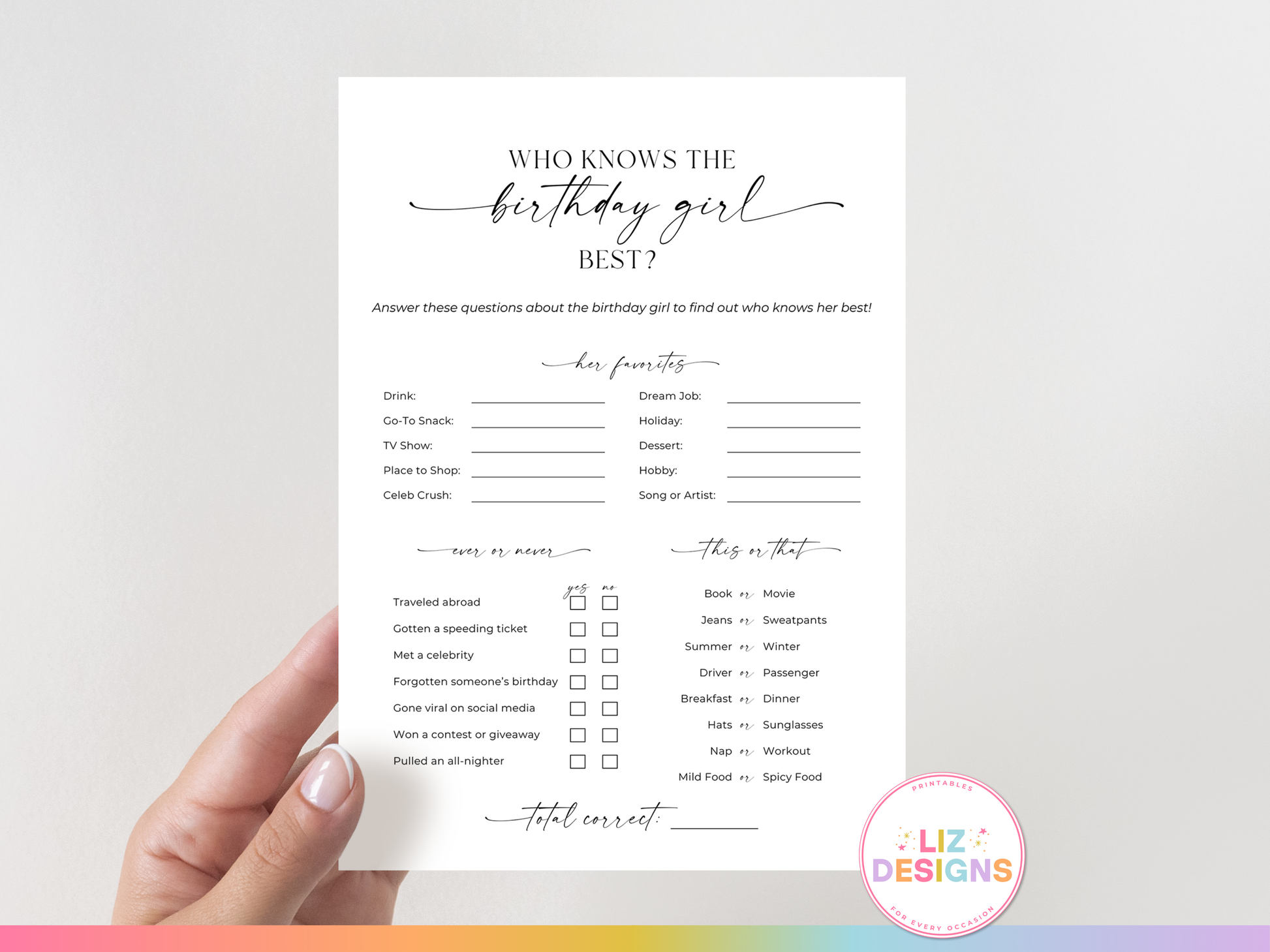Put your birthday knowledge to the test with the πππ πππππ πππ ππππππππ ππππ ππππ πππππ ππππ! How well do you really know the birthday girl?This printable party game includes a fun mix of trivia, personal favorites, and lighthearted challenges all about the birthday girl. Guests will try to guess her favorite things, past experiences, and this-or-that preferences. Itβs the ultimate birthday icebreaker β and the player with the most correct answers wins!