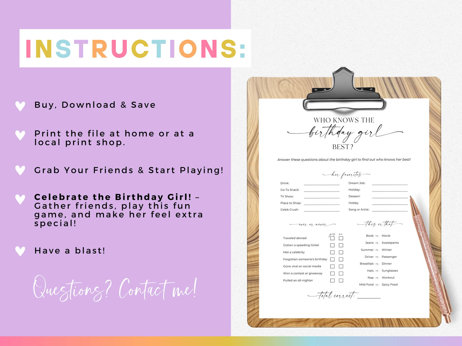 π 1 Printable "Who Knows the Birthday Girl Best" Game
