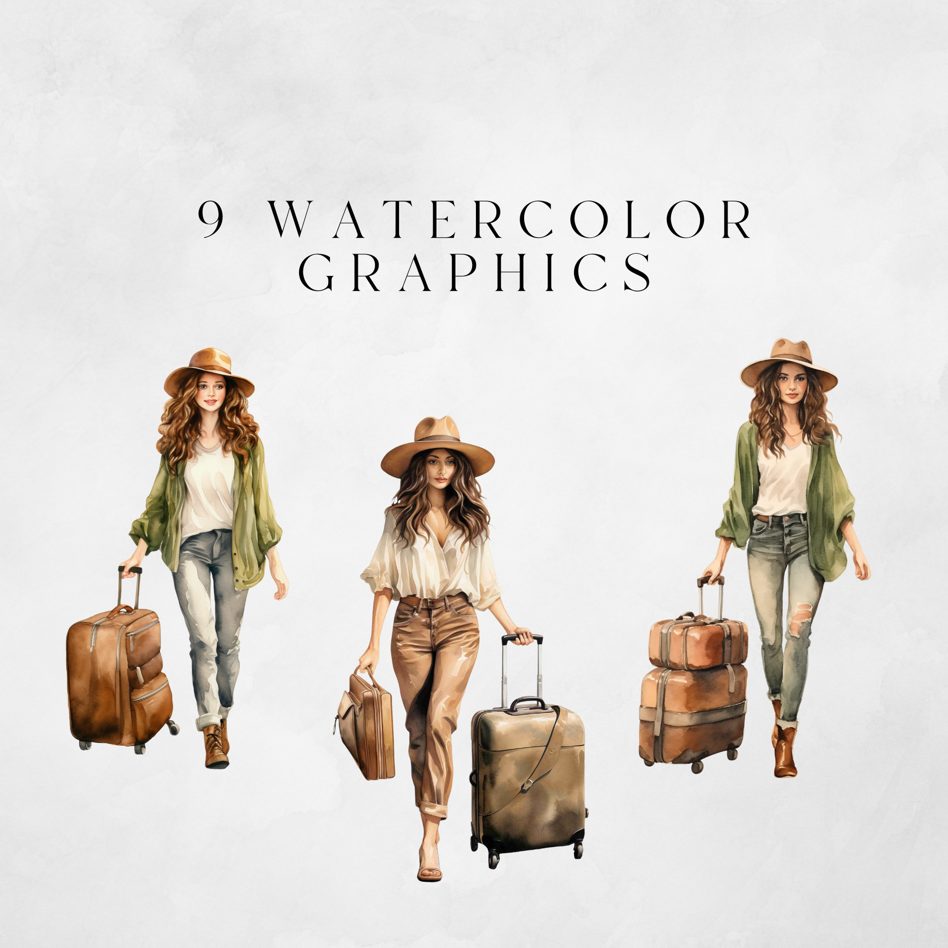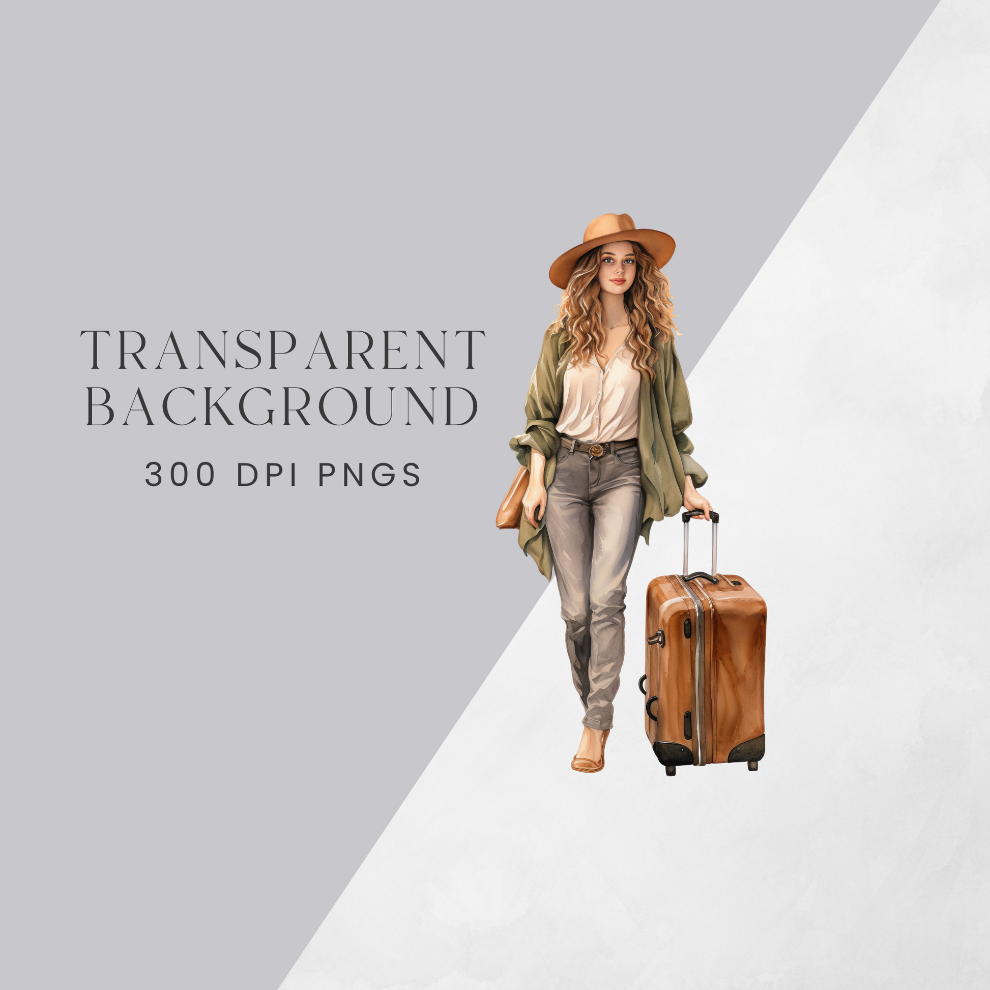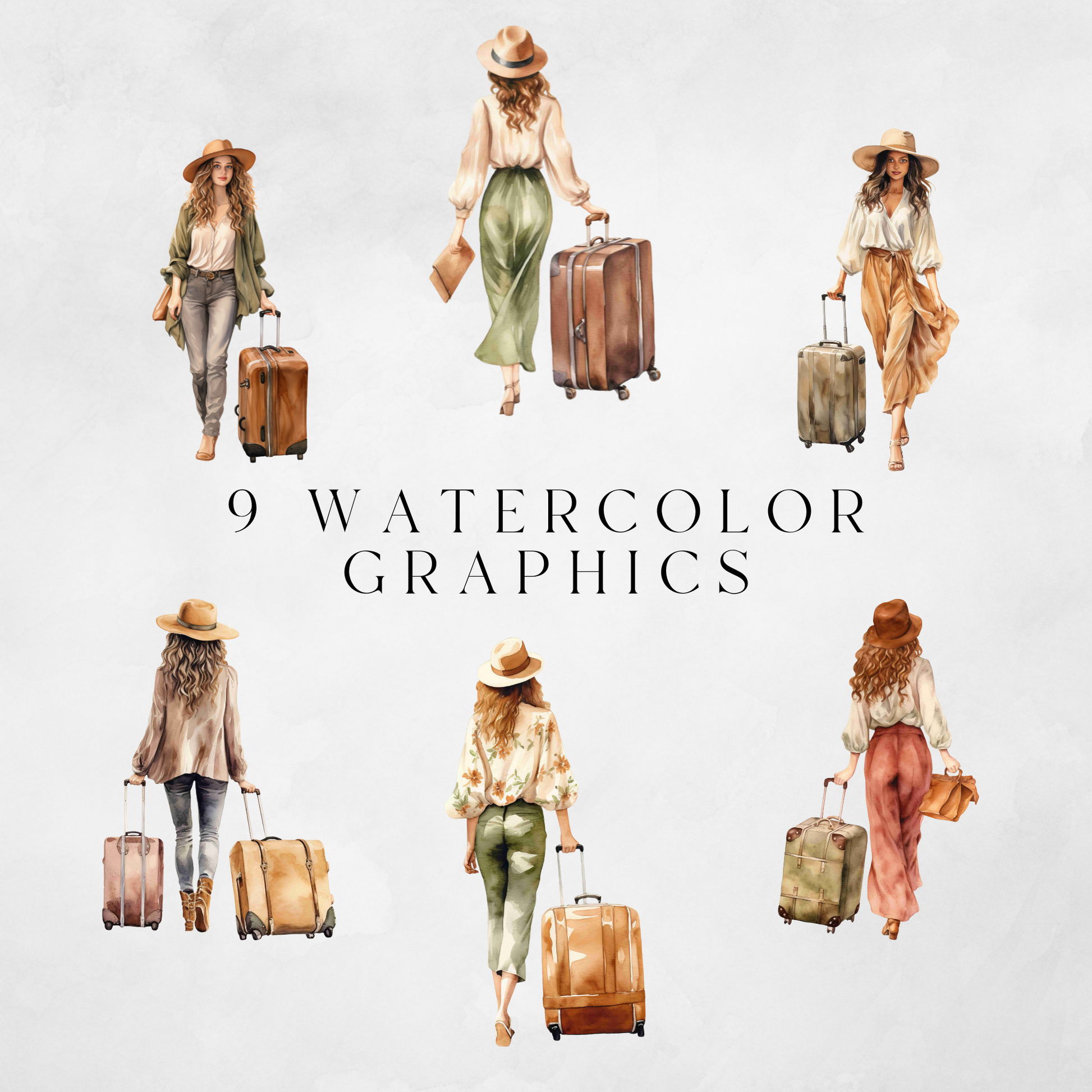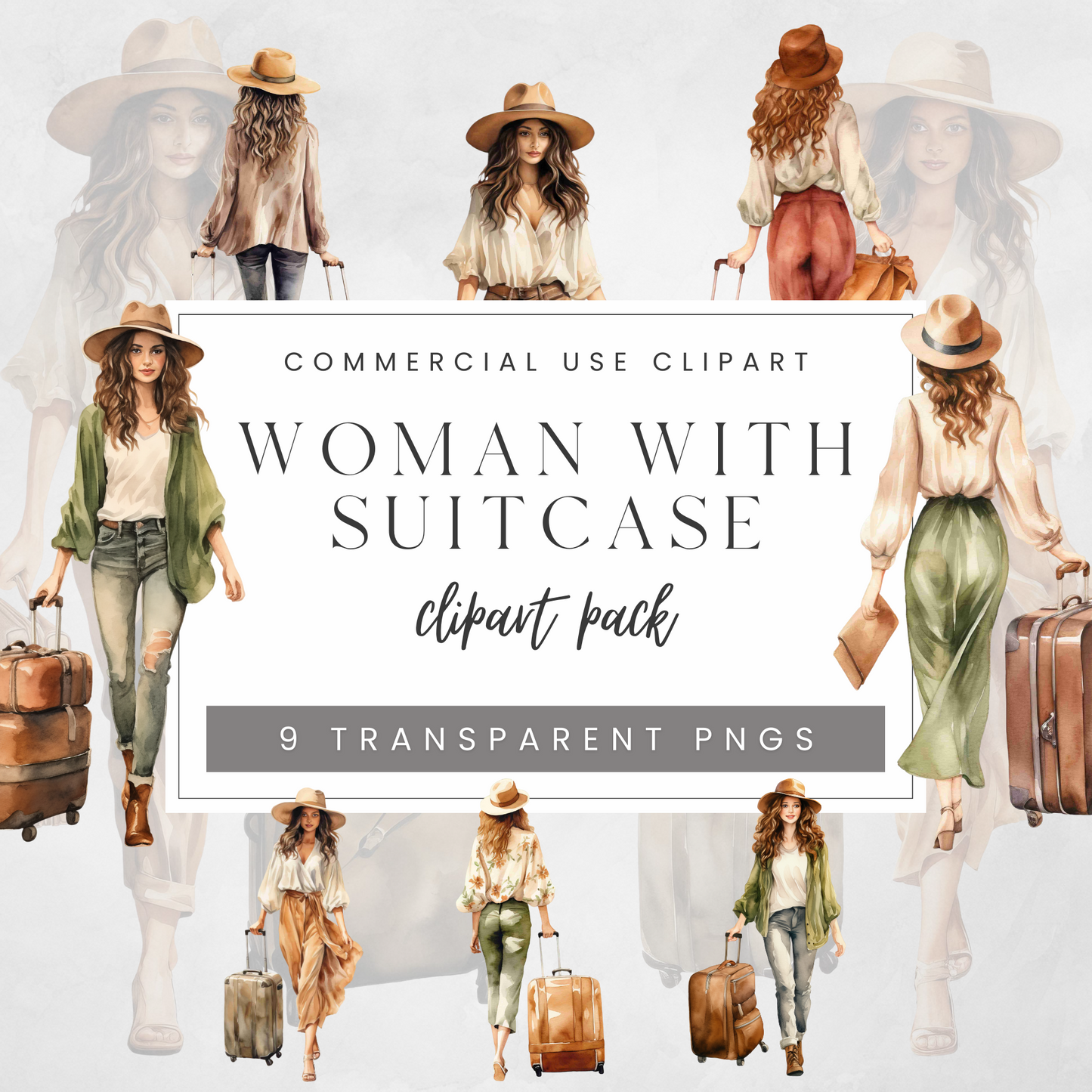 Introducing the Woman with Suitcase clipart set! Featuring captivating illustrations of a stylish woman with her trusty suitcase. Perfect for adding a touch of wanderlust to your creations!