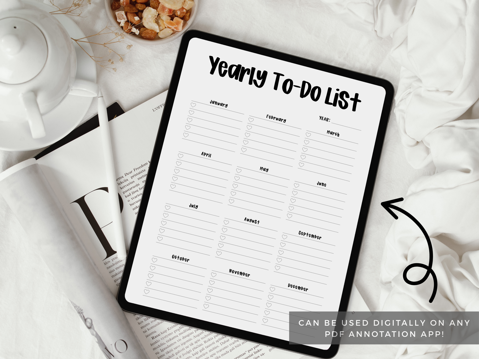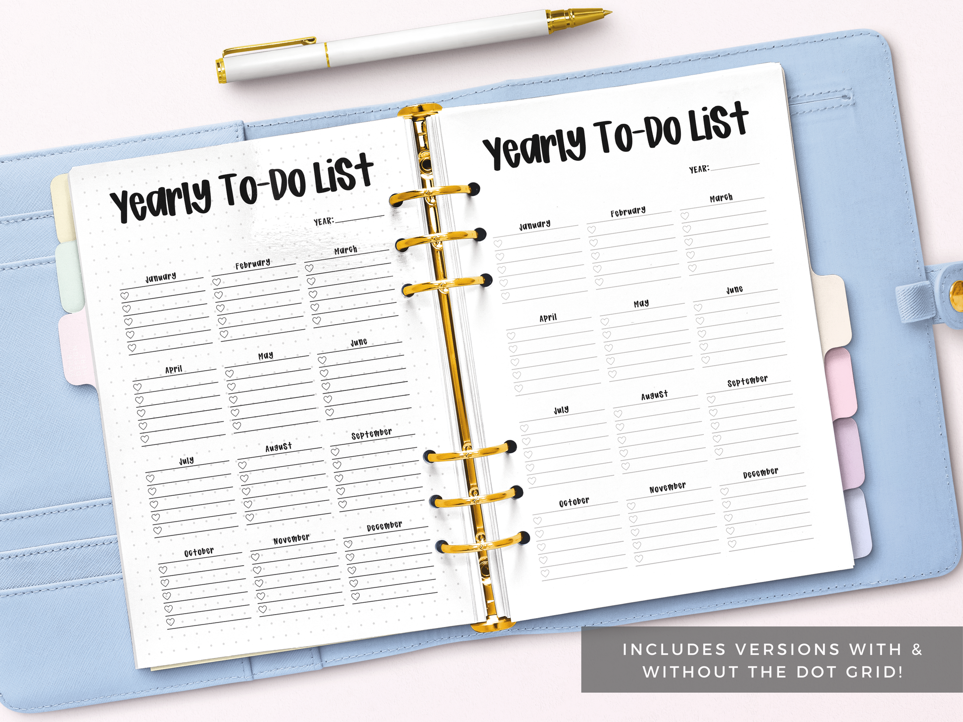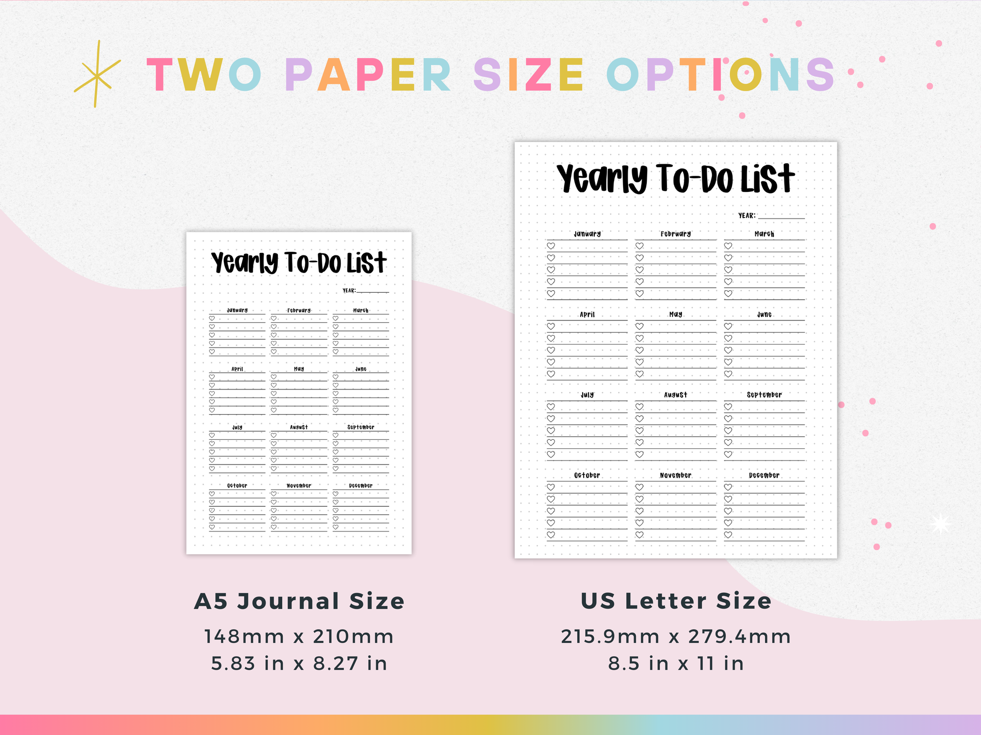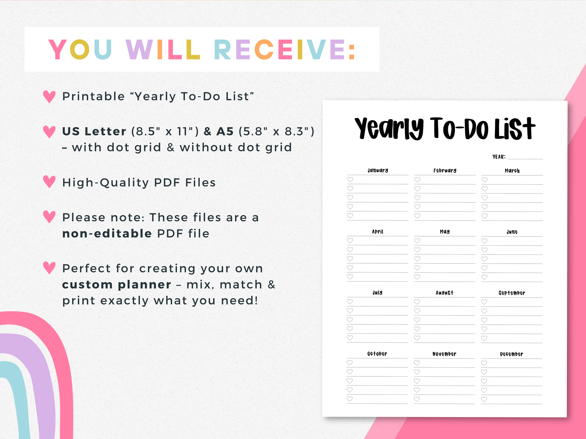 Stay organized all year long with this ππ‘πˆππ“π€ππ‹π„ π˜π„π€π‘π‹π˜ π“πŽ-πƒπŽ π‹πˆπ’π“, the perfect planner insert for tracking important dates, monthly goals, and key events at a glance. Available in both US Letter and A5 planner size, this yearly overview is designed to fit seamlessly into your binder, journal, or productivity planner.